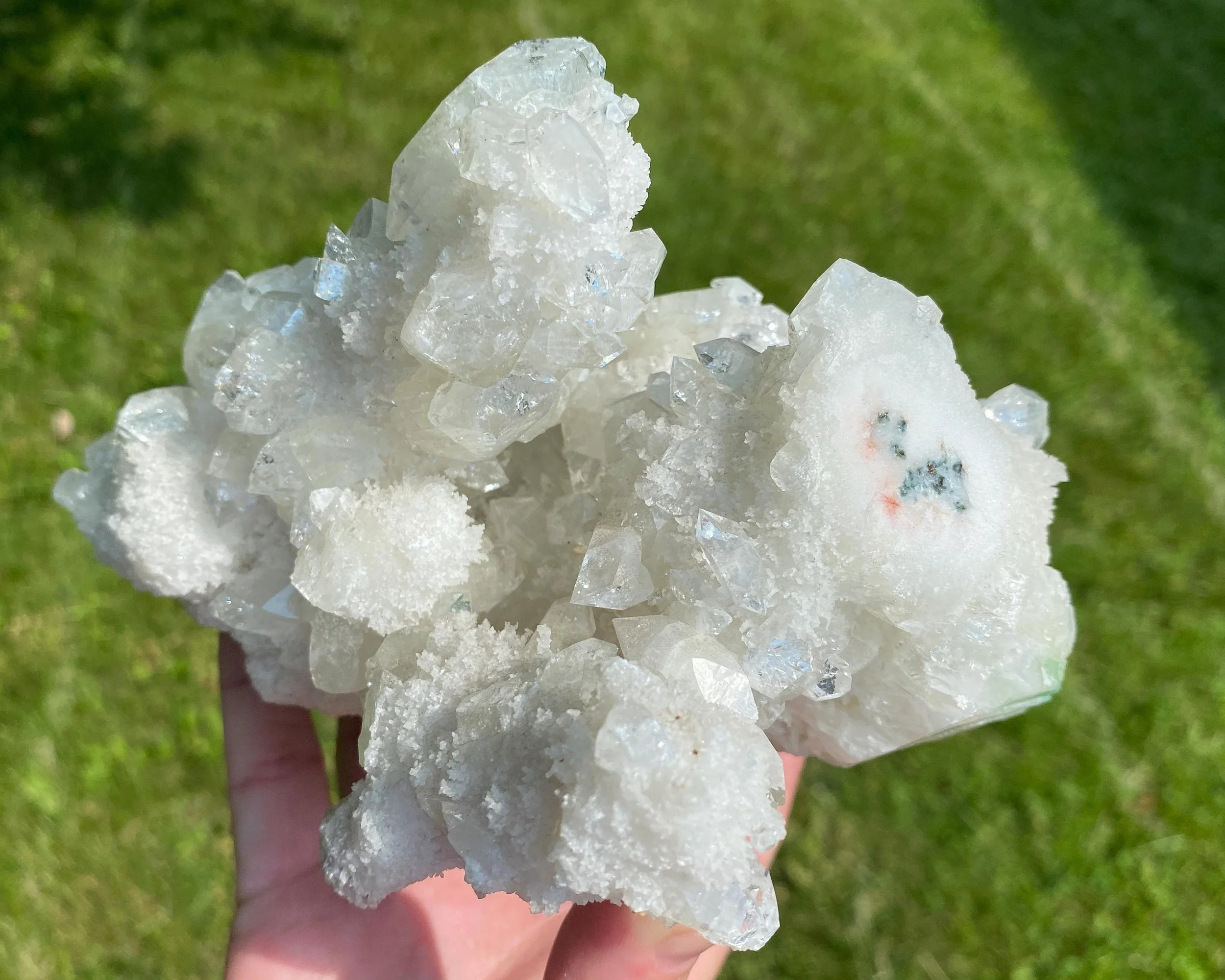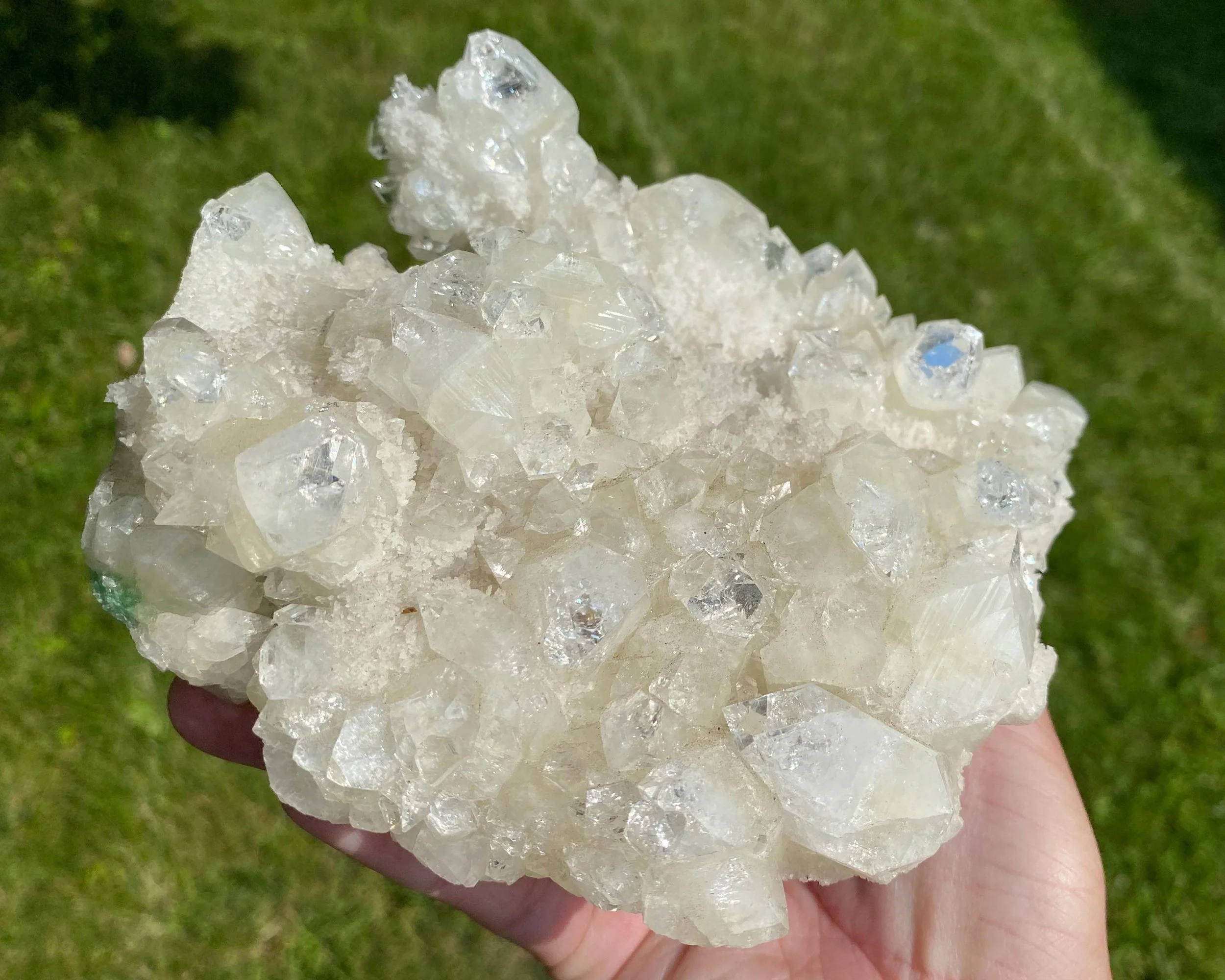 This is a large cluster of pointed, clear Apophyllite crystals on druzy Chalcedony. The Apophyllite crystals are lustrous, beautiful mirrorAppophyllites, with lots of double terminated crystals and even some green Apophyllite. Underneath is druzy Chalcedony stalactites with a really funky texture too. It sits nicely for display and is cool looking from any angle.