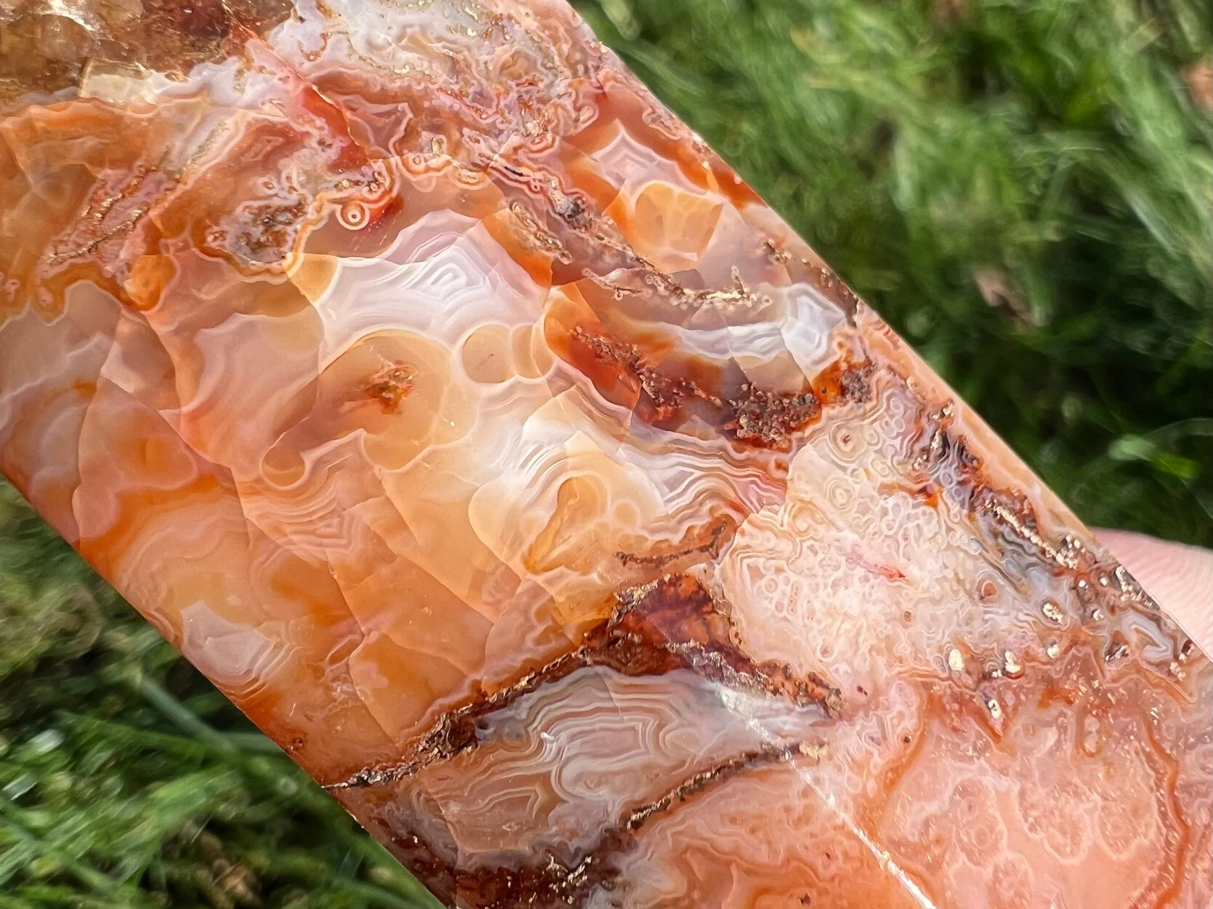 This is a Carnelian Agate tower, a self standing polished point with beautiful coloring of banded reds, oranges and whites. This one has open areas and lots of intricate, beautiful banding and agate 'eyes' all over. This is a very cool tower with very nice patterns and even a little druzy Quartz.