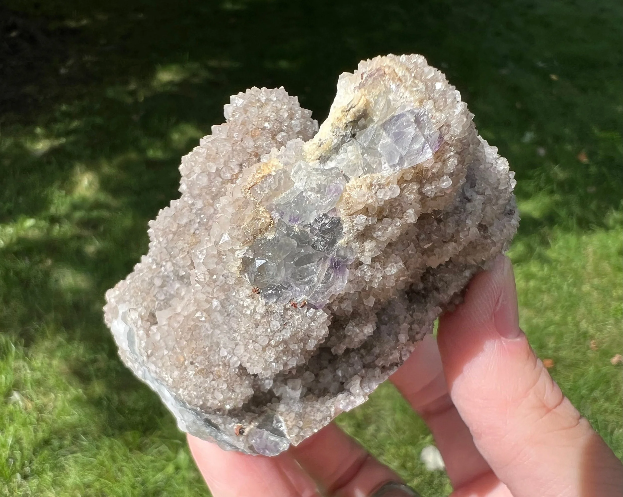 This is a beautiful specimen of Fluorite crystals that are both blue and purple, in sparkling white druzy Quartz. The colors are super pretty together and the contrast against the glittering white is awesome :) This piece is double sided, and self standing. It has a flat-cut bottom it stands on and then there are two sides you can display, both with Fluorite crystals on druzy Quartz. One side is a brighter white and the other is more grey. Both are very sparkly! :)