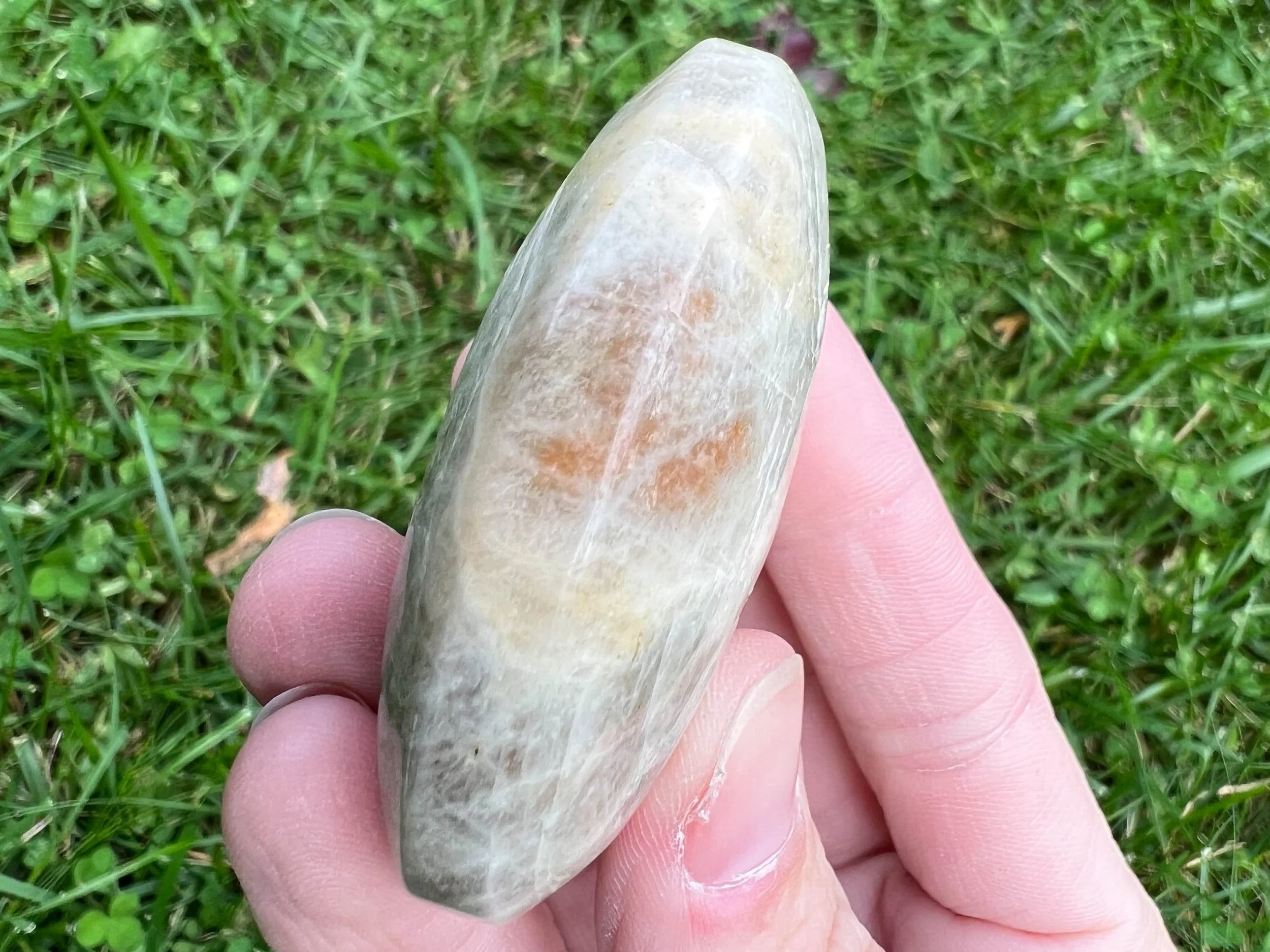 This is a beautiful combination of Moonstone with blue flash and sunstone with sparkly rainbow "confetti" schiller which is shiny little plates of Hematite inclusions. It is also called Belomorite. It is from Russia. Carved and polished into a lovely palm stone. It has some natural small pits and imperfections in it, but nothing broken.