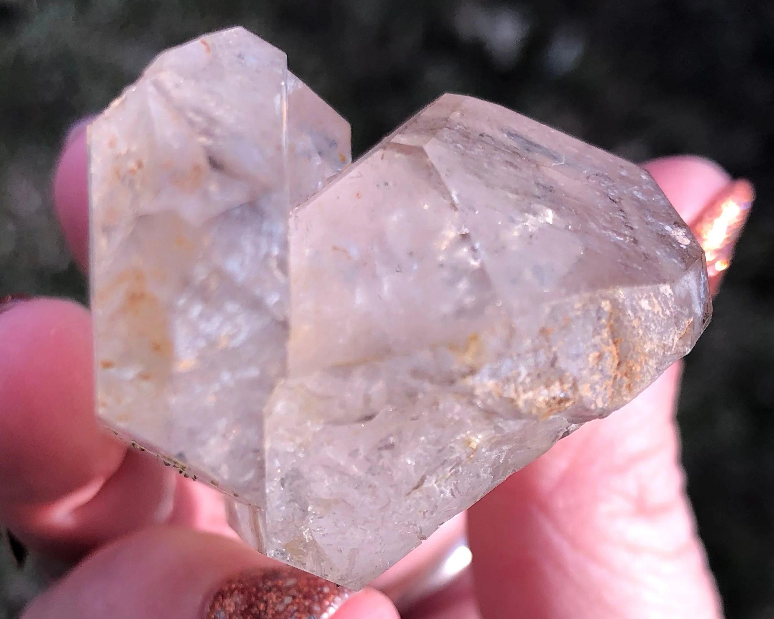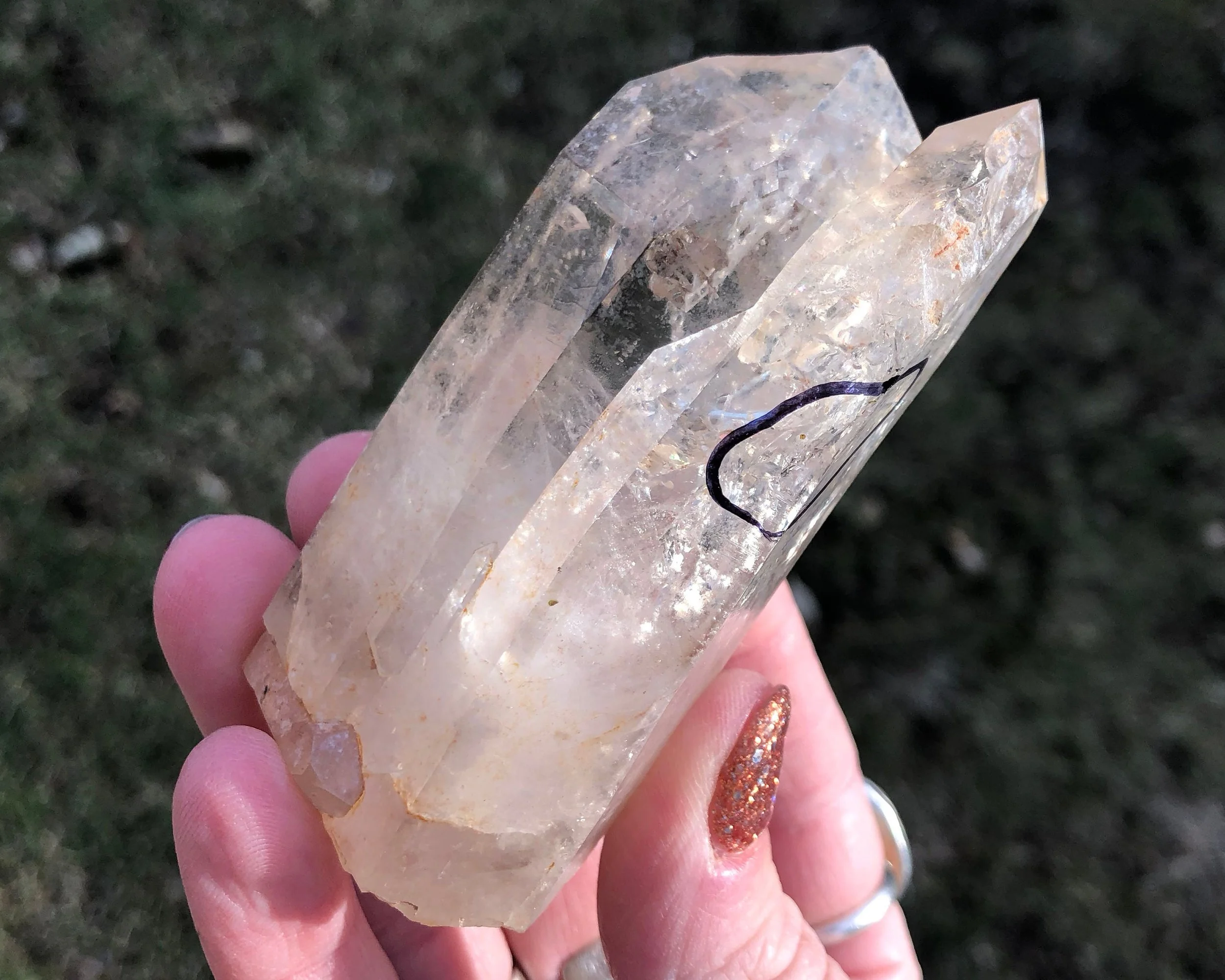 This is clear, twin Quartz crystal from the Brandberg area of Namibia that has an easy-to-see moving bubble in liquid inside. There’s also a piece of black carbon sediment inside that moved around in another spot without liquid. It has bright rainbows that are wonderful but don't show up as well in photos. Theres a third little crystal near the bottom too :)