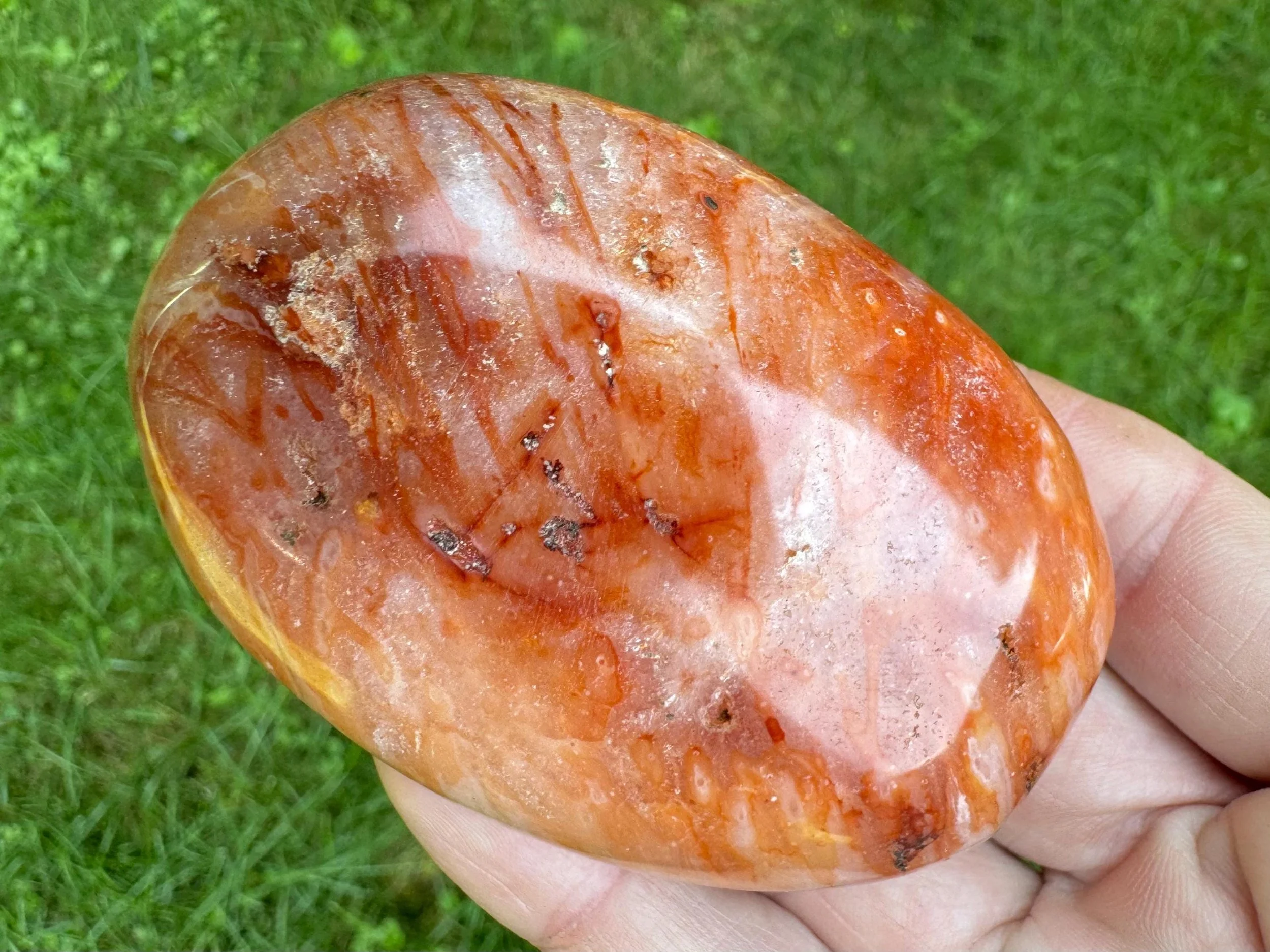 This is a large beautiful Carnelian Agate palm stone with bright reds, mostly oranges, whites and clear crystallized Quartz. Some of the Quartz is sparkly too. It has really funky unique patterns made by formations in the stone. It is polished and natural stone.