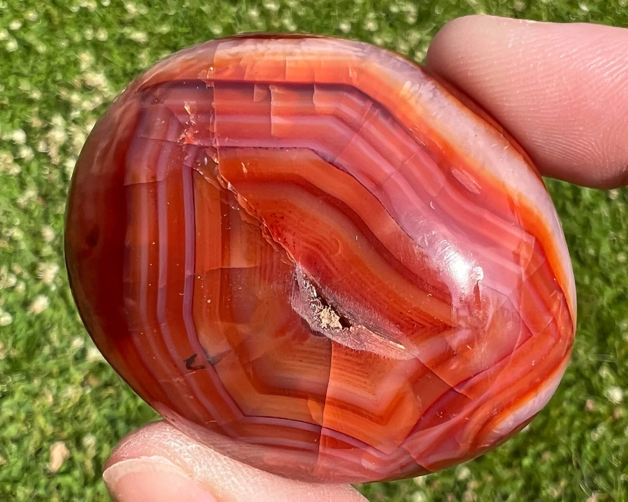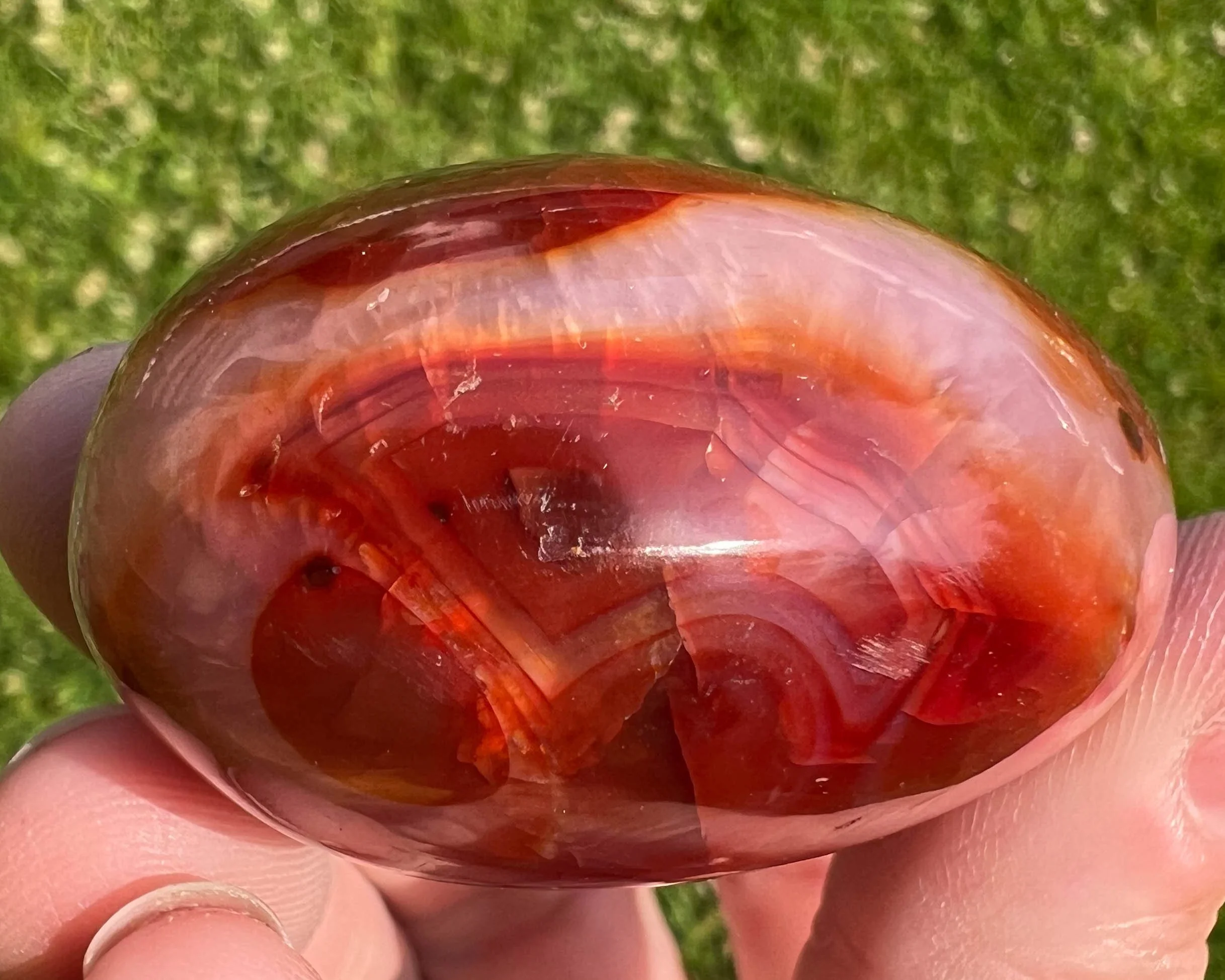 This is a beautiful Carnelian Agate palm stone with a little tiny pocket of druzy Quartz crystals surrounded by banded reds, orange and translucent white. It also has some Agate 'eyes.' It is polished and natural stone.