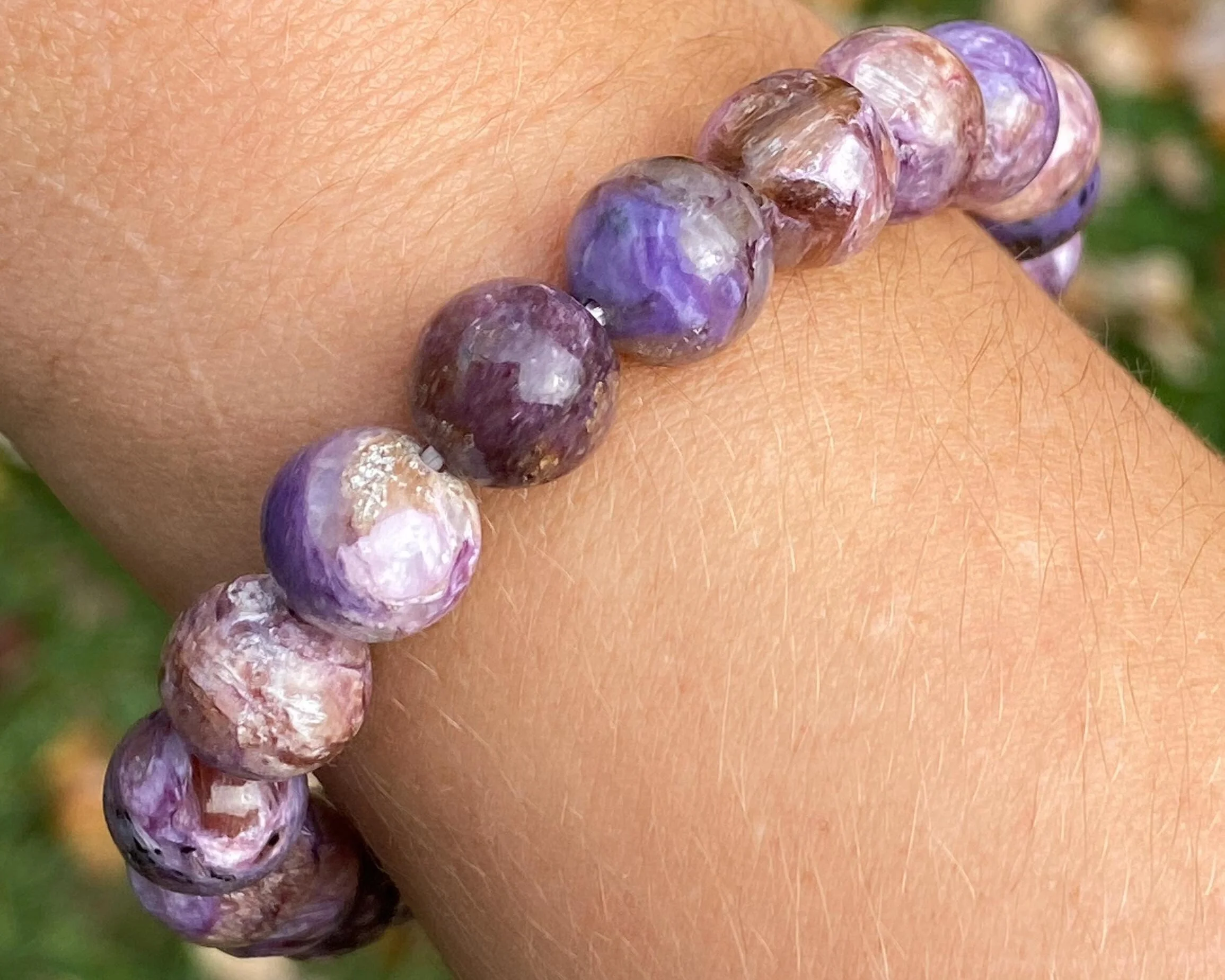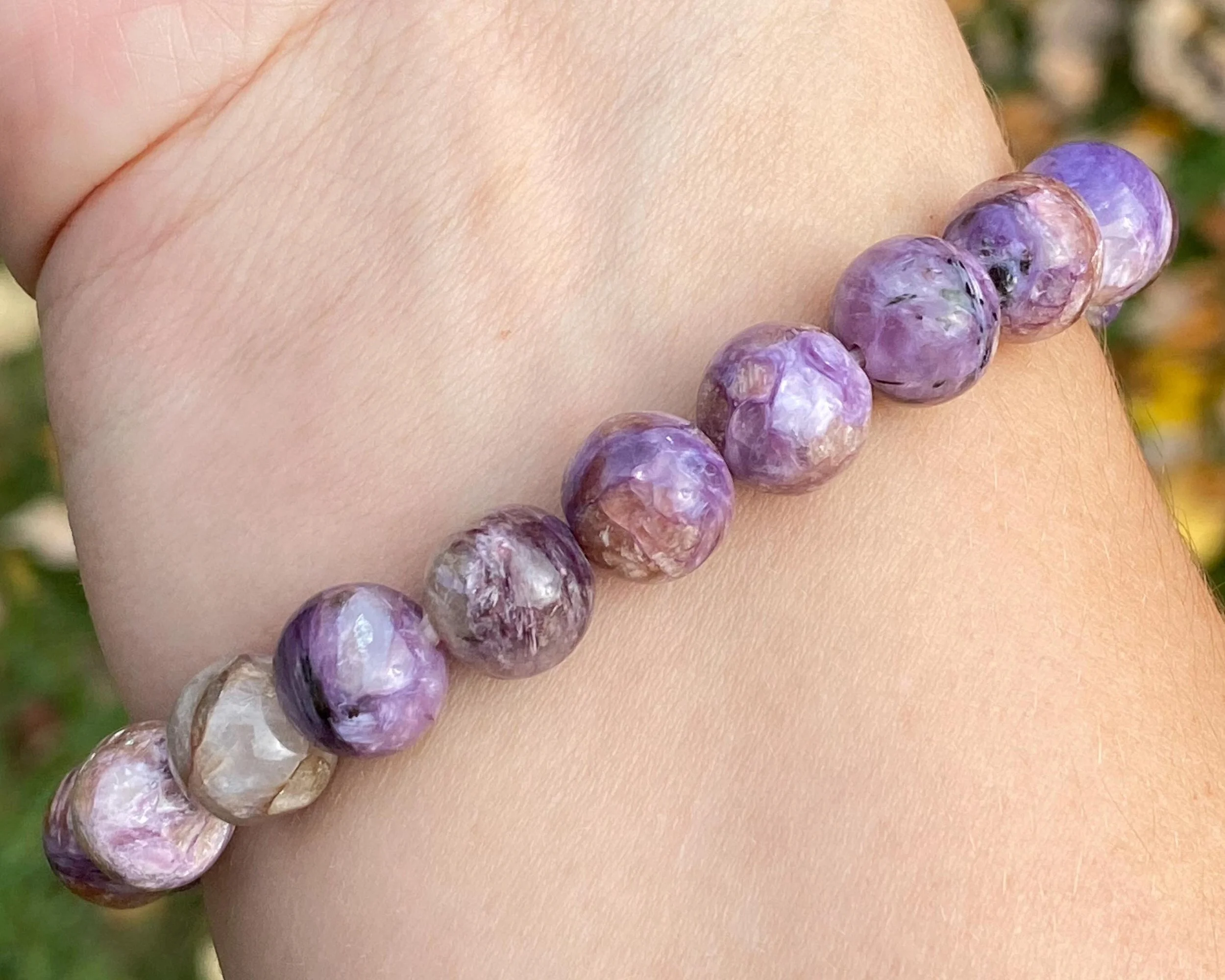 This beautiful chatoyant bracelet is stretchy and made of 10mm round purple Charoite beads on stretchy string. They measure about 7.5 inches long in the inside with no clasp or opening for easy on and off!