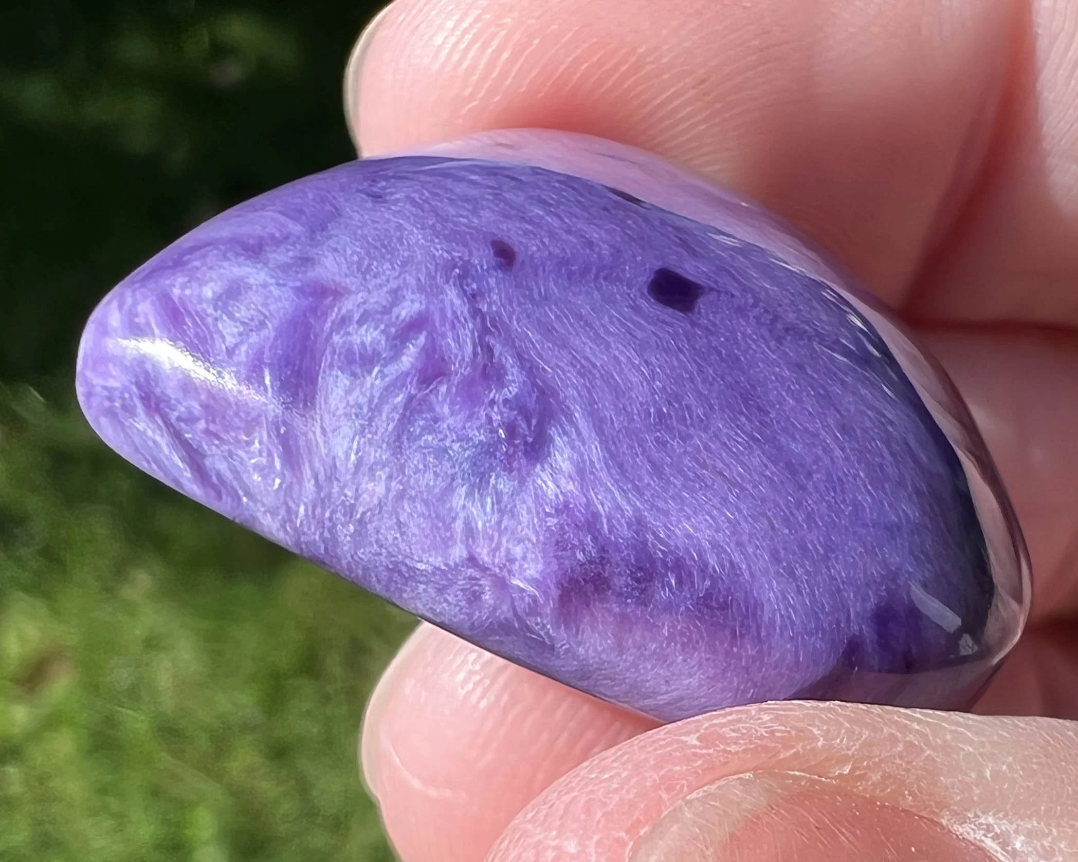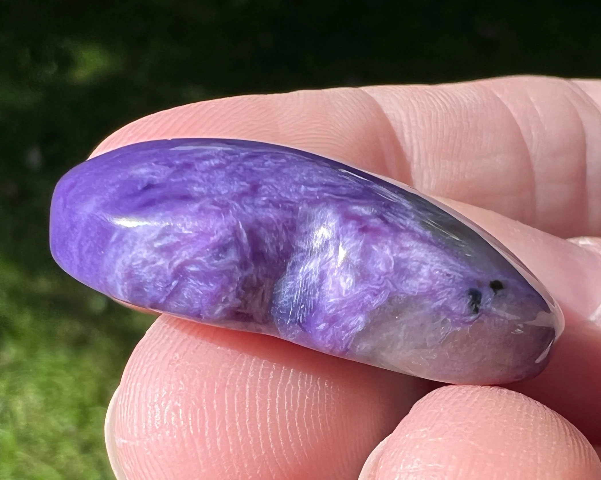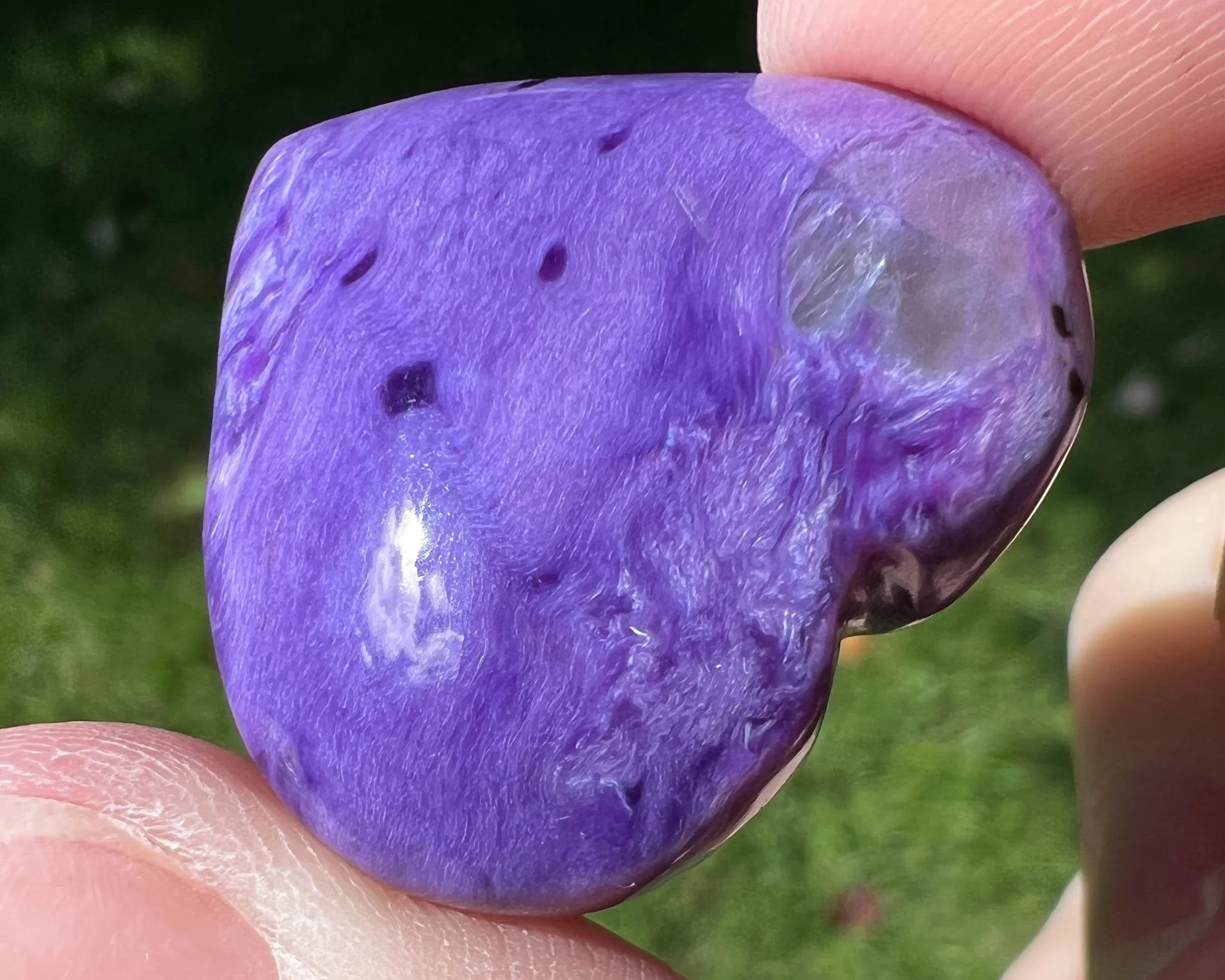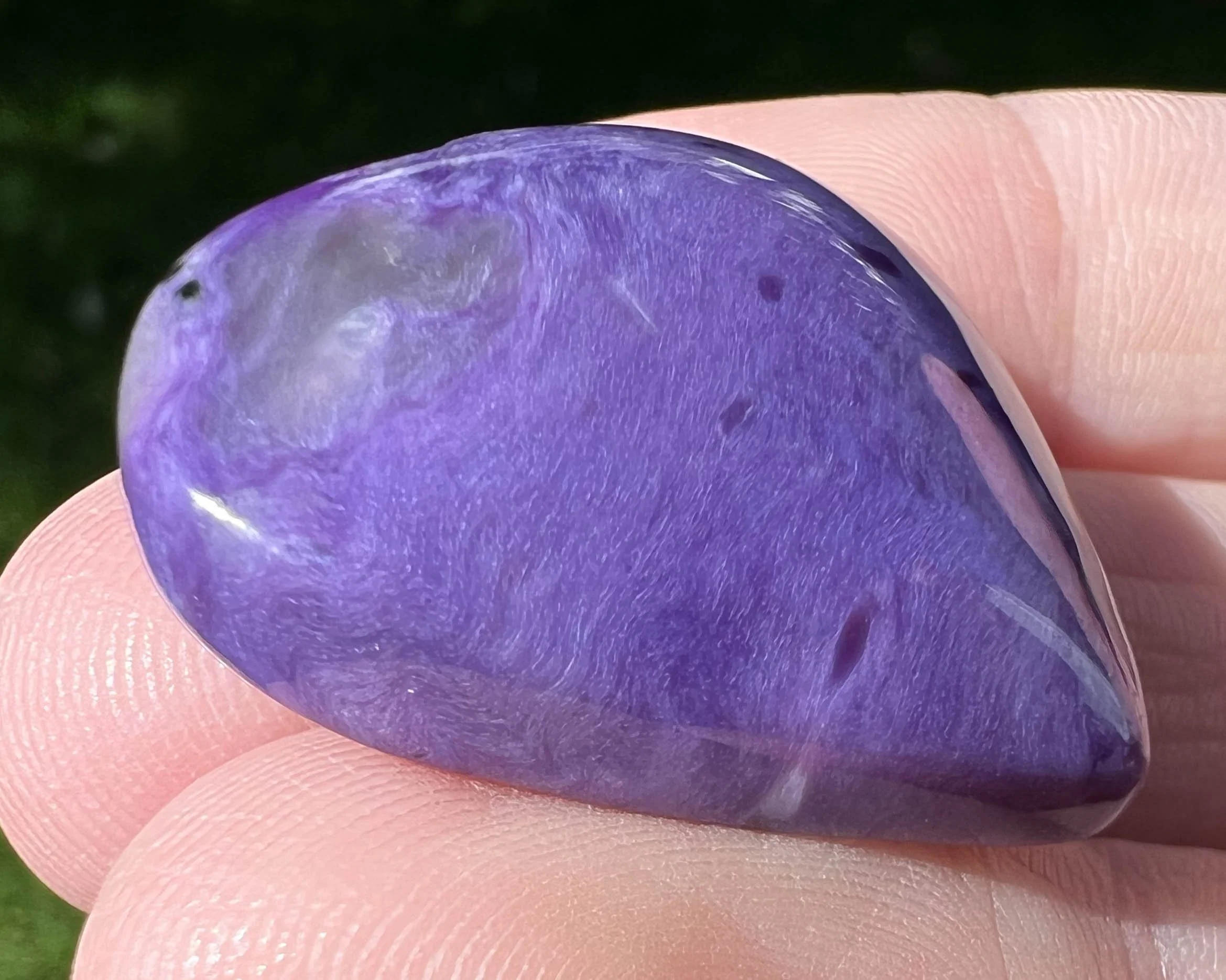 Charoite is known as the stone of acceptance and transformation. It is used to aid in positive change, being present, and emotional healing. When one door closes, Charoite helps you open the next one. It is believed to have generally strong spiritual / metaphysical power and a high vibration.