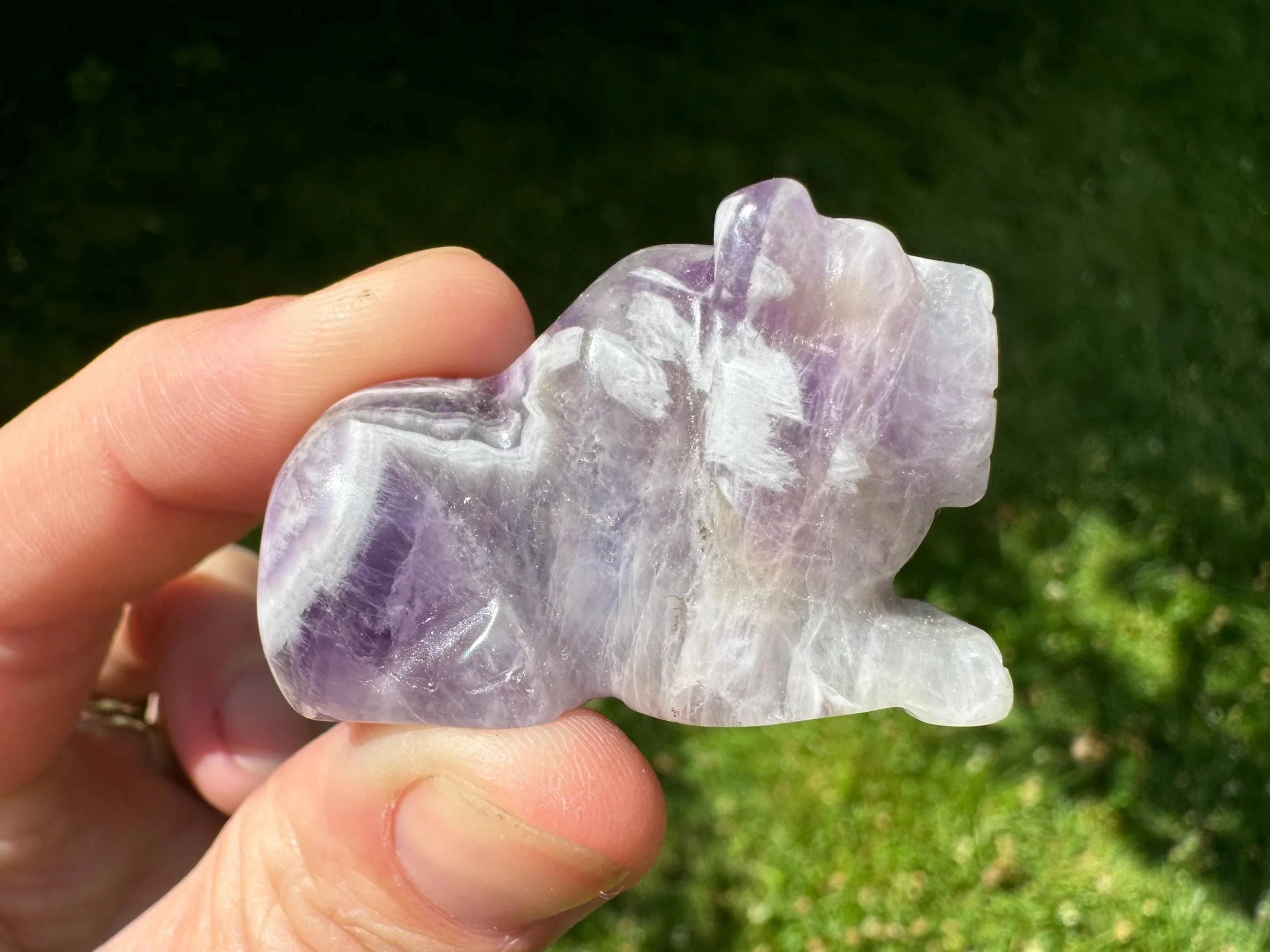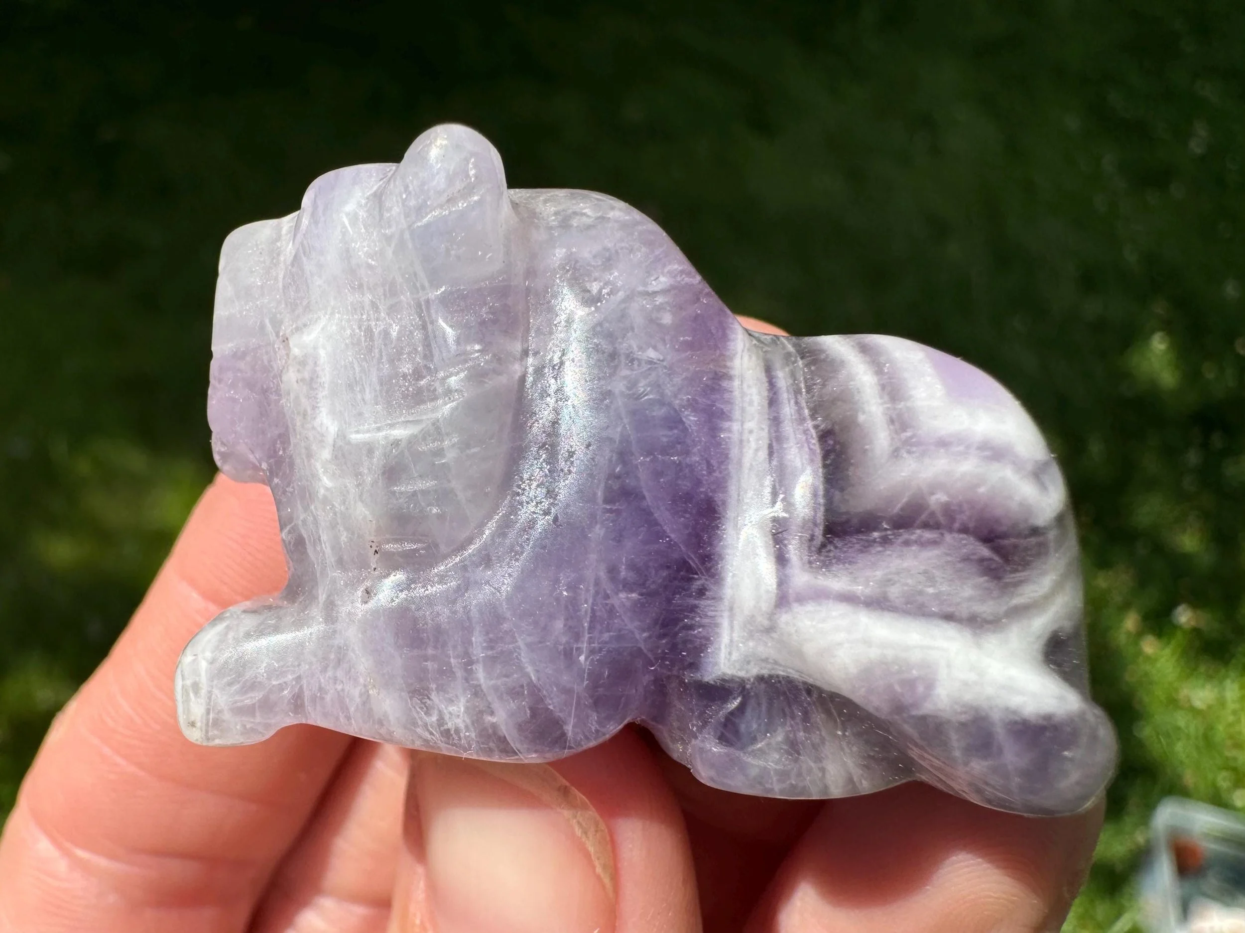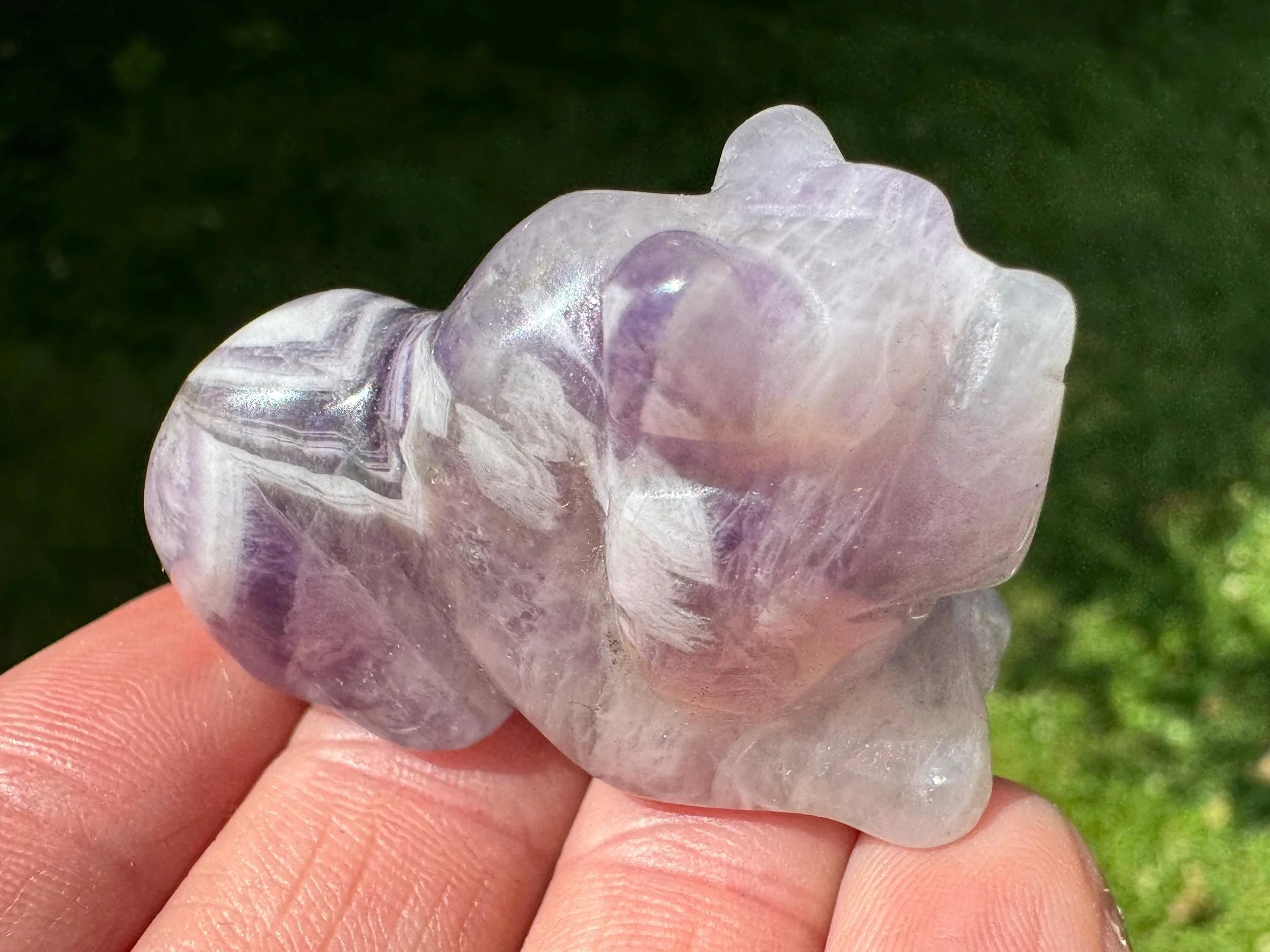 This is a lovely little lion carving made from natural Chevron Amethyst stone. Chevron Amethyst is purple Amethyst banded with layers of white Quartz, and the crystal points layered look like chevron patterns. This one has some pretty purple and white banding along its back. It is a regal little lion, tiger or other large cat carving that is laying down, with fuzzy cheeks. A very cute little figure.