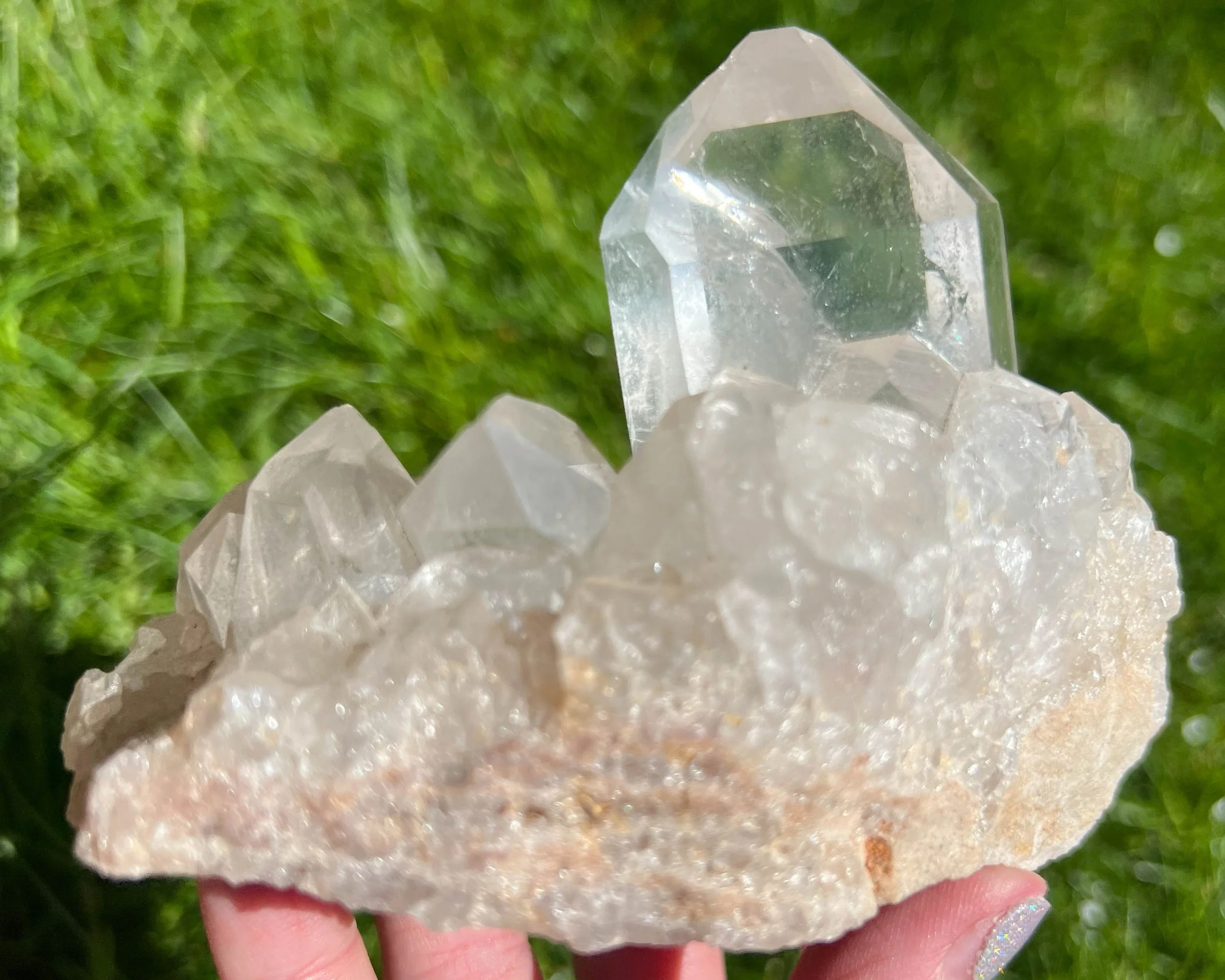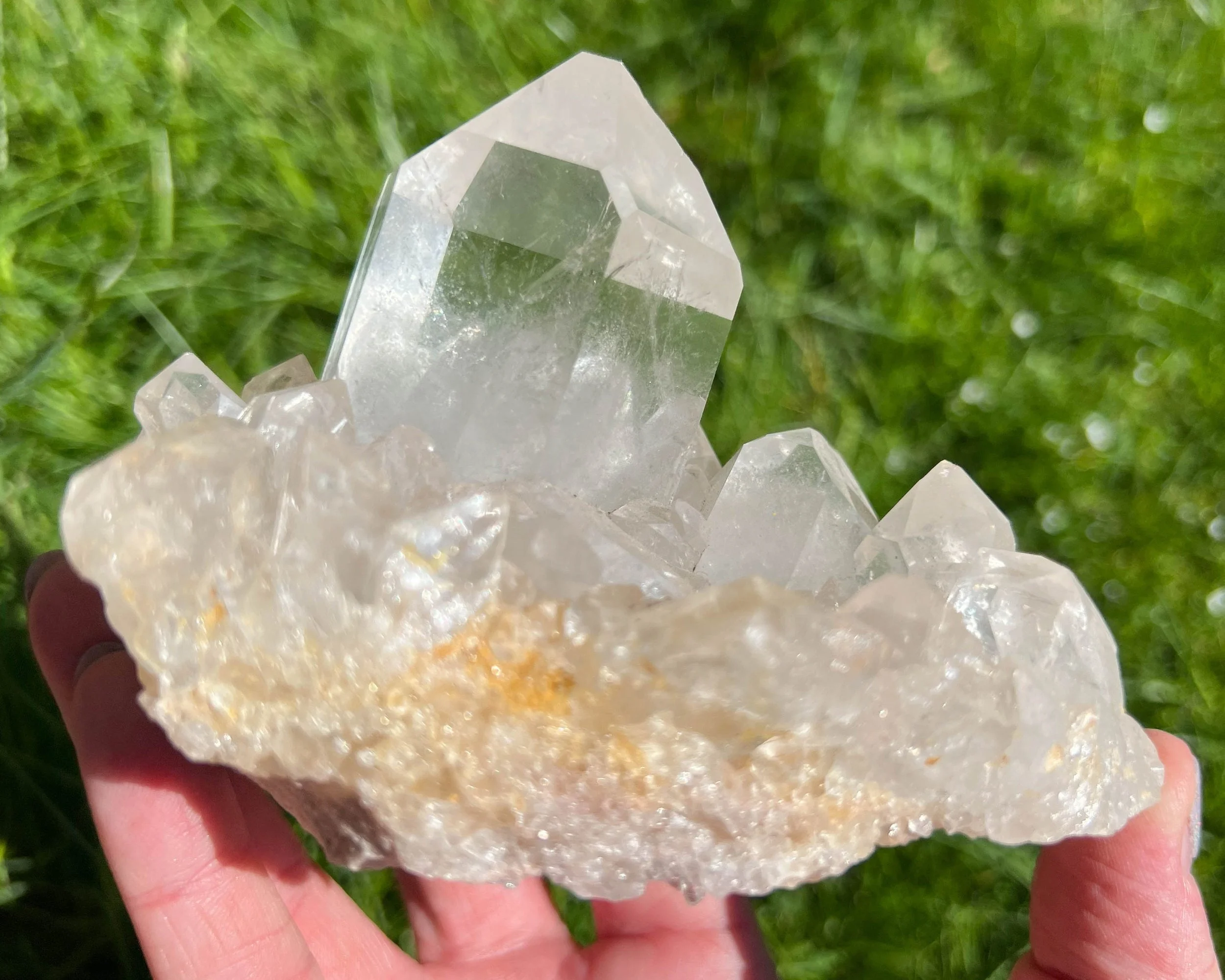 This is a beautiful clear Quartz crystal cluster from Brazil. It is an aesthetic formation with some natural orange iron in it. Sits nicely for display. A lovely piece for home decor.