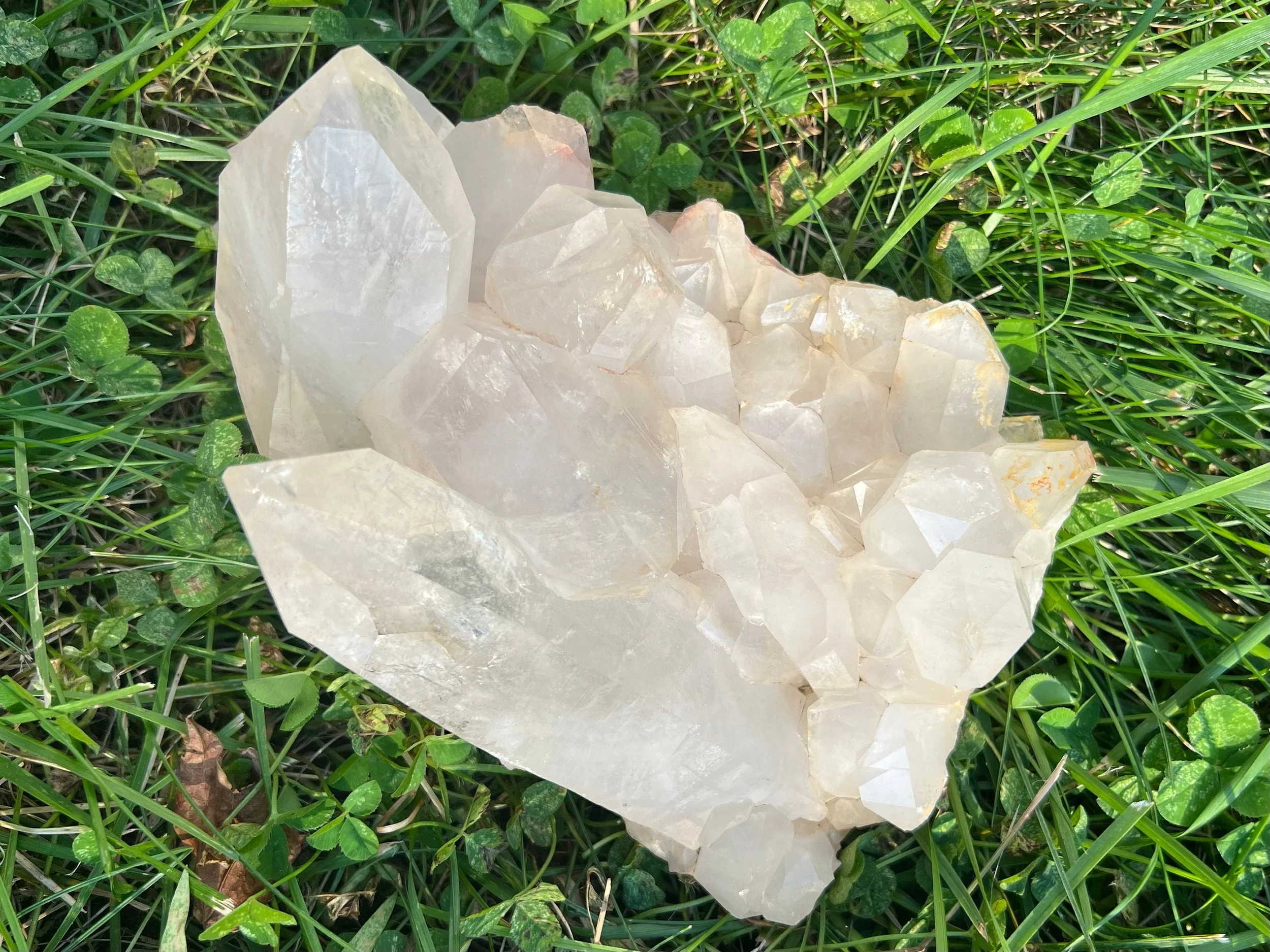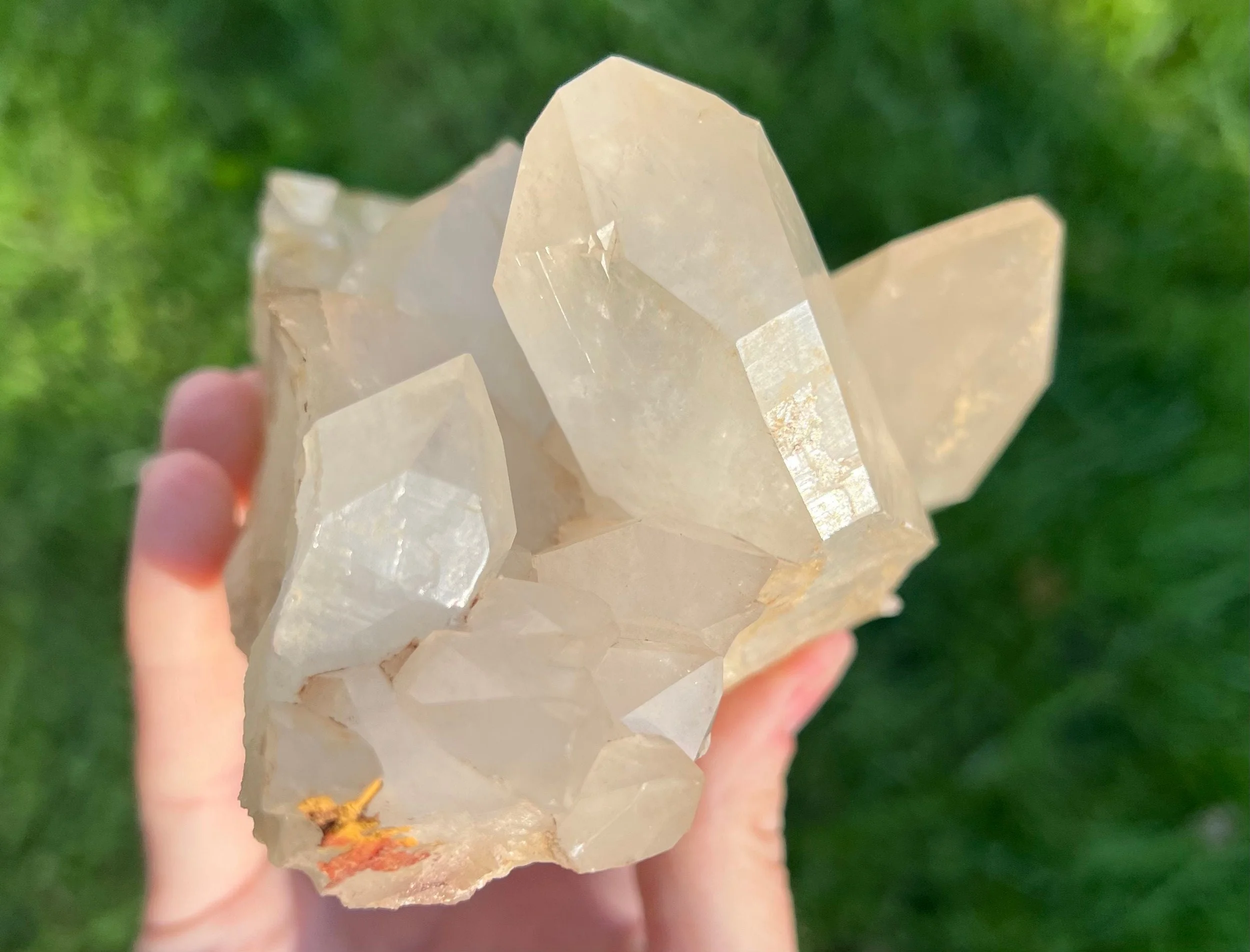 This large Quartz cluster is beautiful with good clarity and nice aesthetic formation. It has orange Hematite giving it a slight, light orange color. Also known as Tangerine Quartz. It is from Brazil. Very beautiful piece <3