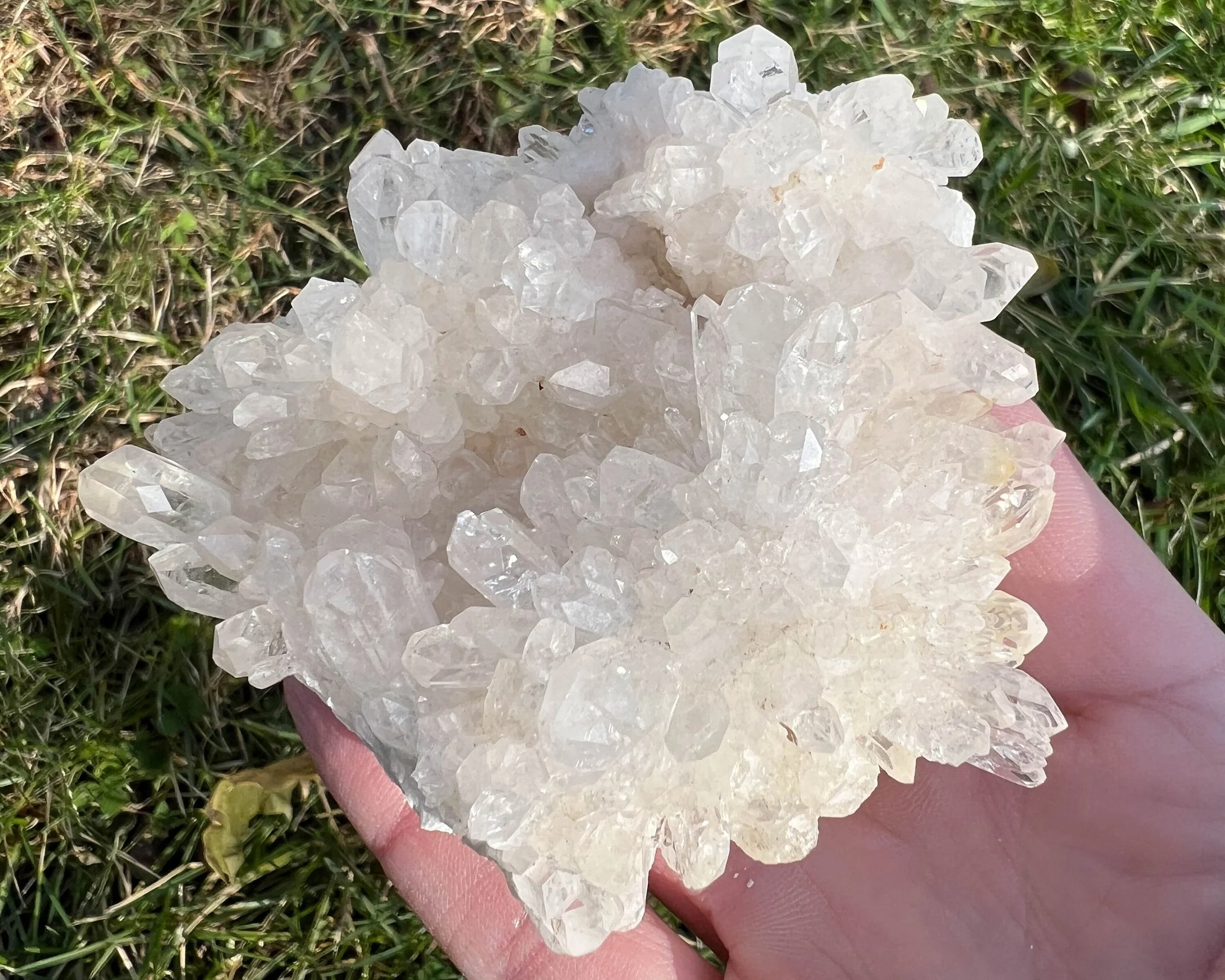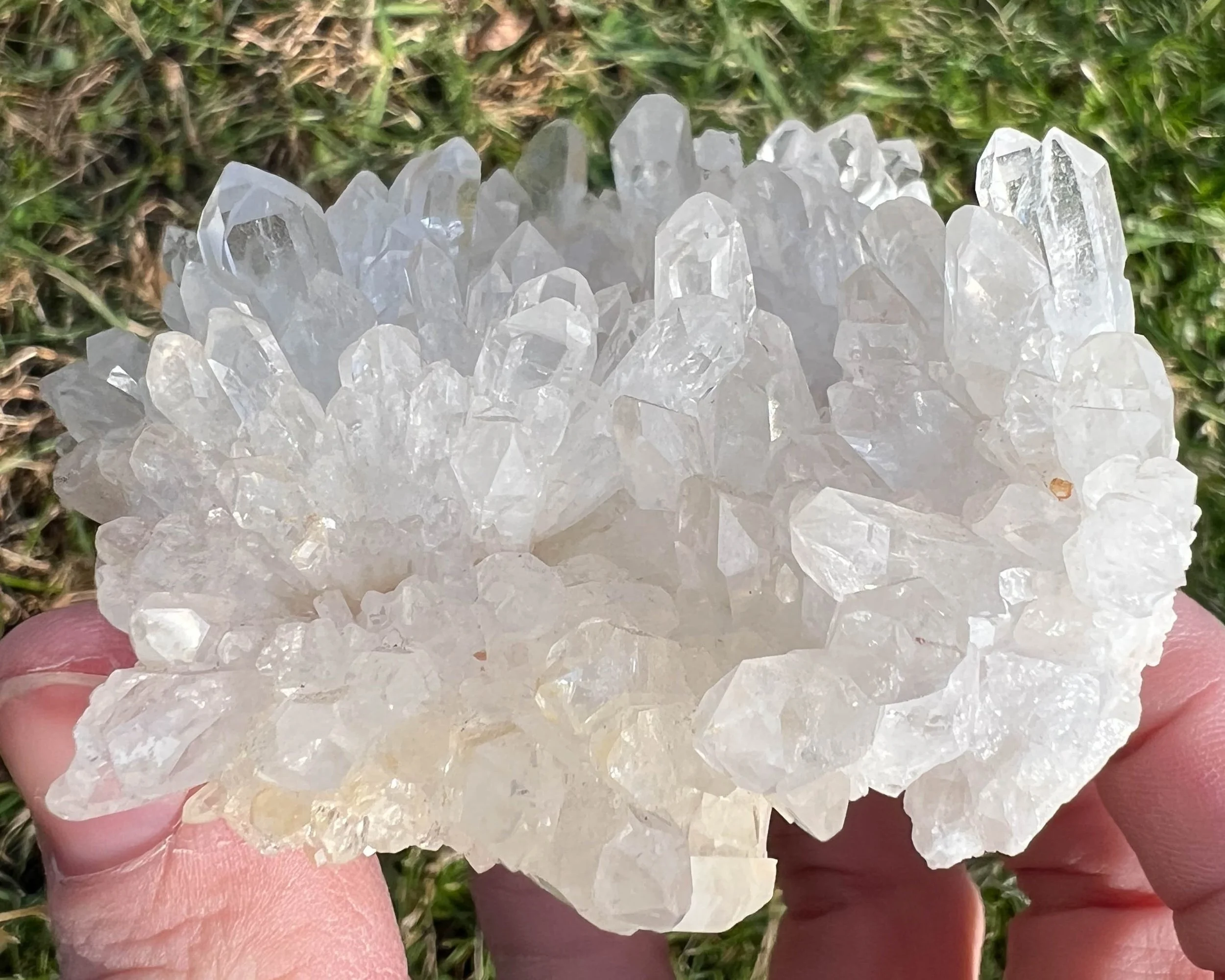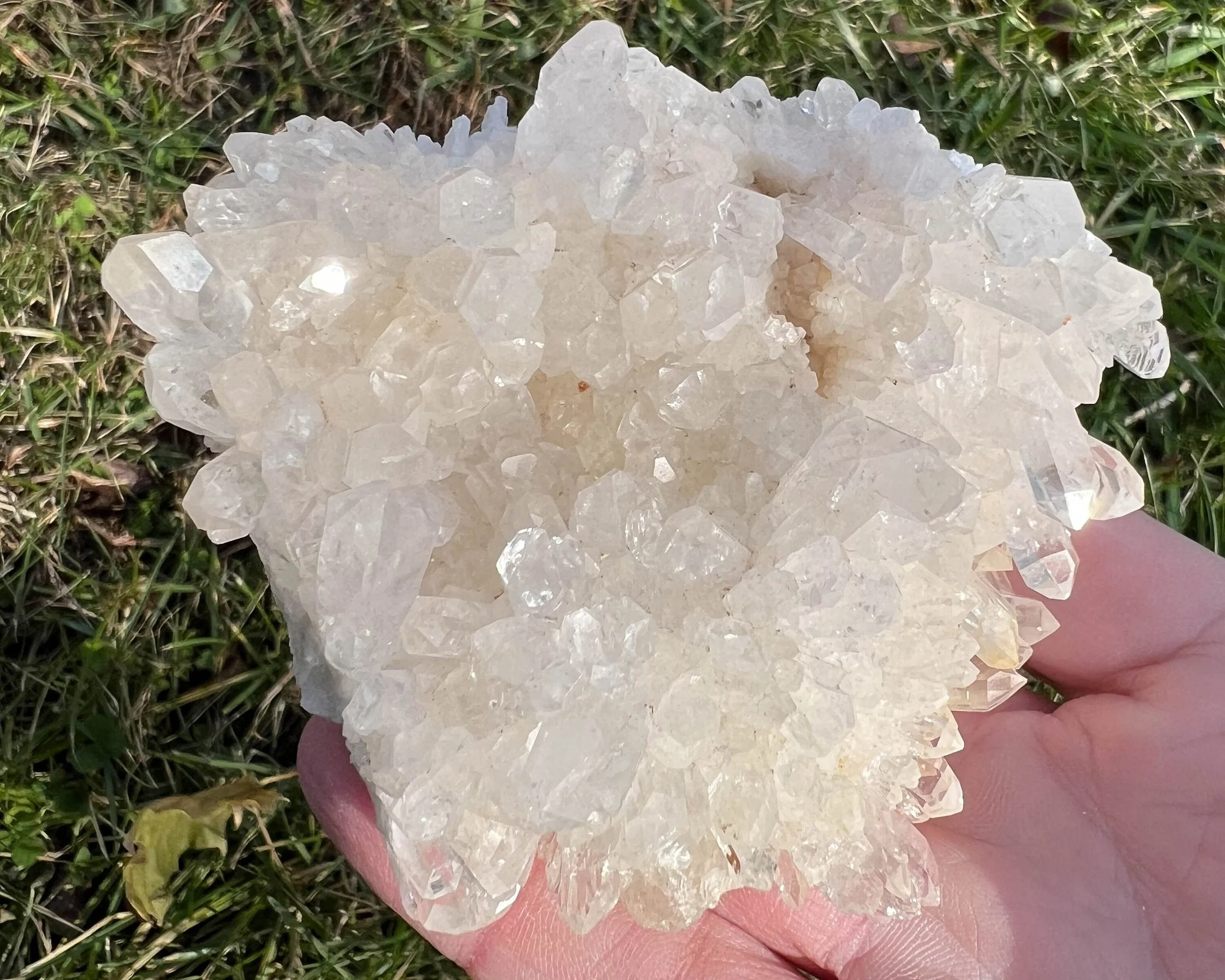 This is a clear Quartz cluster with lots of of smaller crystals, most with optical clarity in the points, and a lovely formation that is shaped nicely for display. Very sparkly, with beautiful Quartz crystals.