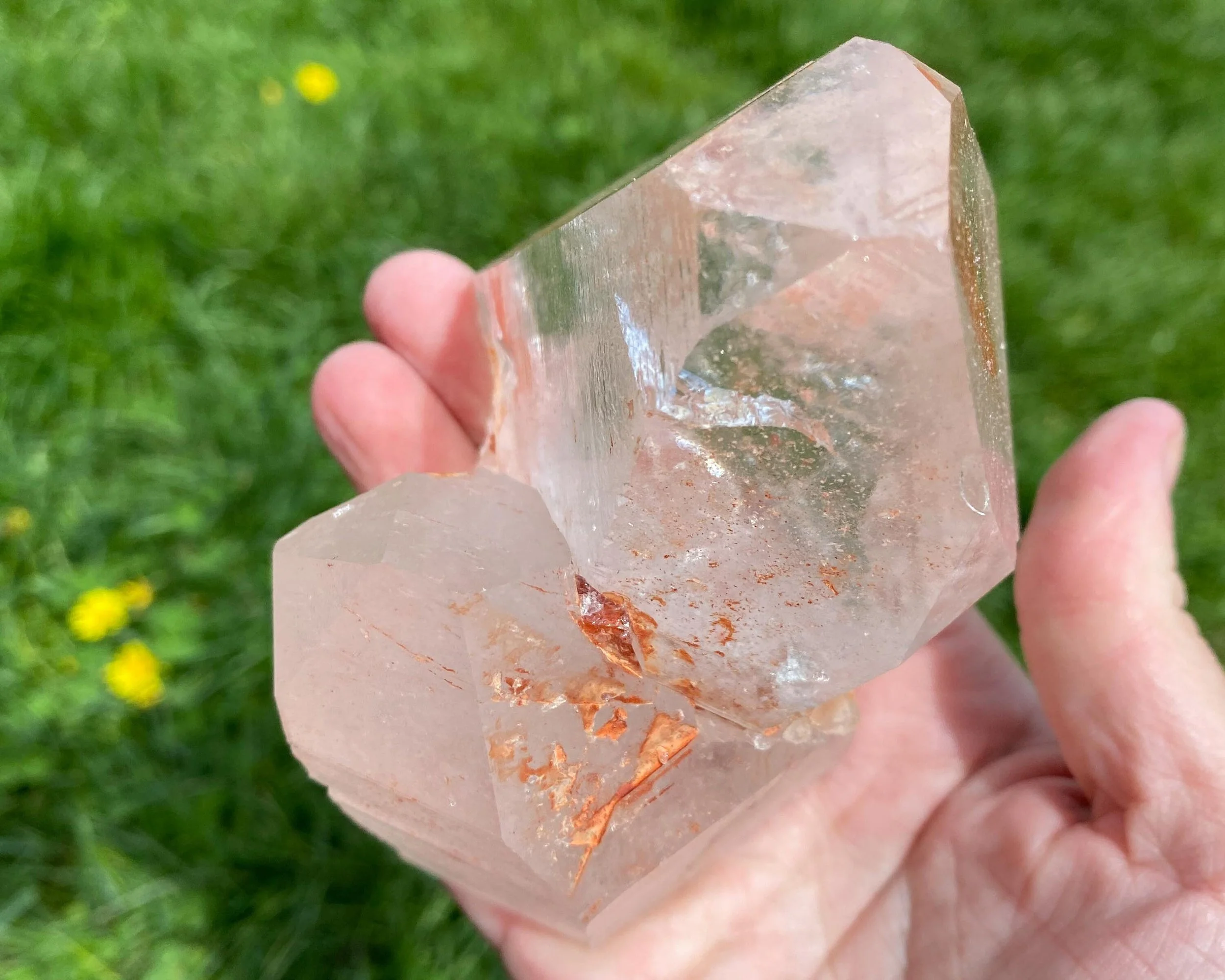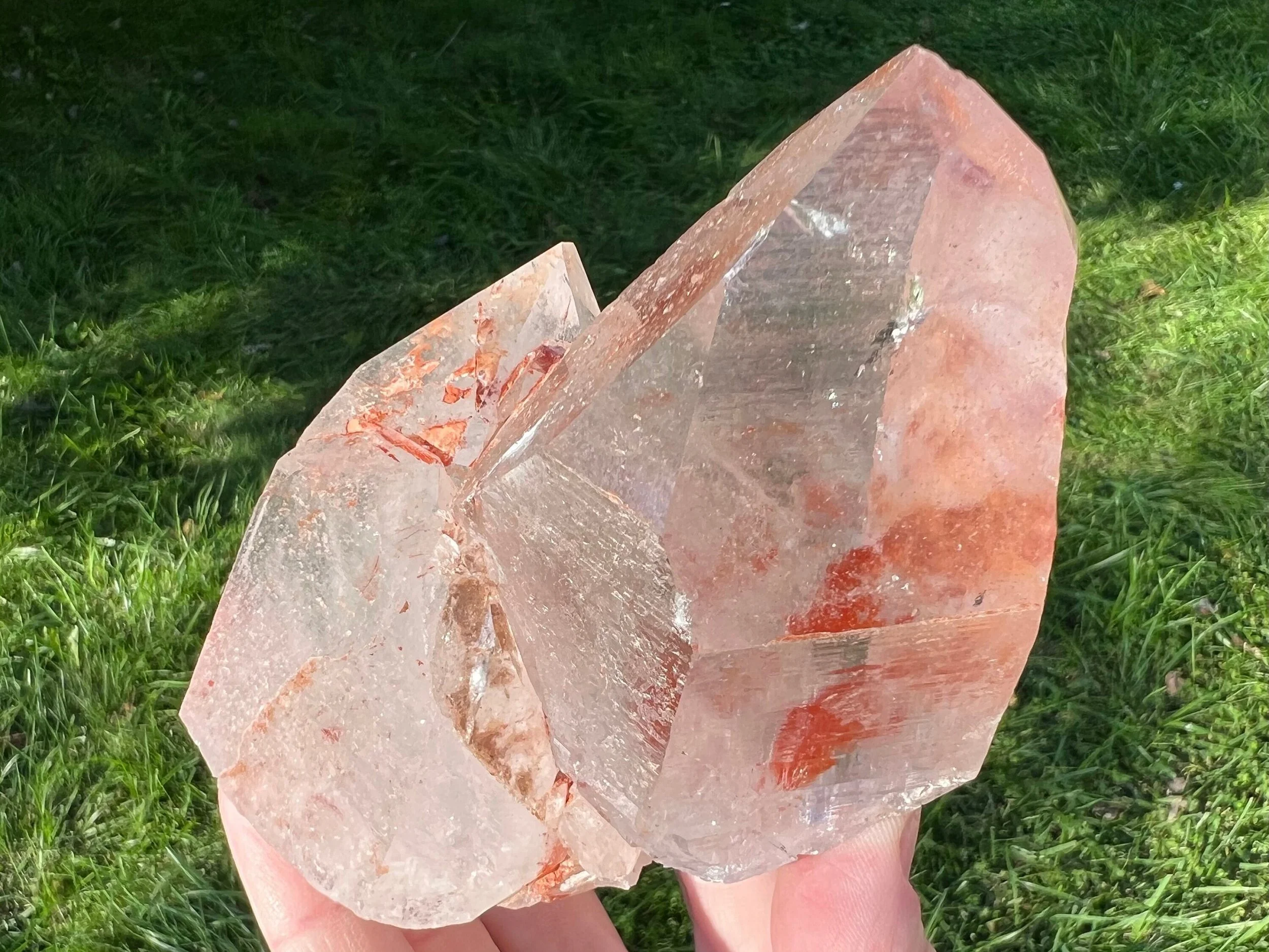 This is a beautiful clear Quartz cluster with bright Red Hematite in it. It consists of two large crystals, with some self healing, and lots of bright red inside the crystals which have great clarity too.