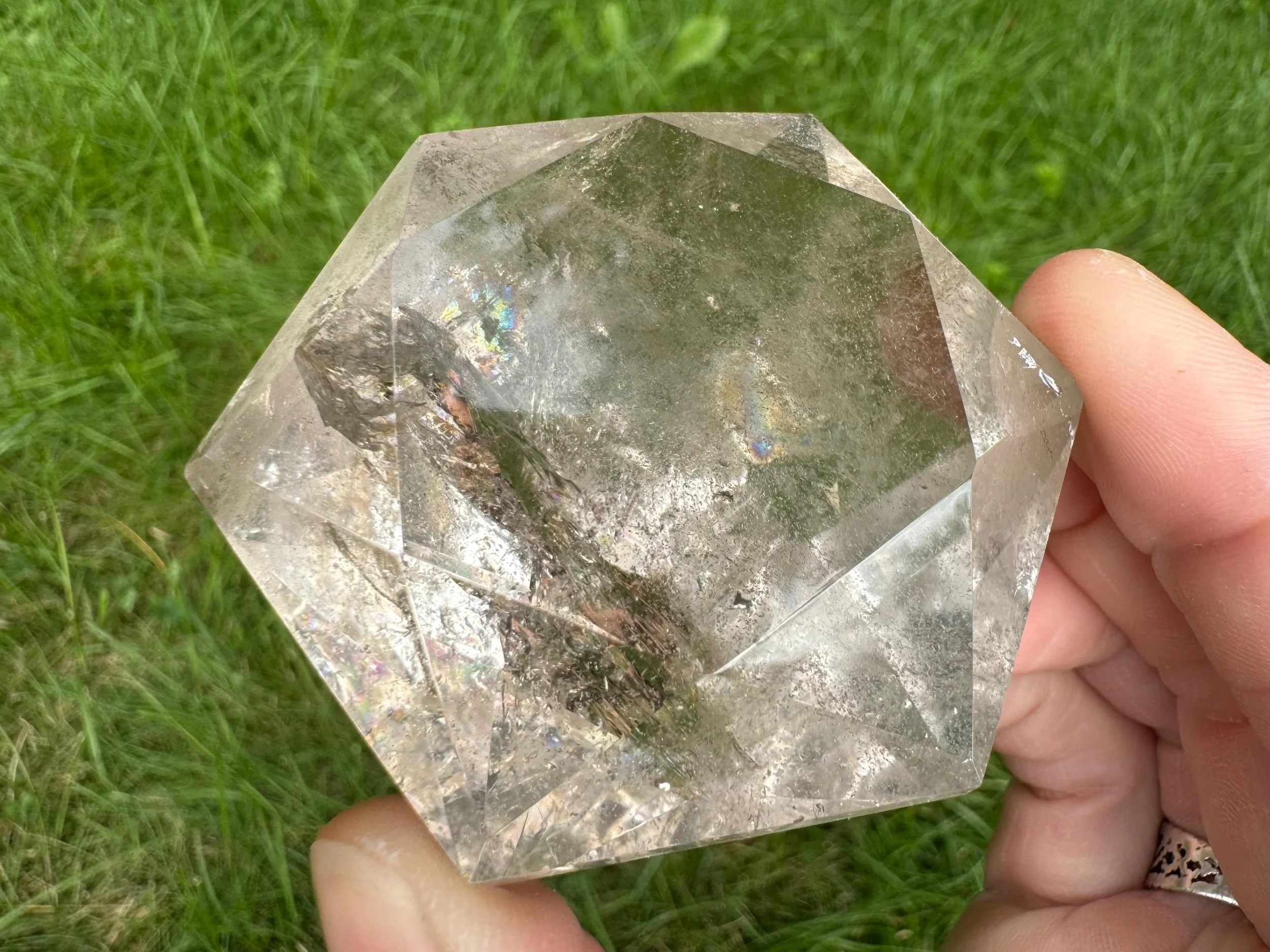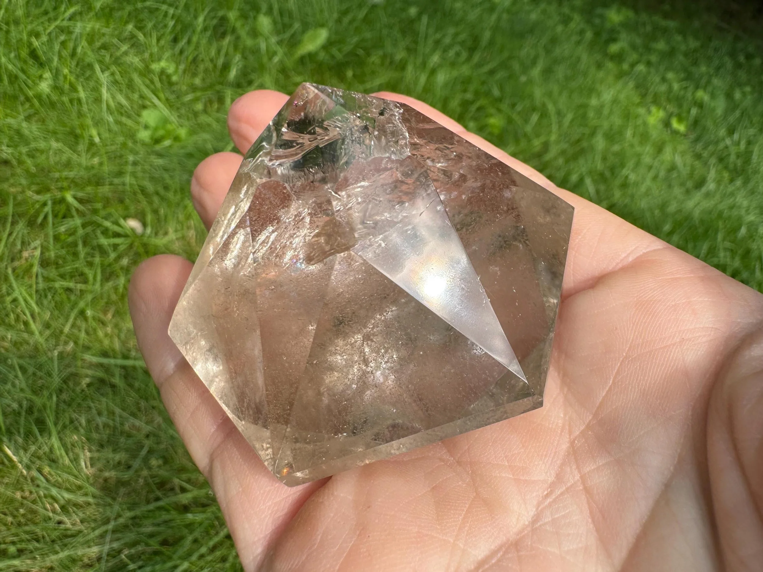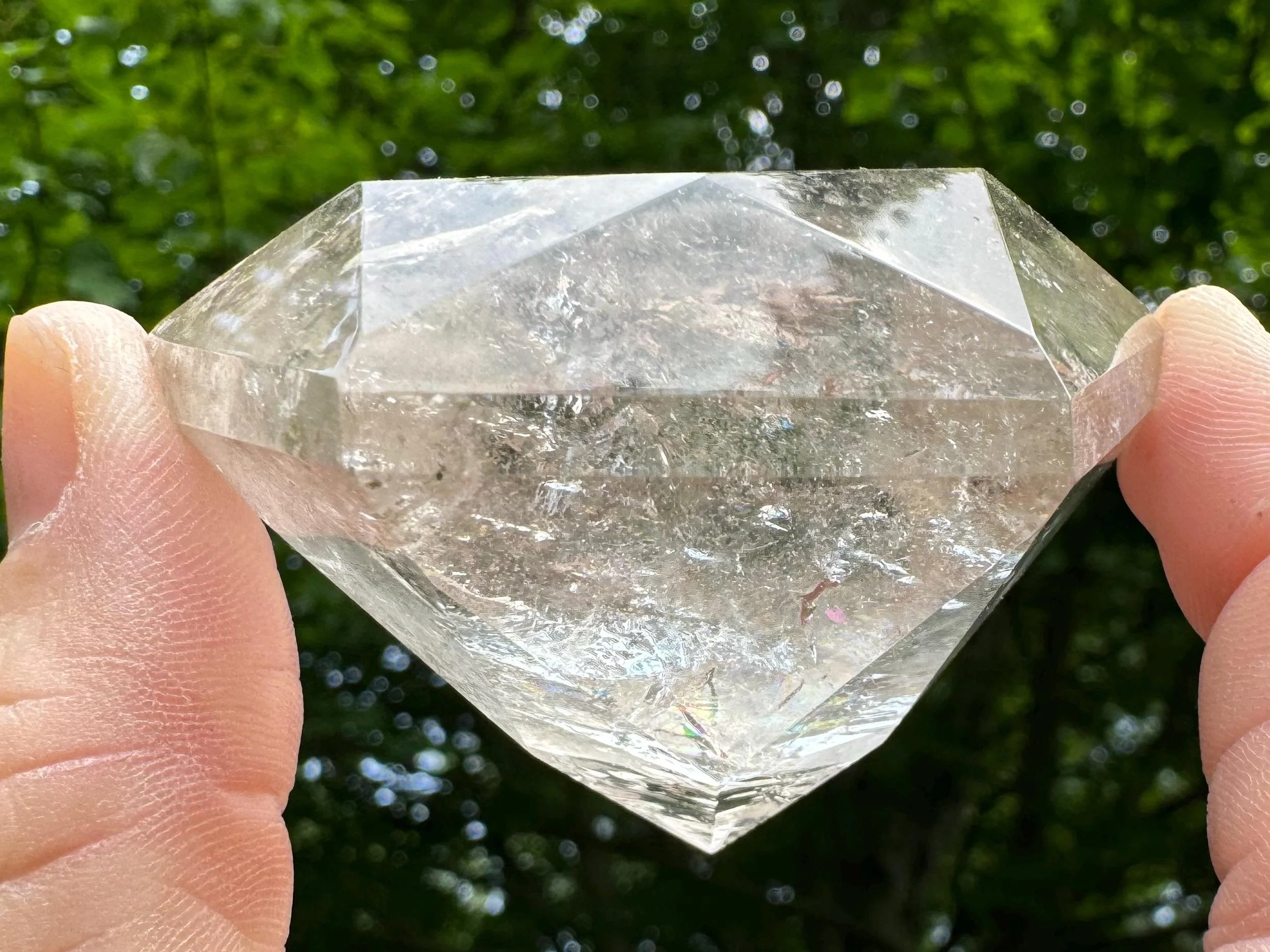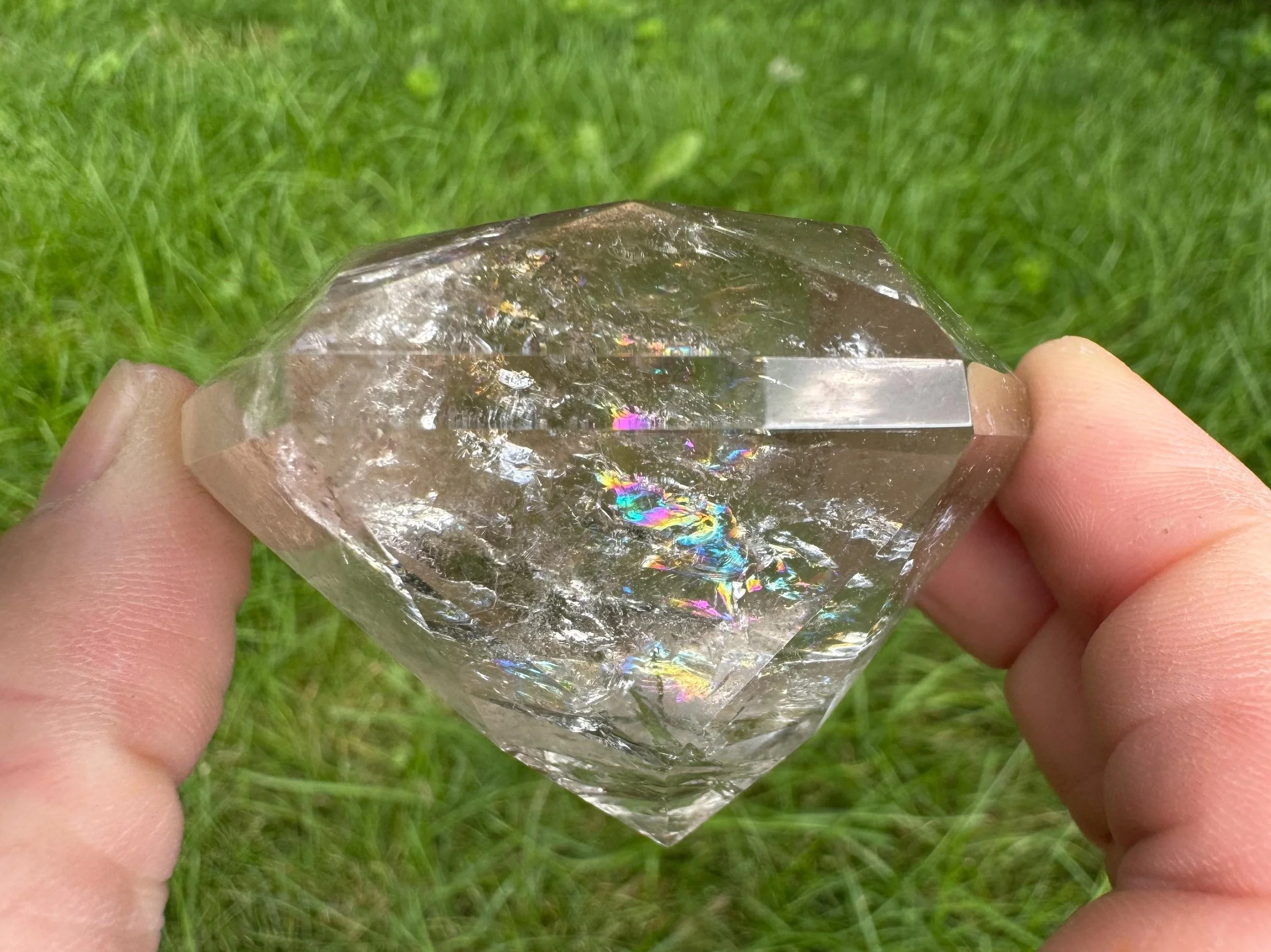 This is a clear Quartz crystal cut and polished into a diamond shape, aka Brilliant cut. It is natural Quartz crystal with nice rainbows, cut like a large faceted jewel :) Perfect for anyone who loves crystals, jewels, diamonds, or just likes a little glam in their life!