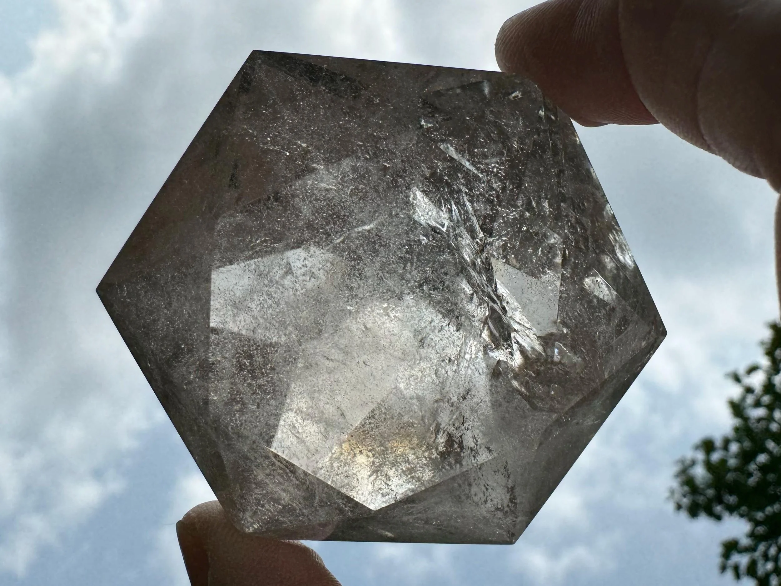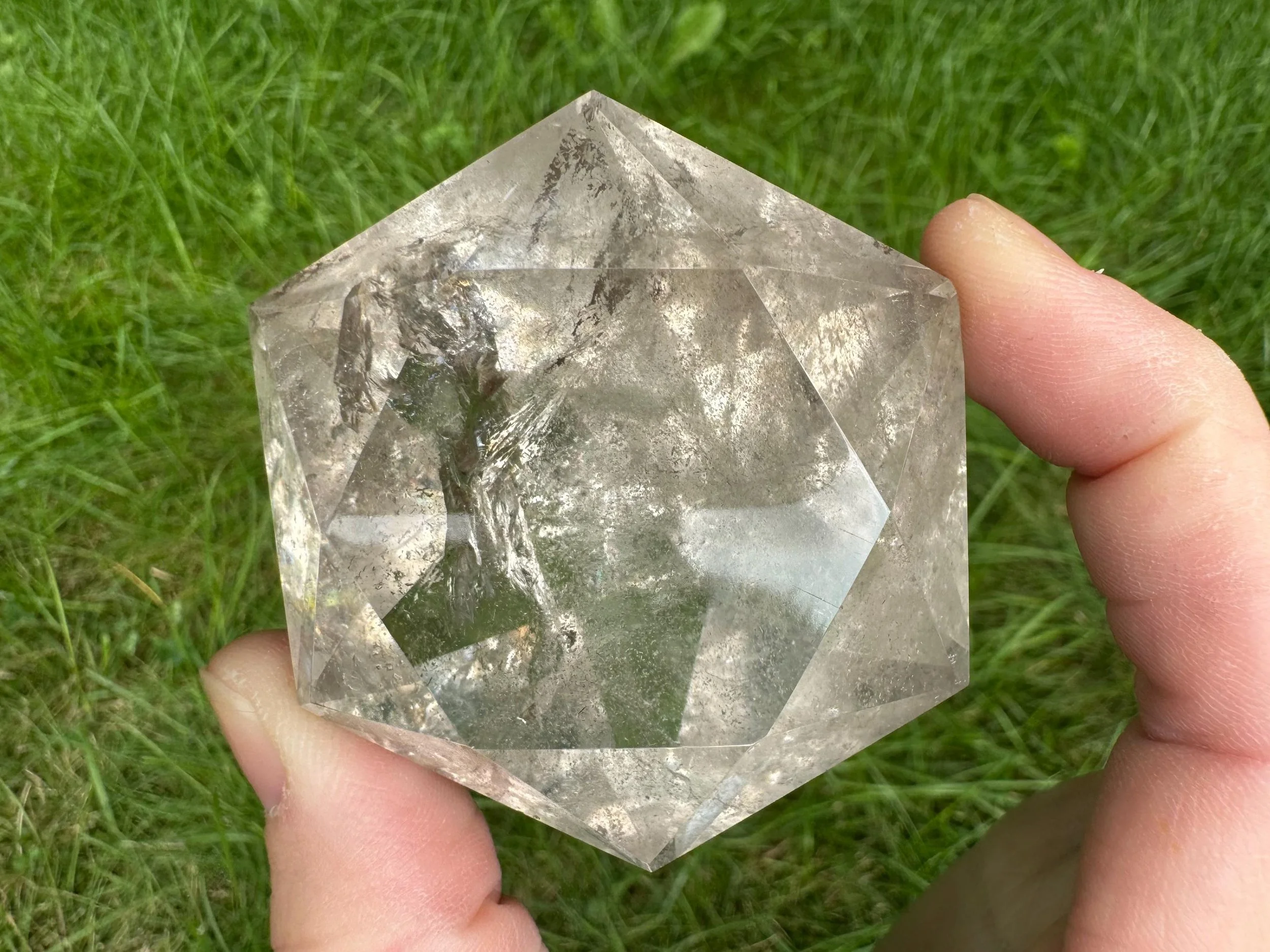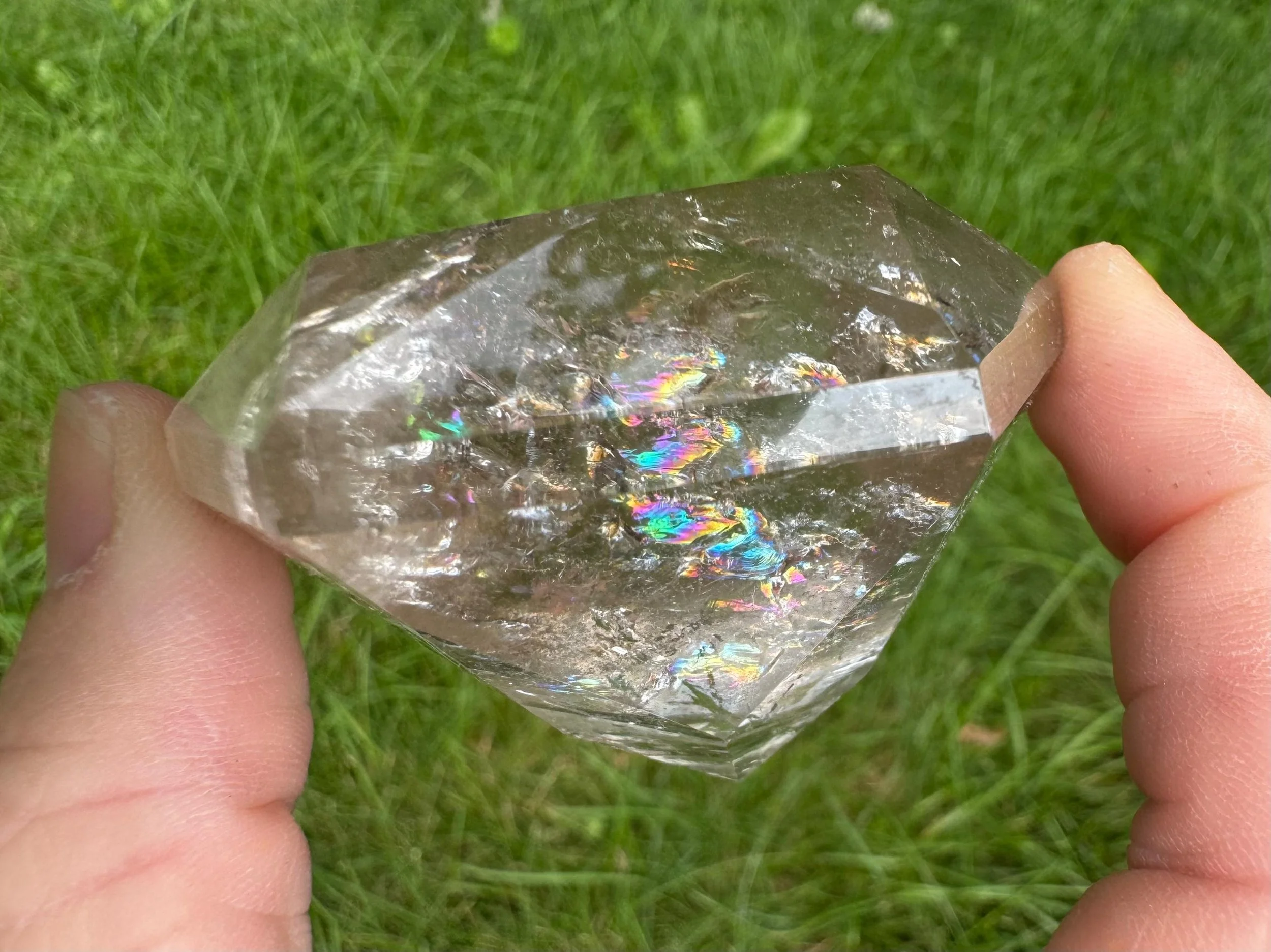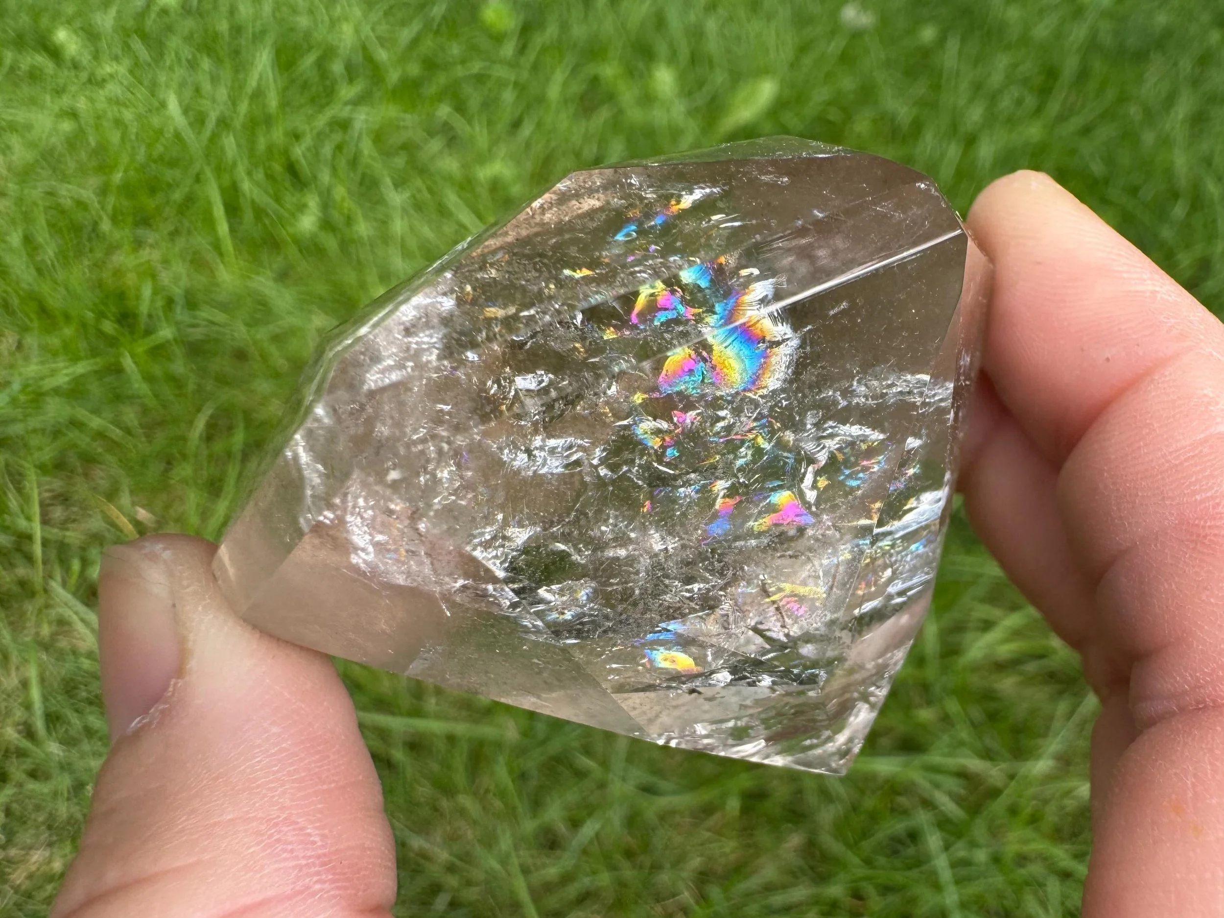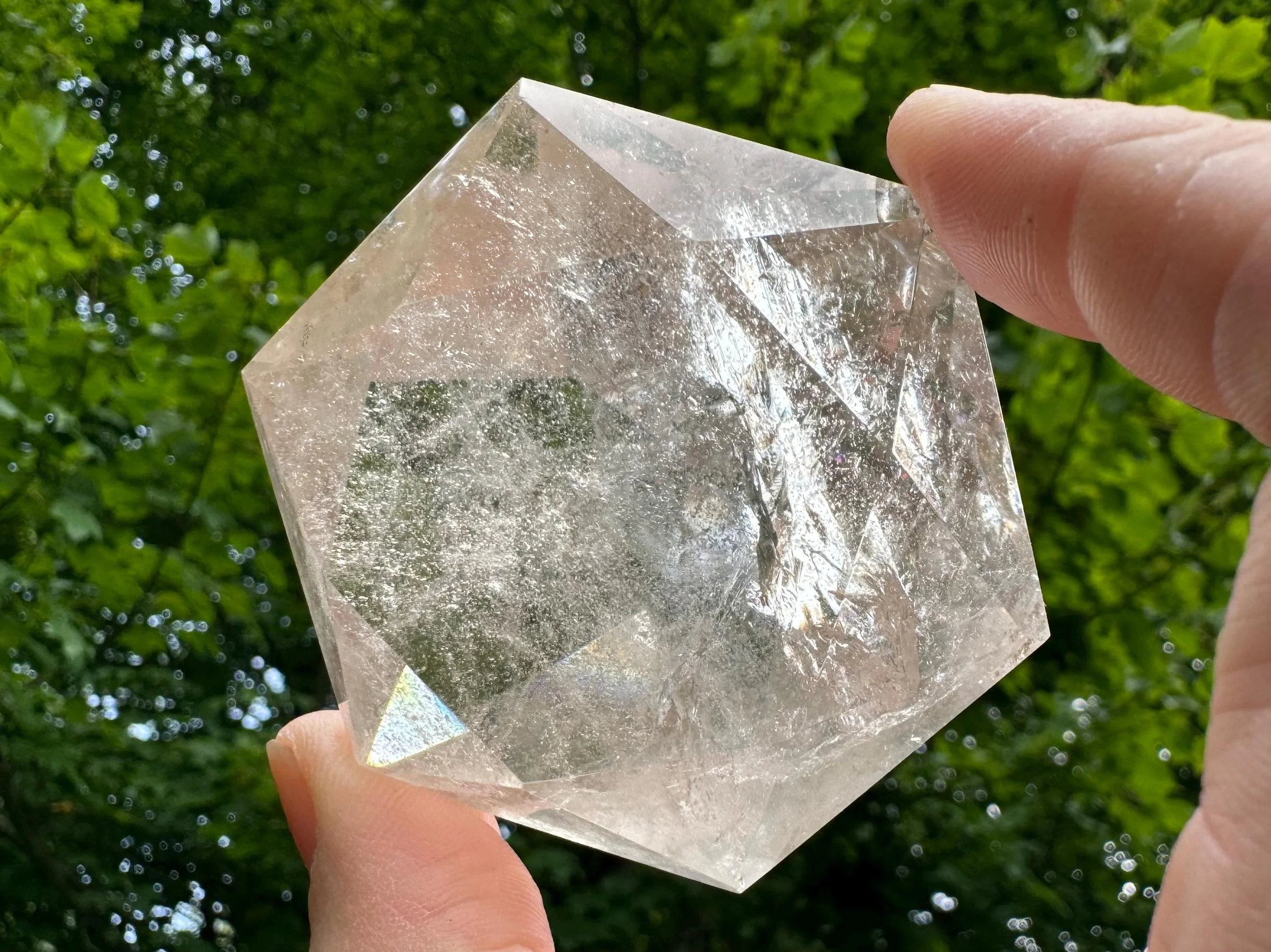 This is a clear Quartz crystal cut and polished into a diamond shape, aka Brilliant cut. It is natural Quartz crystal with nice rainbows, cut like a large faceted jewel :) Perfect for anyone who loves crystals, jewels, diamonds, or just likes a little glam in their life!