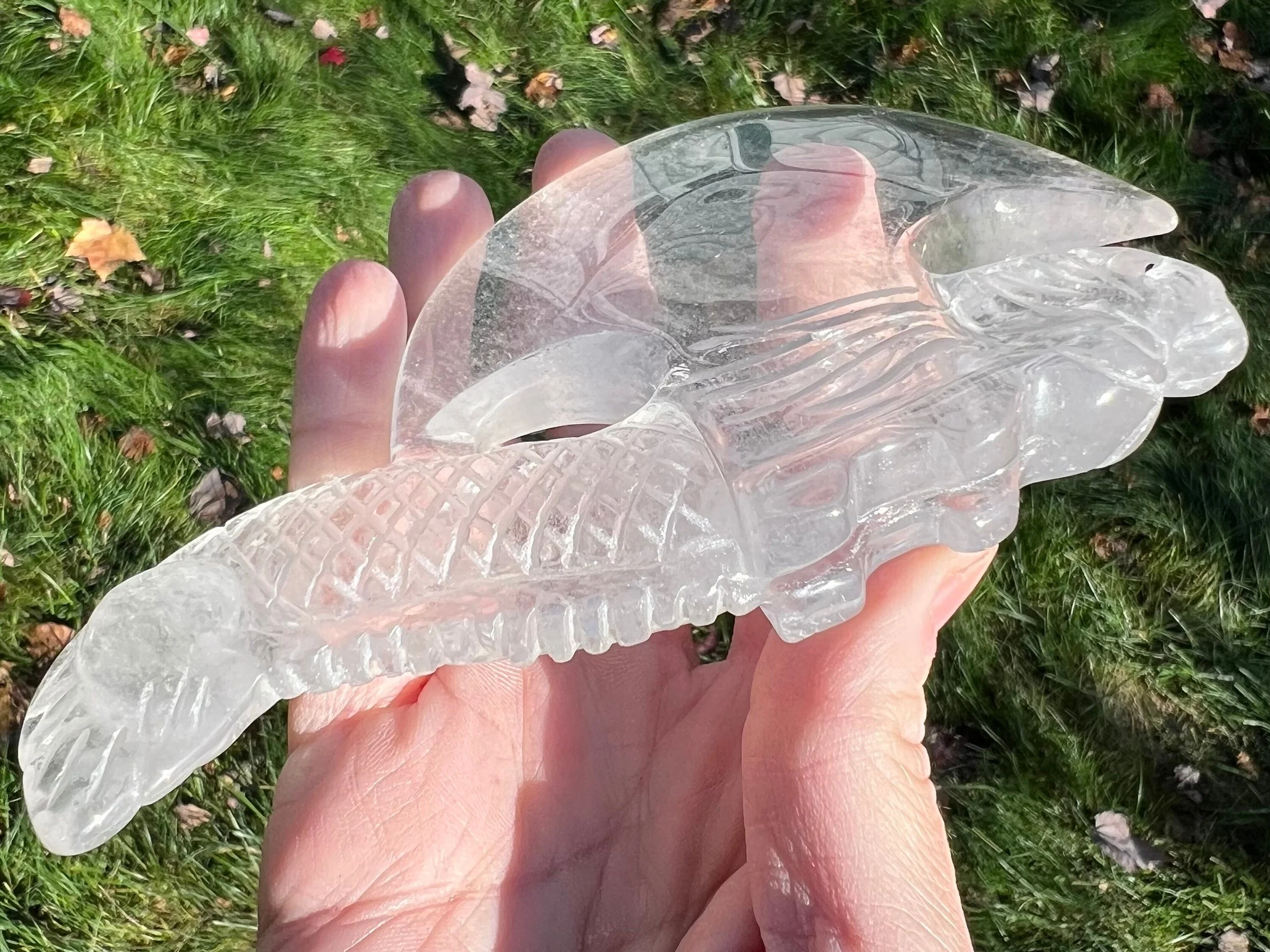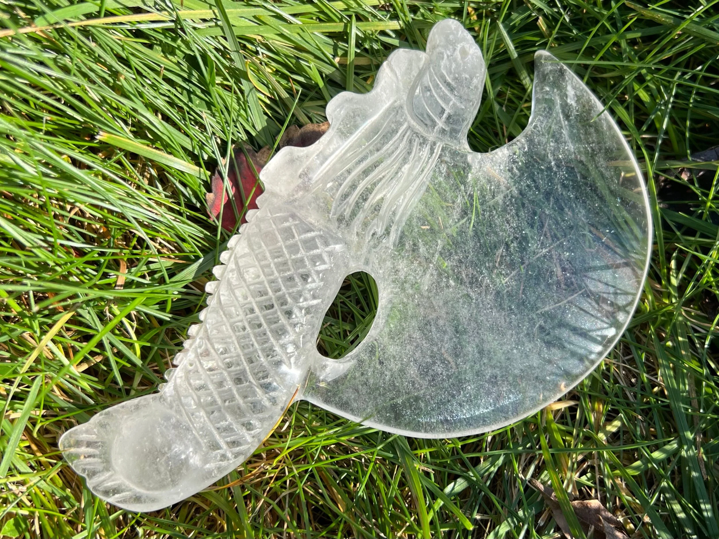 This is a clear Quartz carving of an ax with a dragon as the handle. The dragon has nice details including a face, scales, horns etc. There are holes drilled in his mouth that make the teeth more realistic looking and that can be used to hang the ax and they are not very noticeable if you prefer not to use them. I didn't even notice them for a couple weeks. This is a really beautiful piece and feels very sturdy too. I believe this is a nordic / viking style carving.
