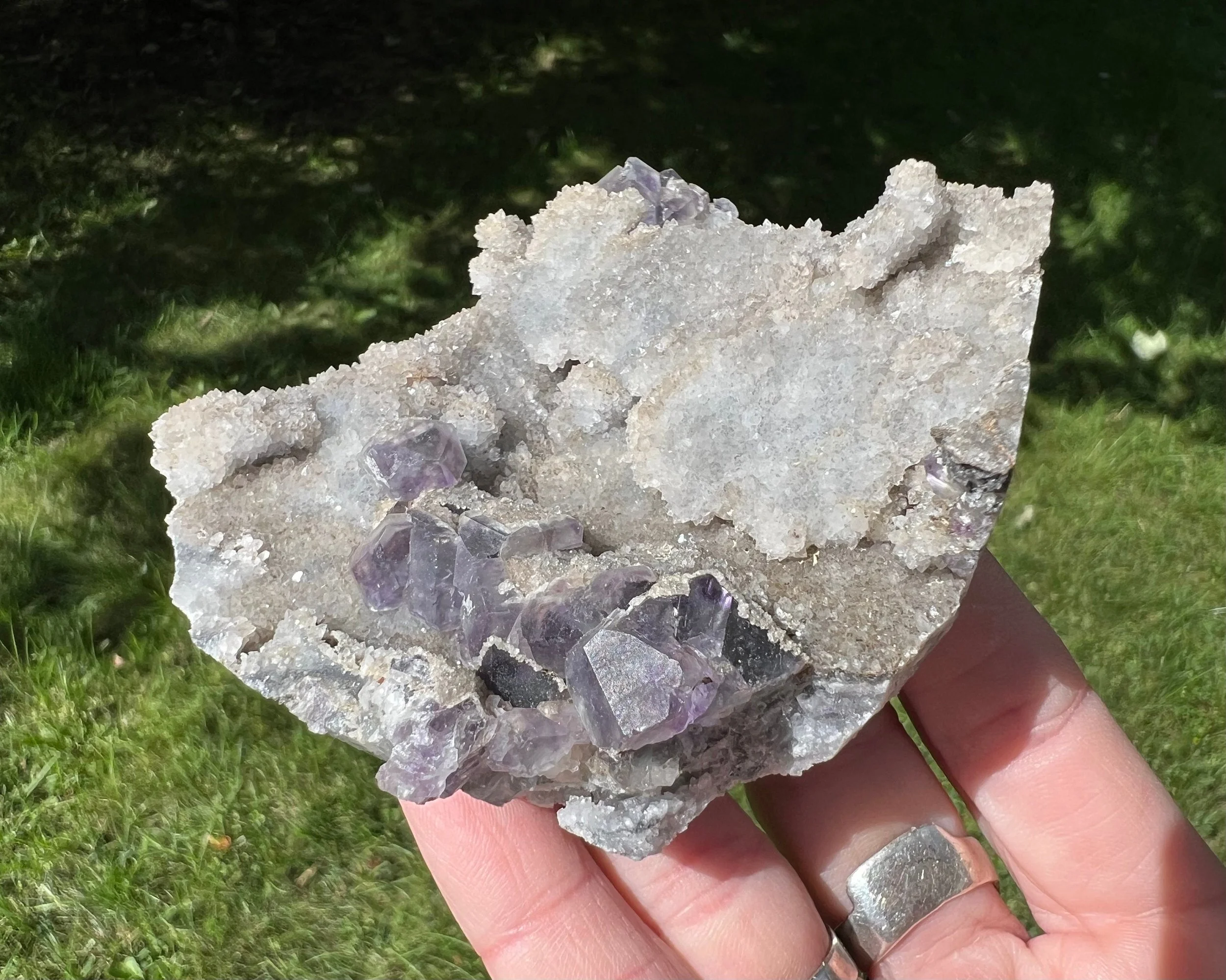 This is a beautiful specimen of Fluorite crystals that are both blue and purple, on sparkling white and gray druzy Quartz. The colors are super pretty together and the contrast against the sparkly Quartz is awesome :) There are also some little druzy caves on the bottom of the piece! <3