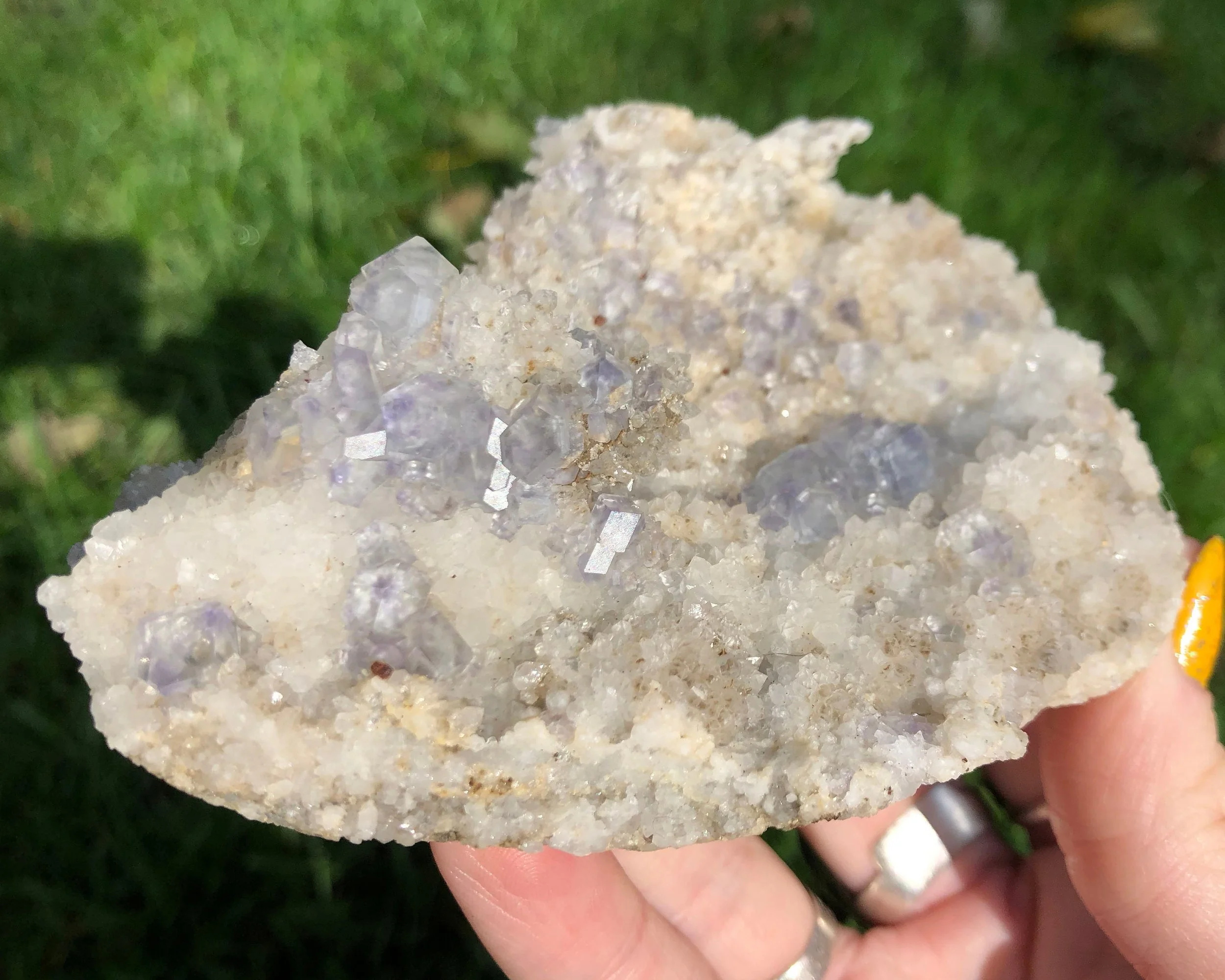 This is a beautiful specimen of Fluorite crystals that are both blue and purple, on sparkling white druzy Quartz. The colors are super pretty together and the contrast against the glittering white is awesome :) This piece is double sided, with the 'bottom' having some more sparkly druzy Quartz :)