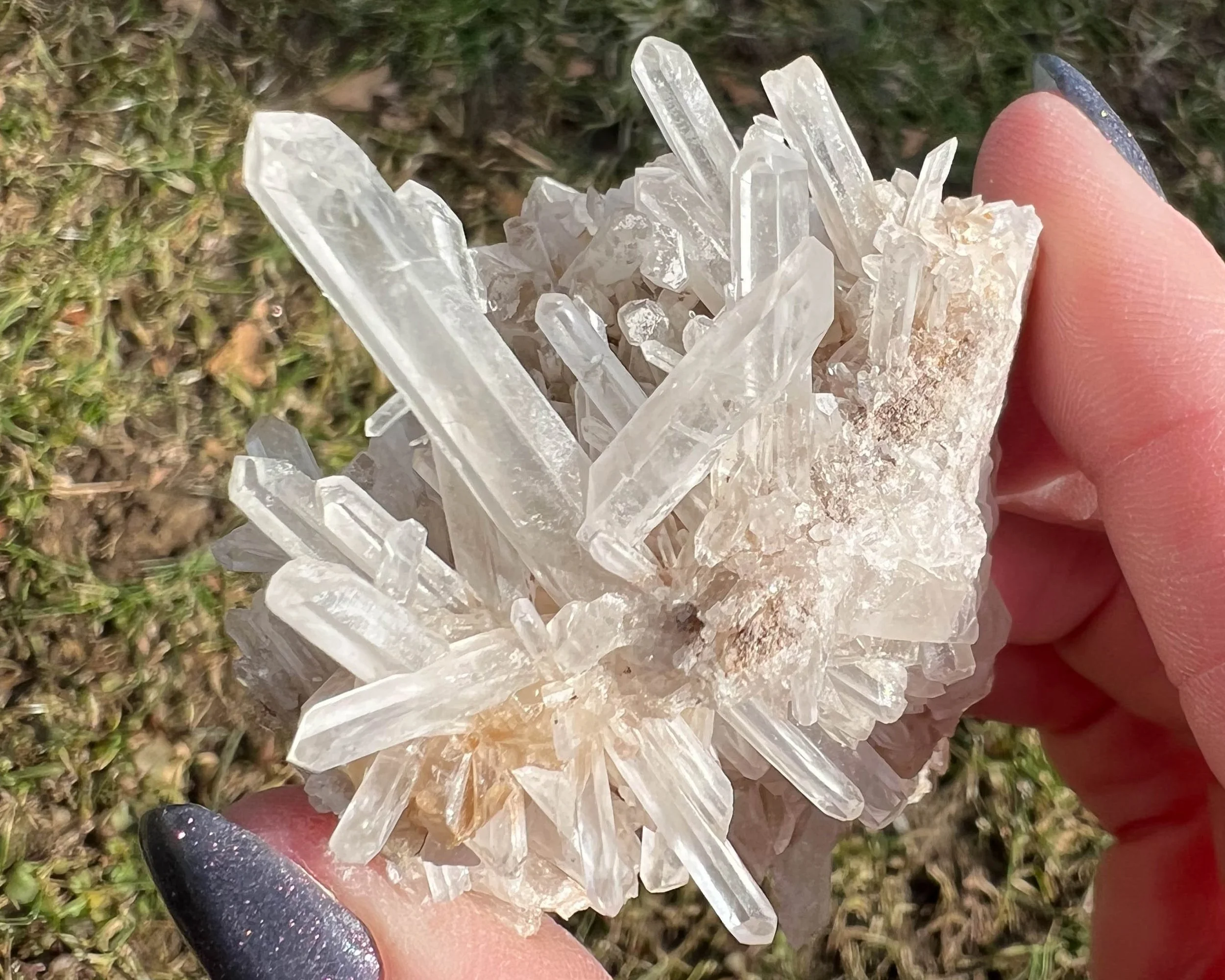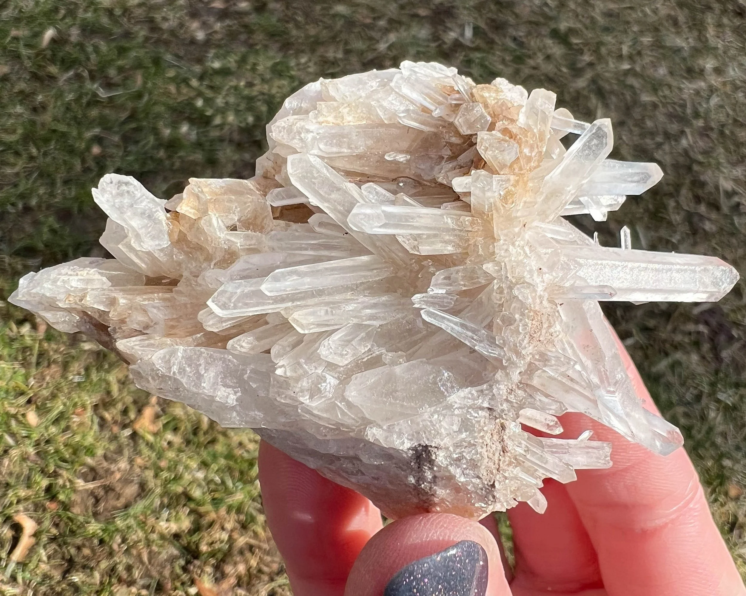 This is a funky small clear Colombian Quartz cluster. It has clear, long thin needle Quartz points going up down and all around. Very beautiful crystals in a funky but aesthetic formation that makes a great small display piece.