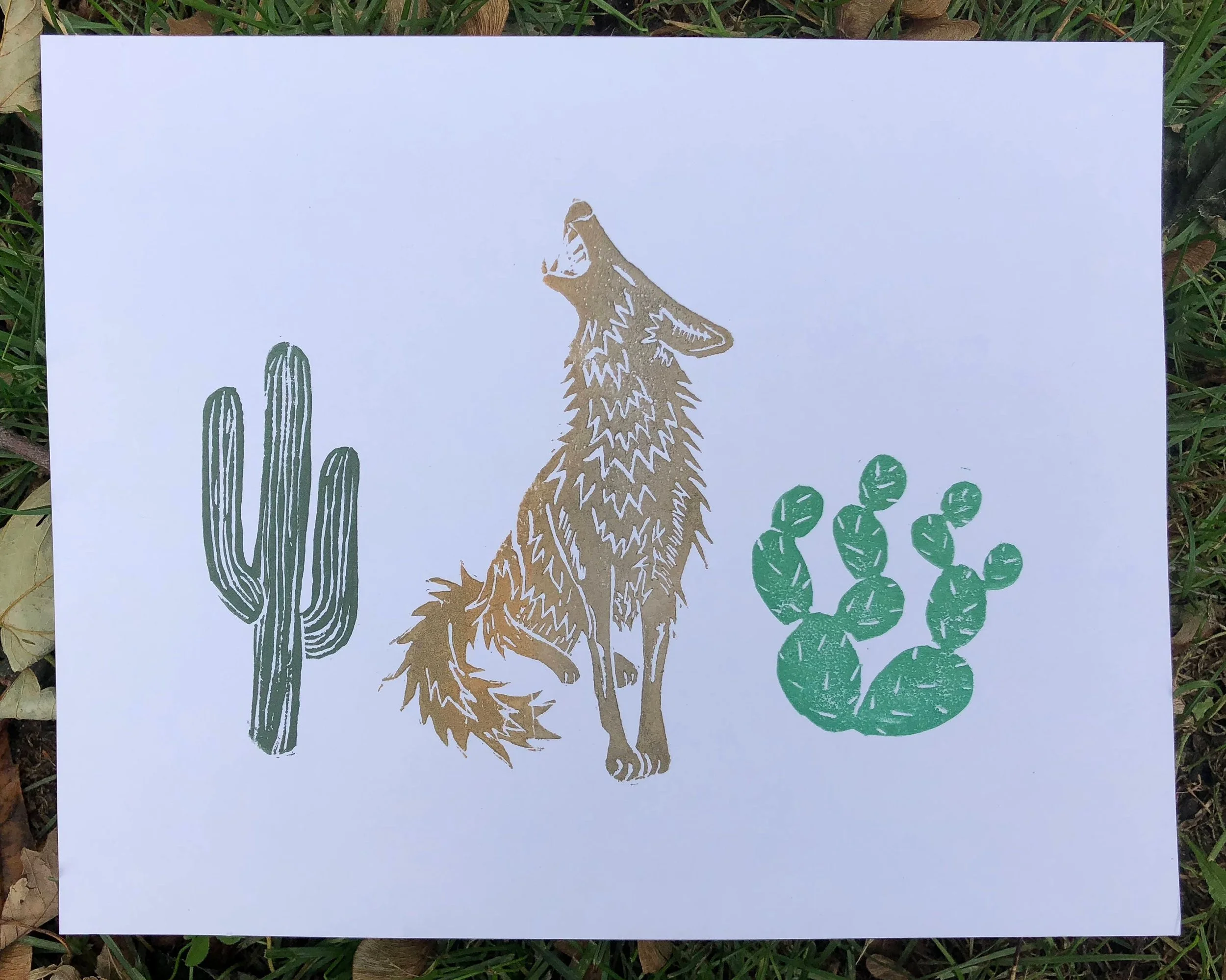 Image 1 of 3 Image 2 of 3 Image 3 of 3 Coyote Howling in the Desert : Lino Block Print #9 $15.46 sold out This is a one of a kind, hand carved and hand printed print. I carved the original images freehand into rubber sheets and printed with Speedball block printing inks. This one features a metallic golden coyote, howling beside two cacti: a Prickly Pear and a Saguaro. I really love coyotes and deserts :) Measures 8 x 10 inches with plenty of room to matte or frame <3 Printed on card stock Shipped with CHIPBOARD for protection Thanks for looking! Kouva Dream Catchers <3 Sold Out Added! This is a one of a kind, hand carved and hand printed print. I carved the original images freehand into rubber sheets and printed with Speedball block printing inks. This one features a metallic golden coyote, howling beside two cacti: a Prickly Pear and a Saguaro. I really love coyotes and deserts :) Measures 8 x 10 inches with plenty of room to matte or frame <3 Printed on card stock Shipped with CHIPBOARD for protection Thanks for looking! Kouva Dream Catchers <3 Reviews Reviewer Name Review Date Star Rating Description Posted on Etsy Product Show More