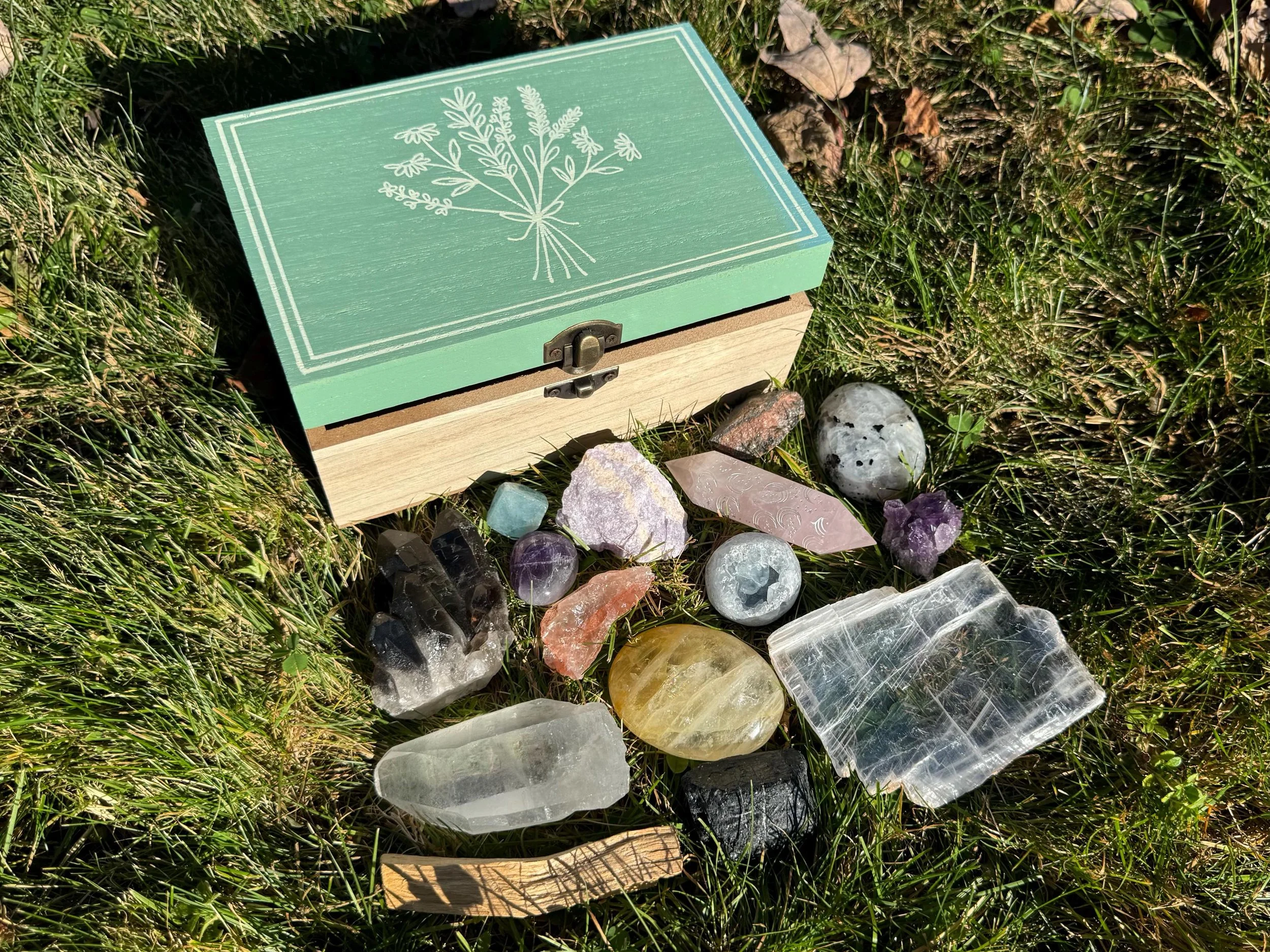 Wooden Box with Hand Curated Crystal Collection for Stress & Anxiety Relief, Grounding and Protection