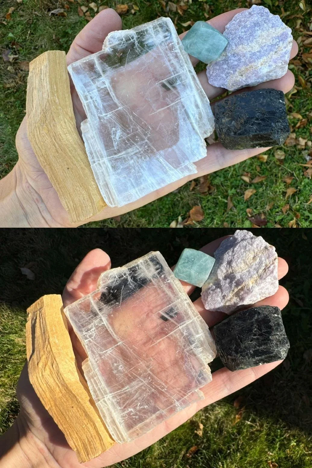 Crystal Box Set for Stress Relief: Lemurian Quartz, Smoky Quartz Cluster, Amethyst, Lepidolite, Selenite, Rainbow Moonstone, Aquamarine,