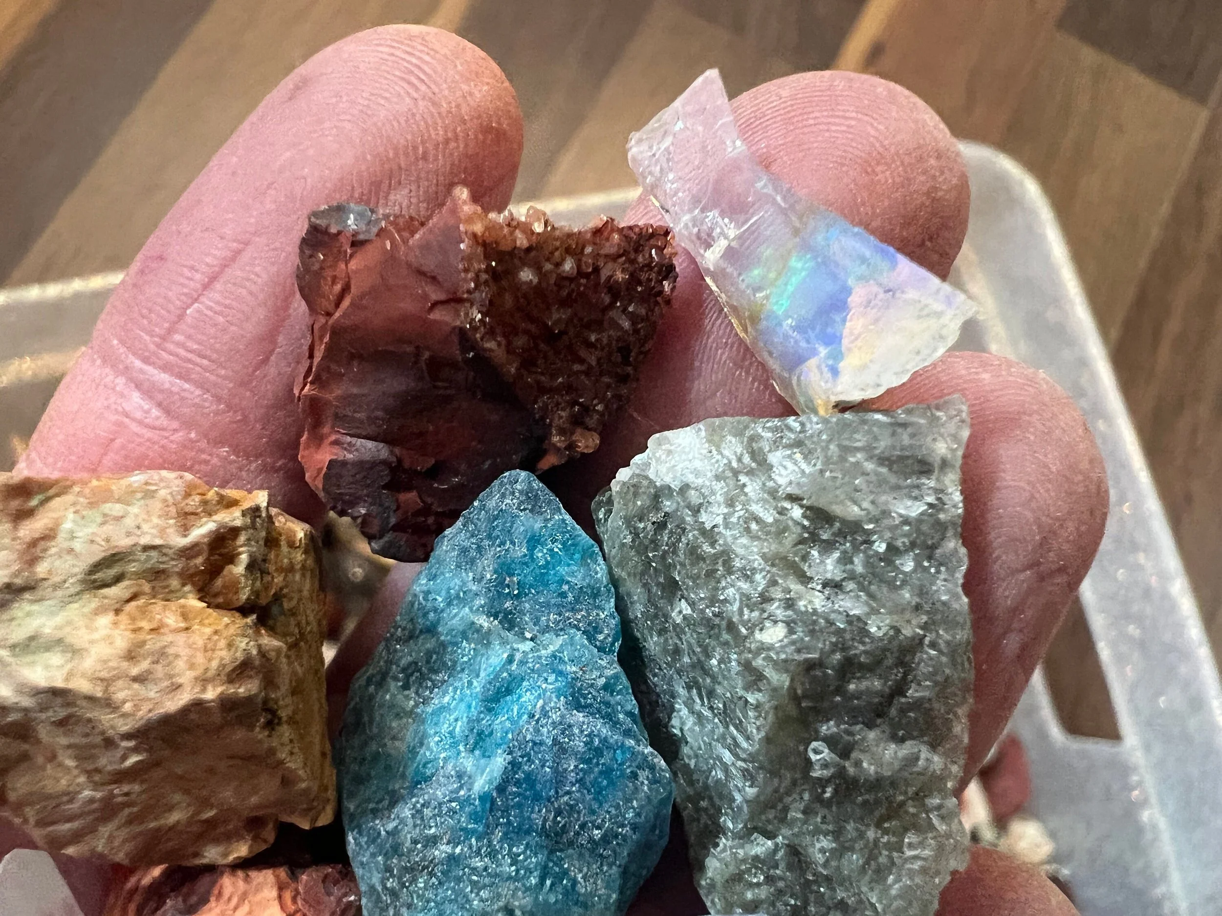 Currently there are garnets, blue Celestite, blue Apatite, Obsidians, opals, Labradorite, agate, jaspers, Carnelian, multiple kinds of Amethyst, black amber, amazonite, epidote, calcites, fluorite, lepidolite, feldspars, different types of Quartz, black tourmaline, and more.