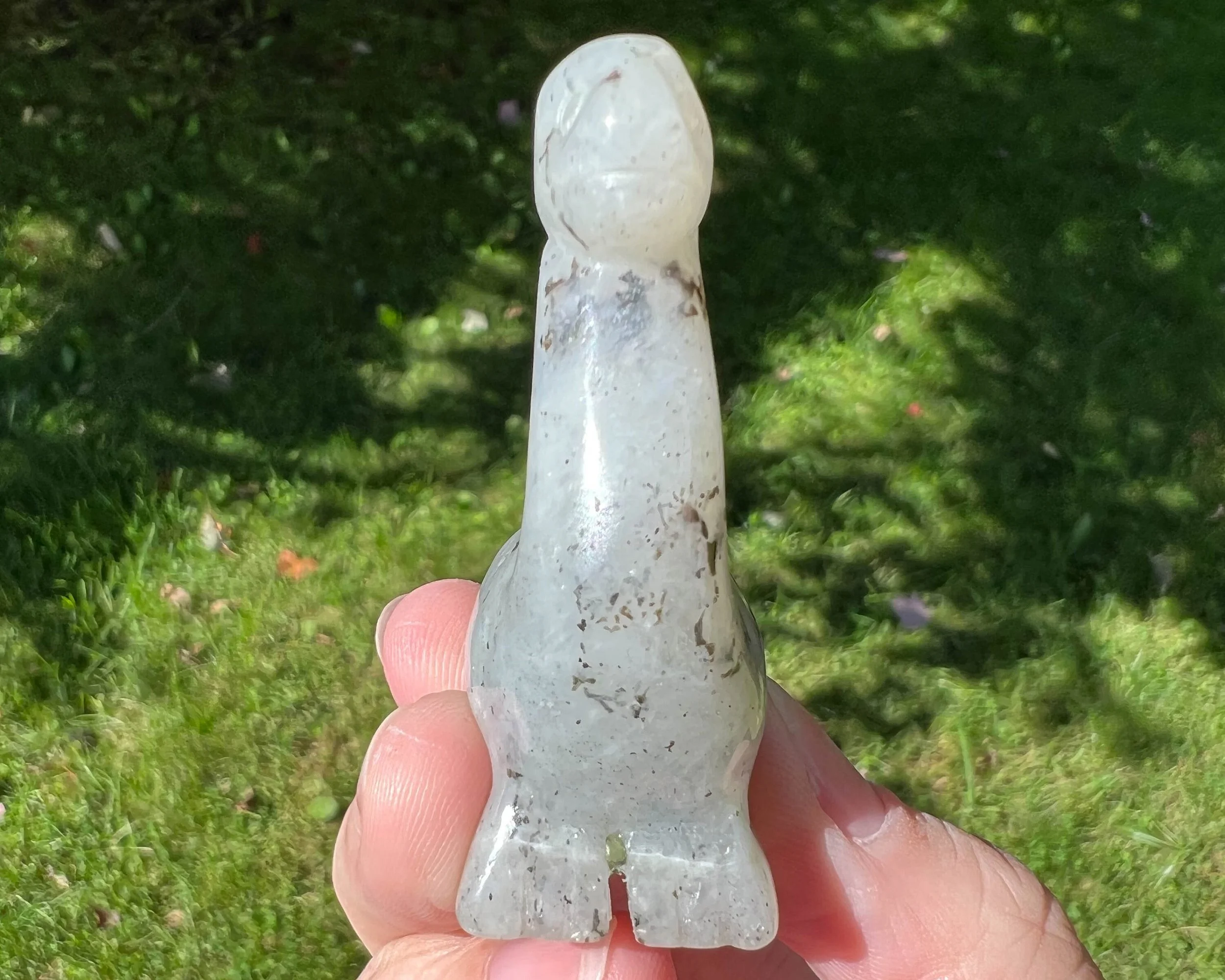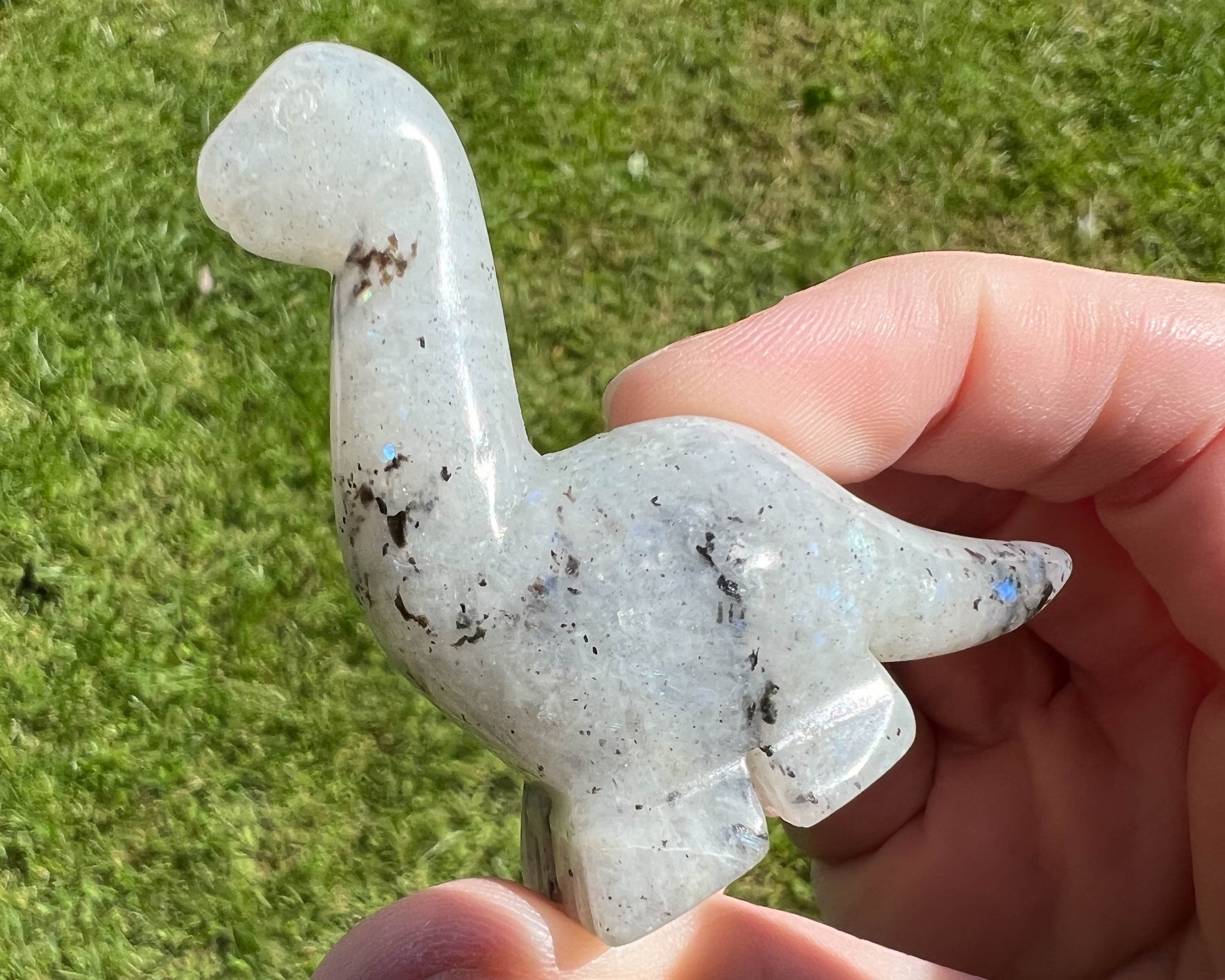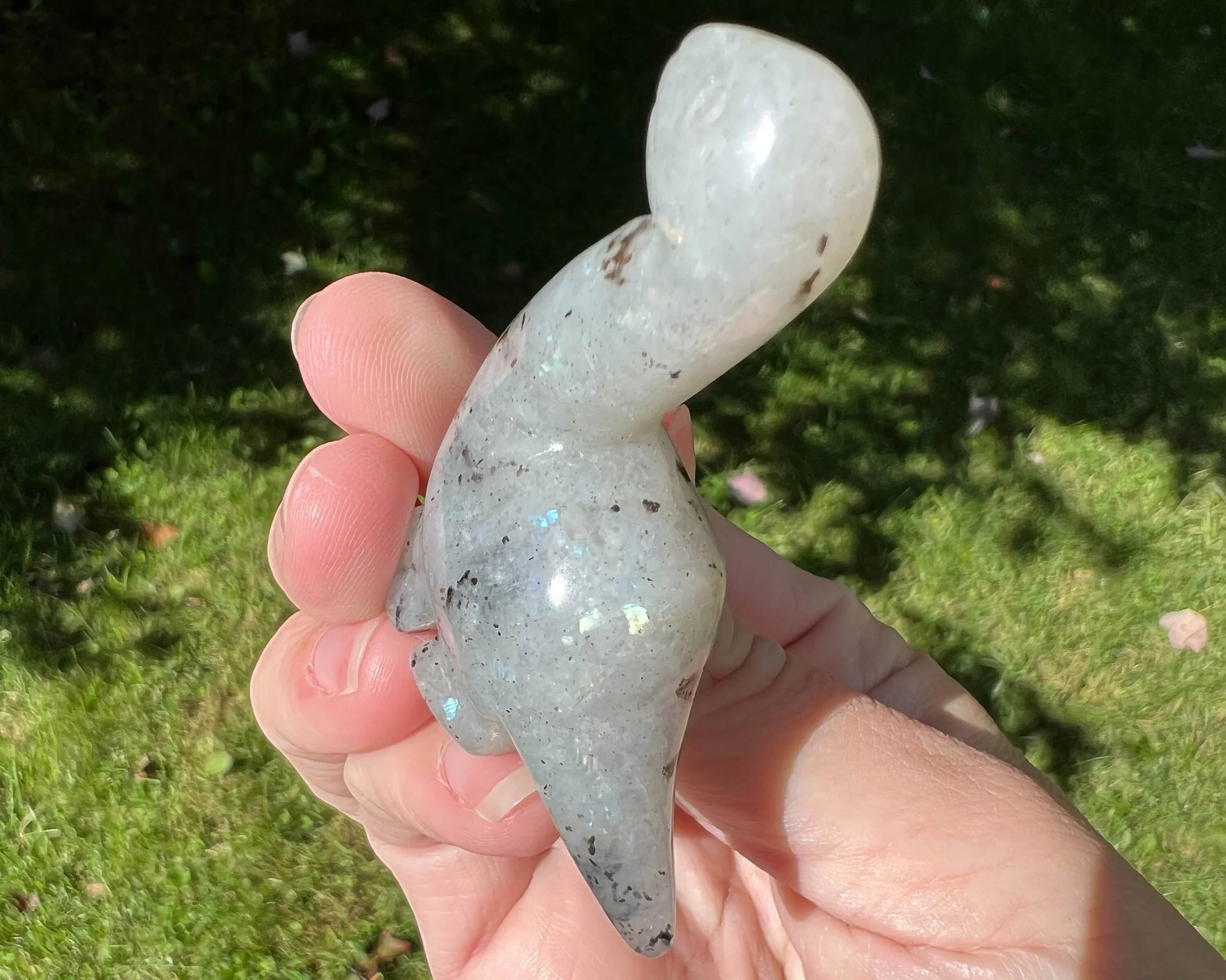 This is a beautiful carving of a brontosaurus or brachiosaurus. It is made of beautiful flashy Labradorite. This Dino has a light blue gray color overall with little flashes of blue and green all over. It has some darker inclusions that appear almost like dendrites inside the stone. A very cute little dinosaur figure with eyes and mouth carved in, very simple shape and great flash.