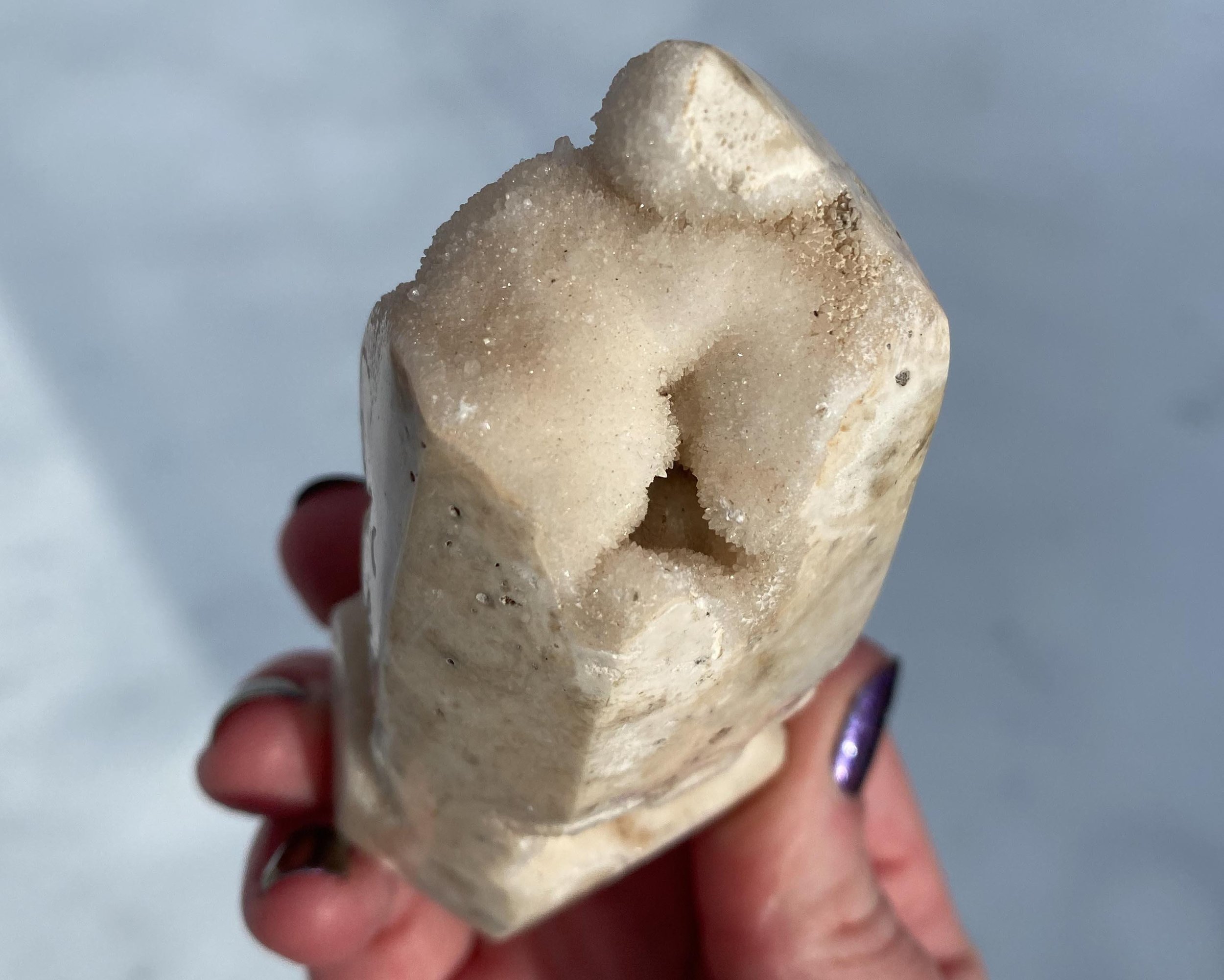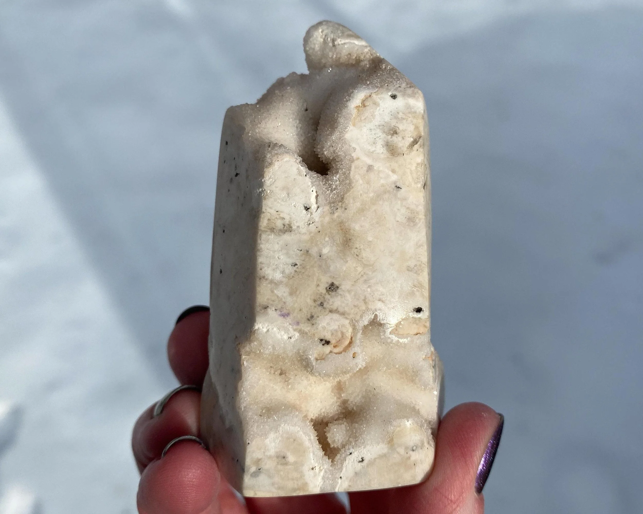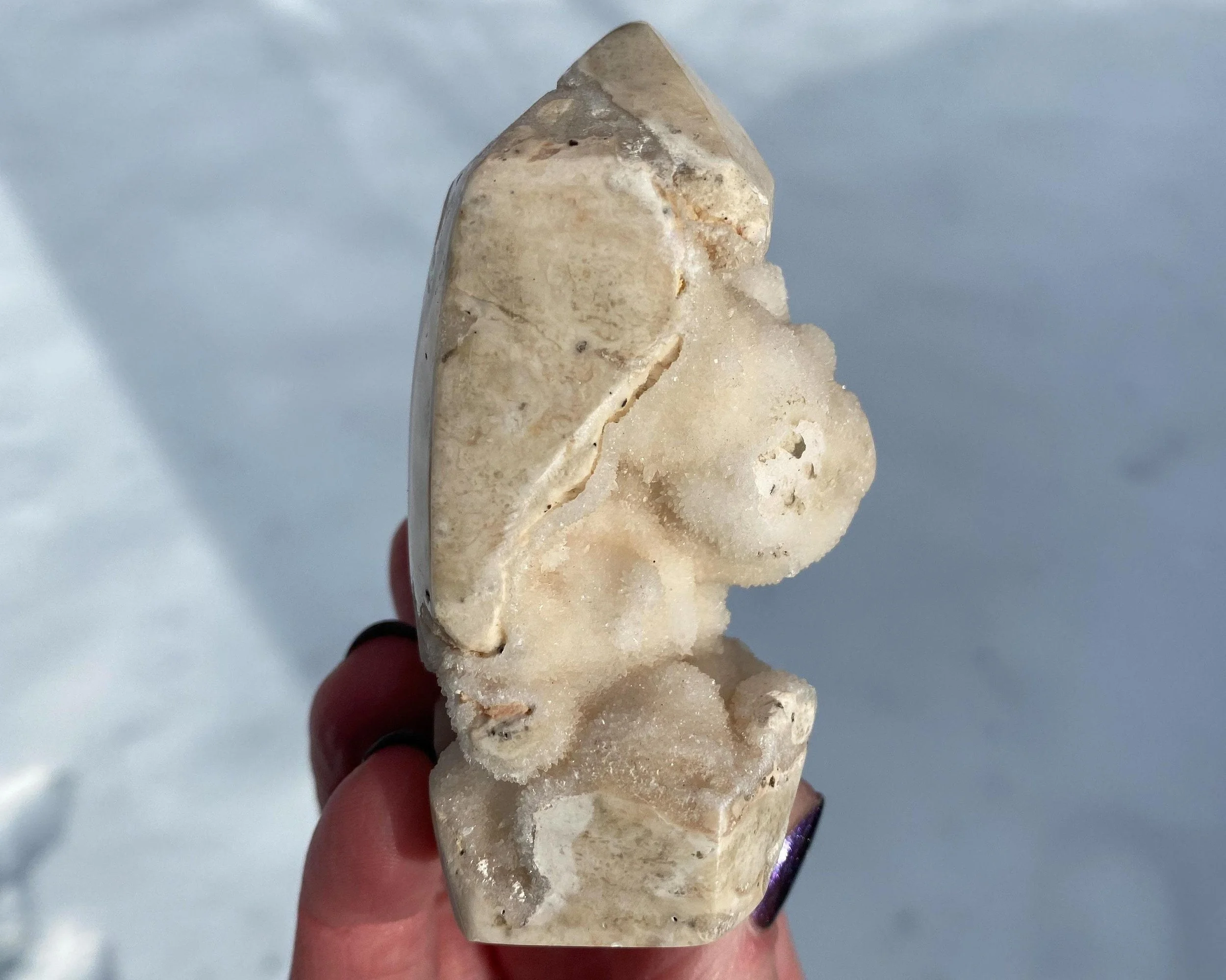 This is a wonderful tower carved from sparkly druzy Quartz covering either Chalcedony or Agate or perhaps both. It is lumpy and bumpy and full of funky caves. It is mostly white, mostly natural with some polished spots to shape it into a point. Very cool self standing piece.