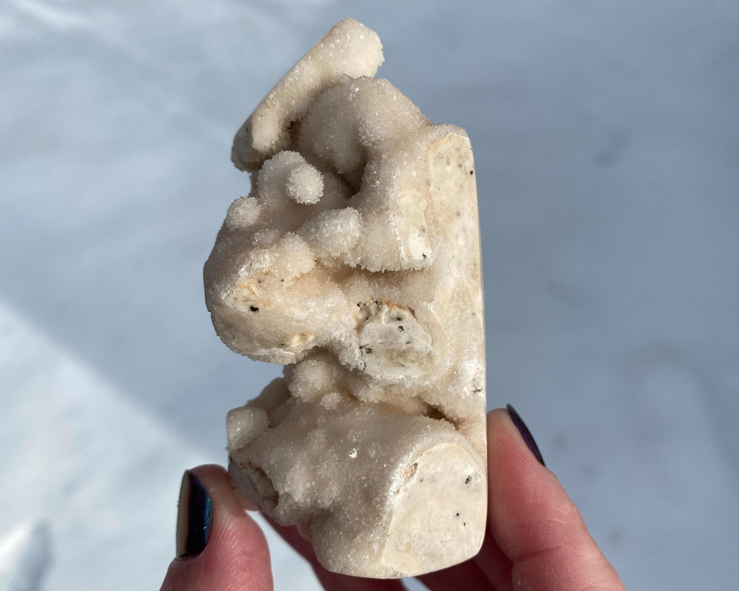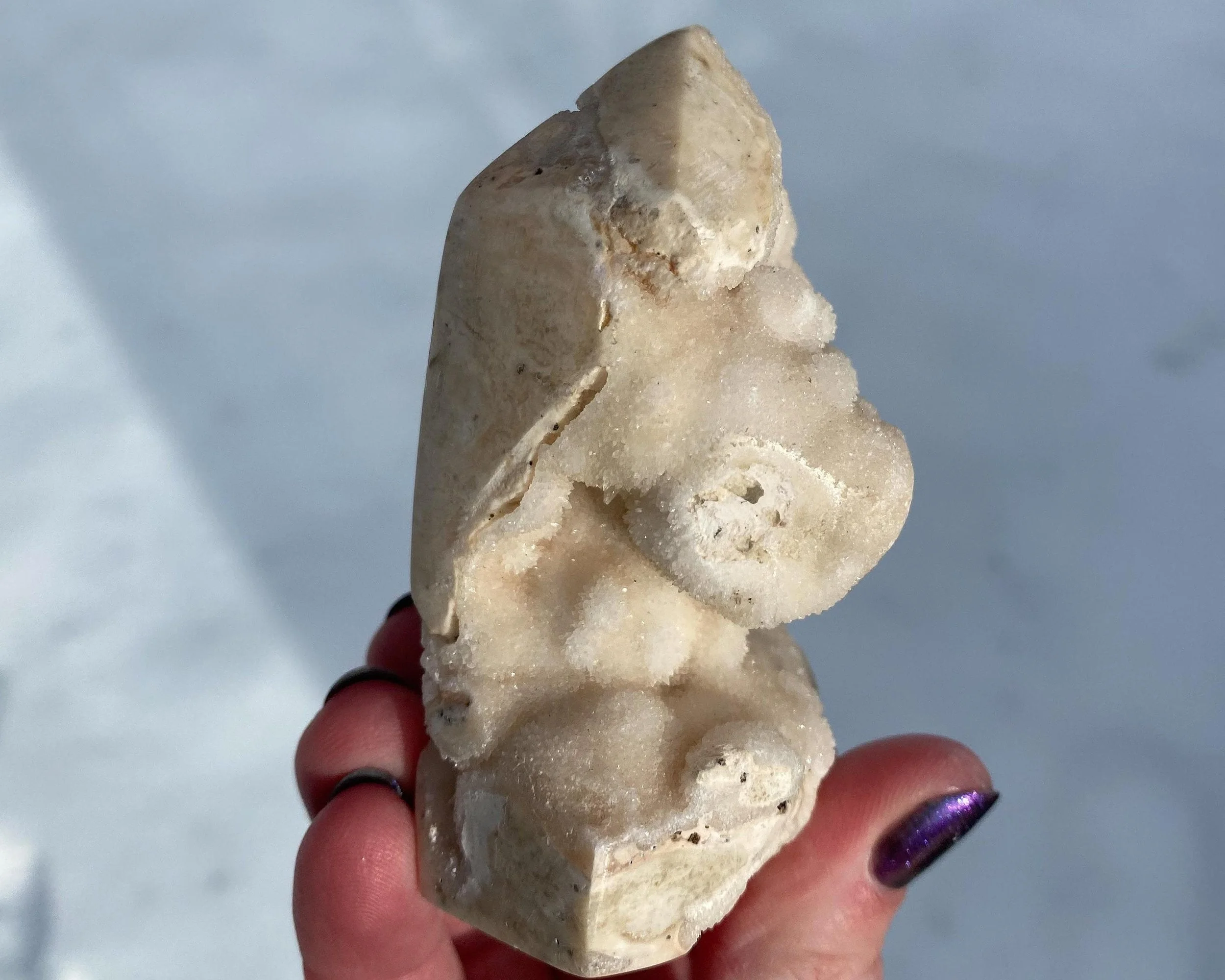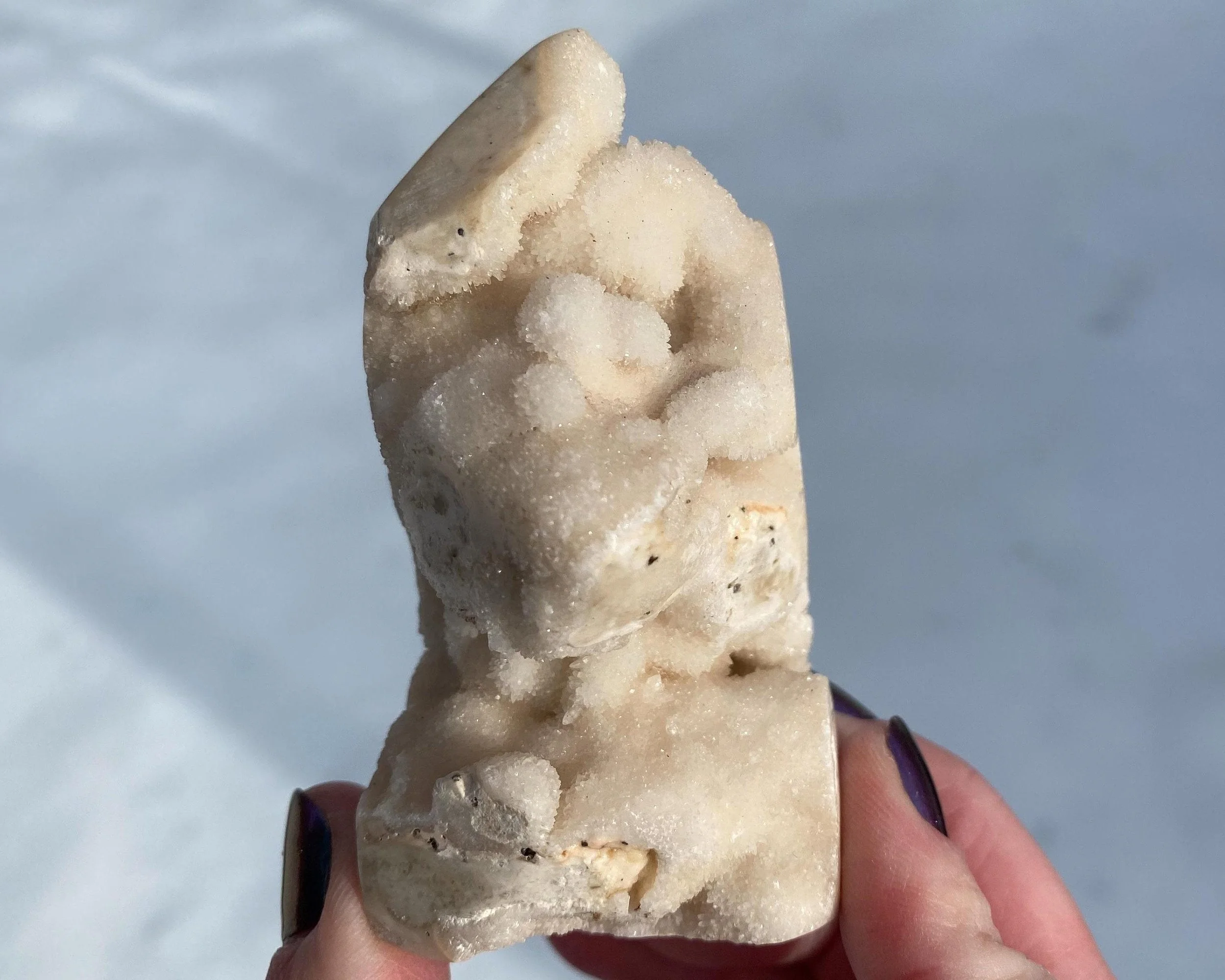 This is a wonderful tower carved from sparkly druzy Quartz covering either Chalcedony or Agate or perhaps both. It is lumpy and bumpy and full of funky caves. It is mostly white, mostly natural with some polished spots to shape it into a point. Very cool self standing piece.