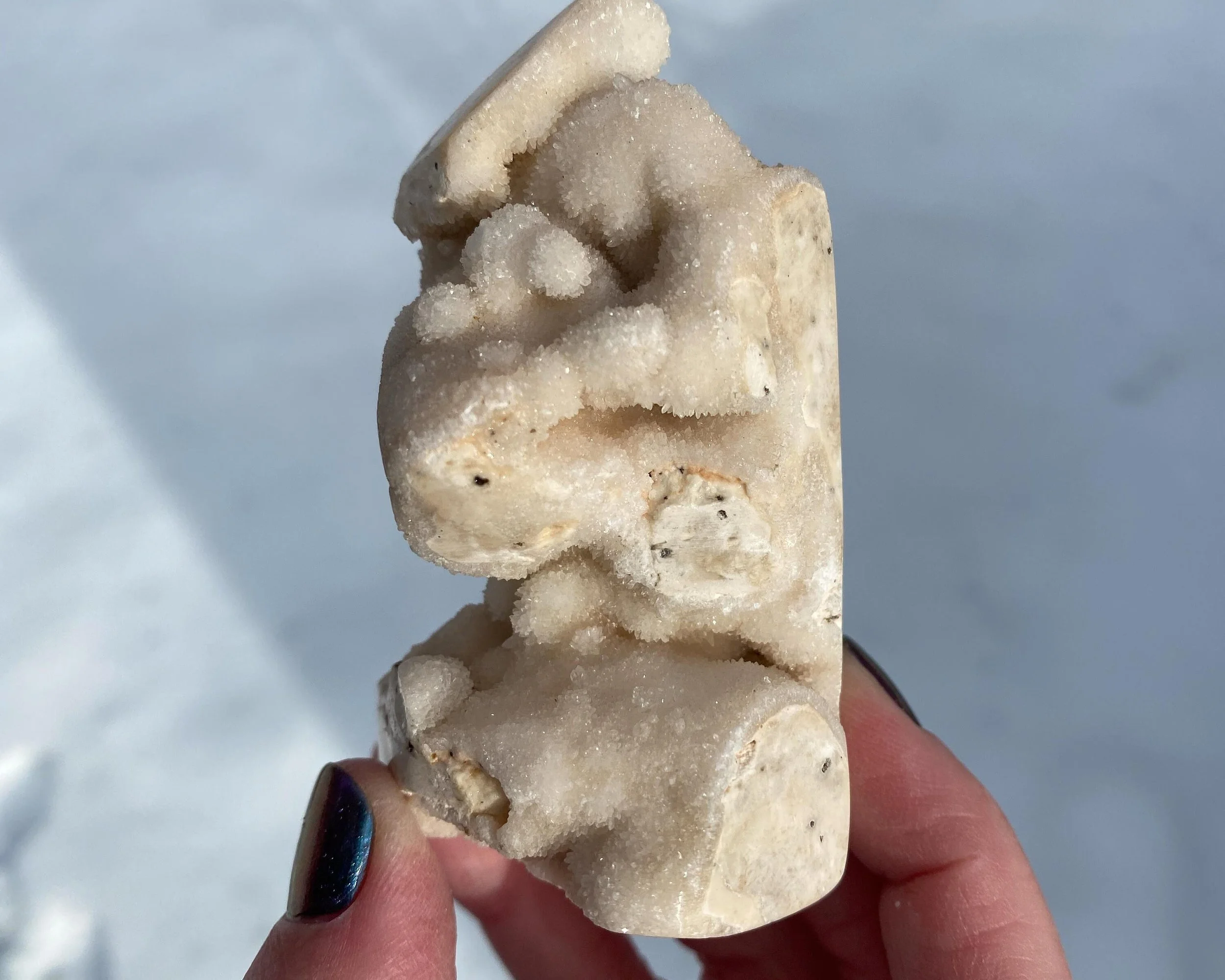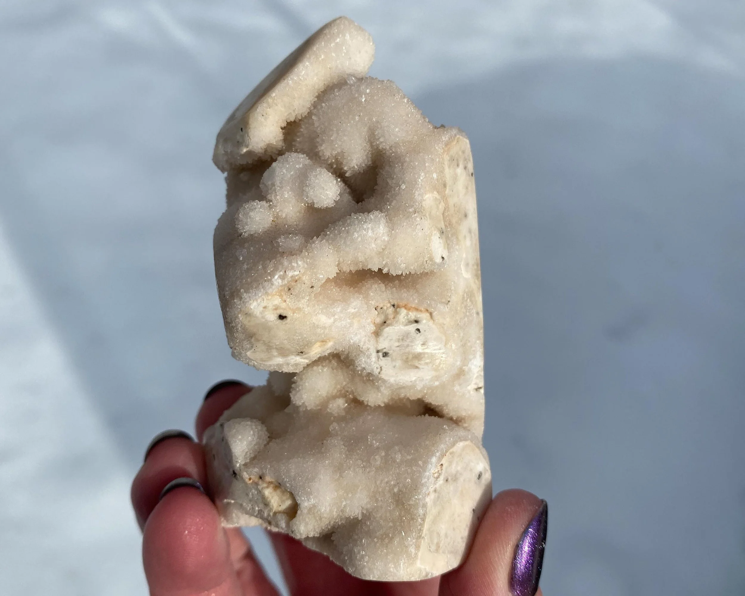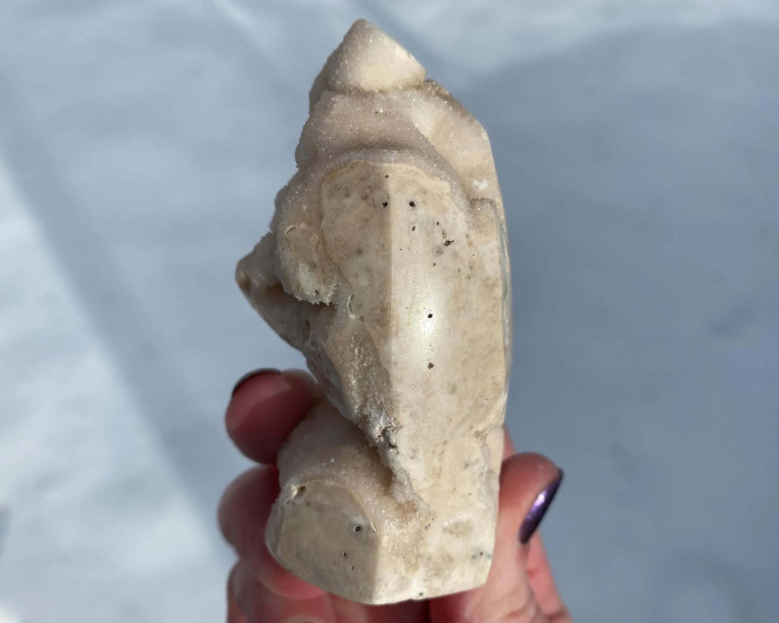 This is a wonderful tower carved from sparkly druzy Quartz covering either Chalcedony or Agate or perhaps both. It is lumpy and bumpy and full of funky caves. It is mostly white, mostly natural with some polished spots to shape it into a point. Very cool self standing piece.