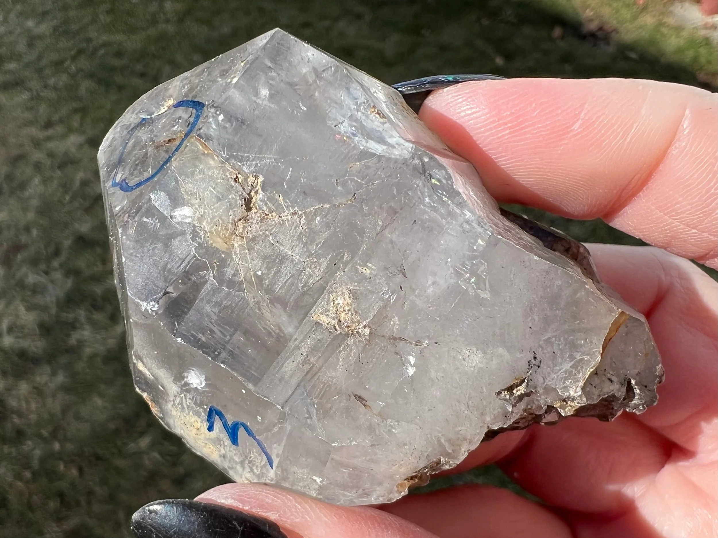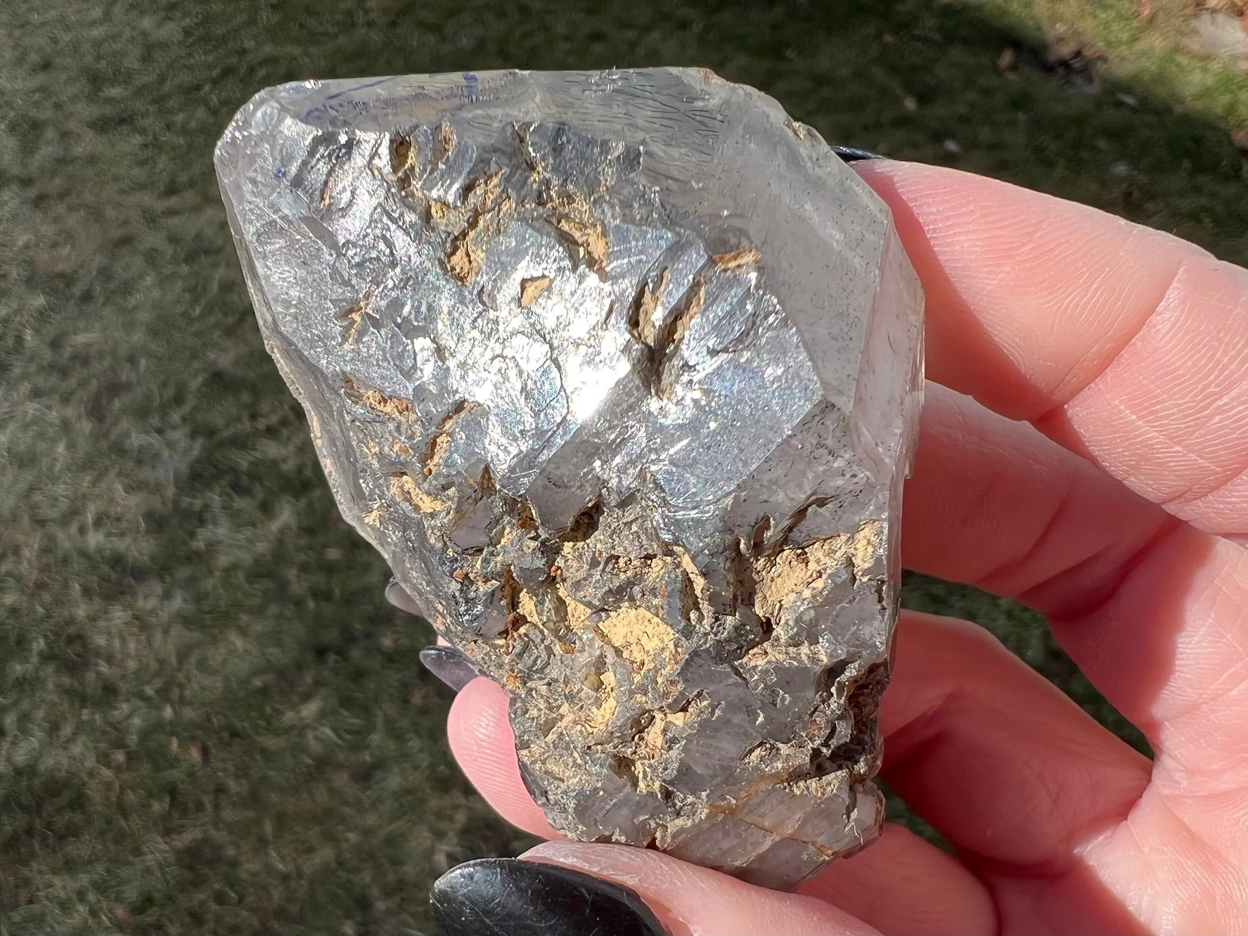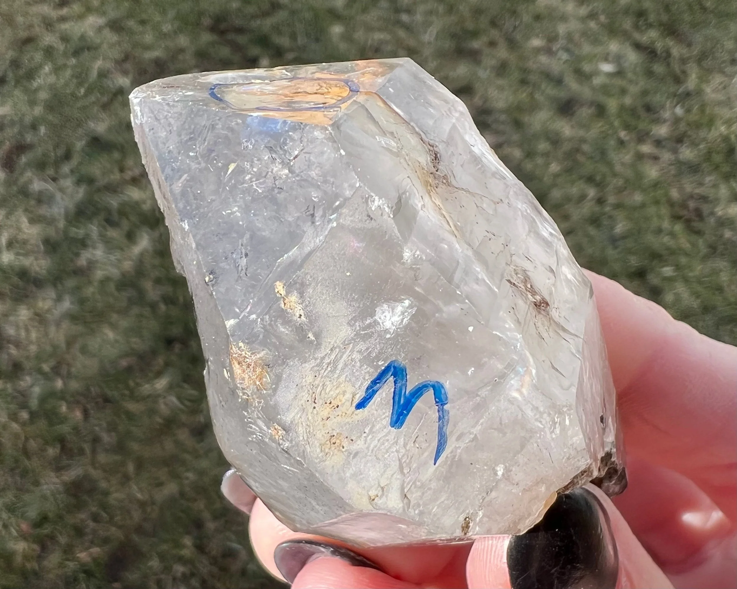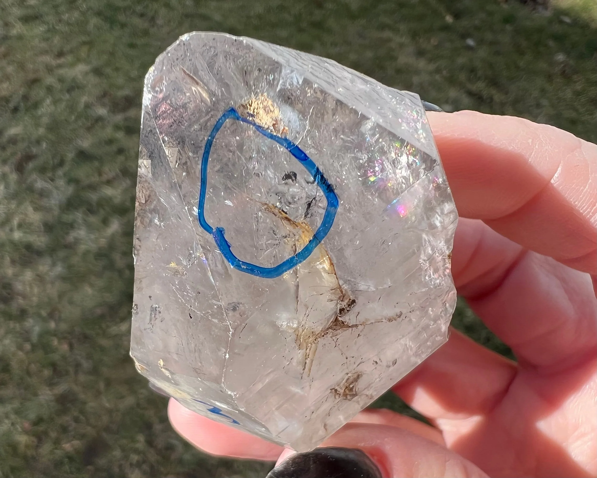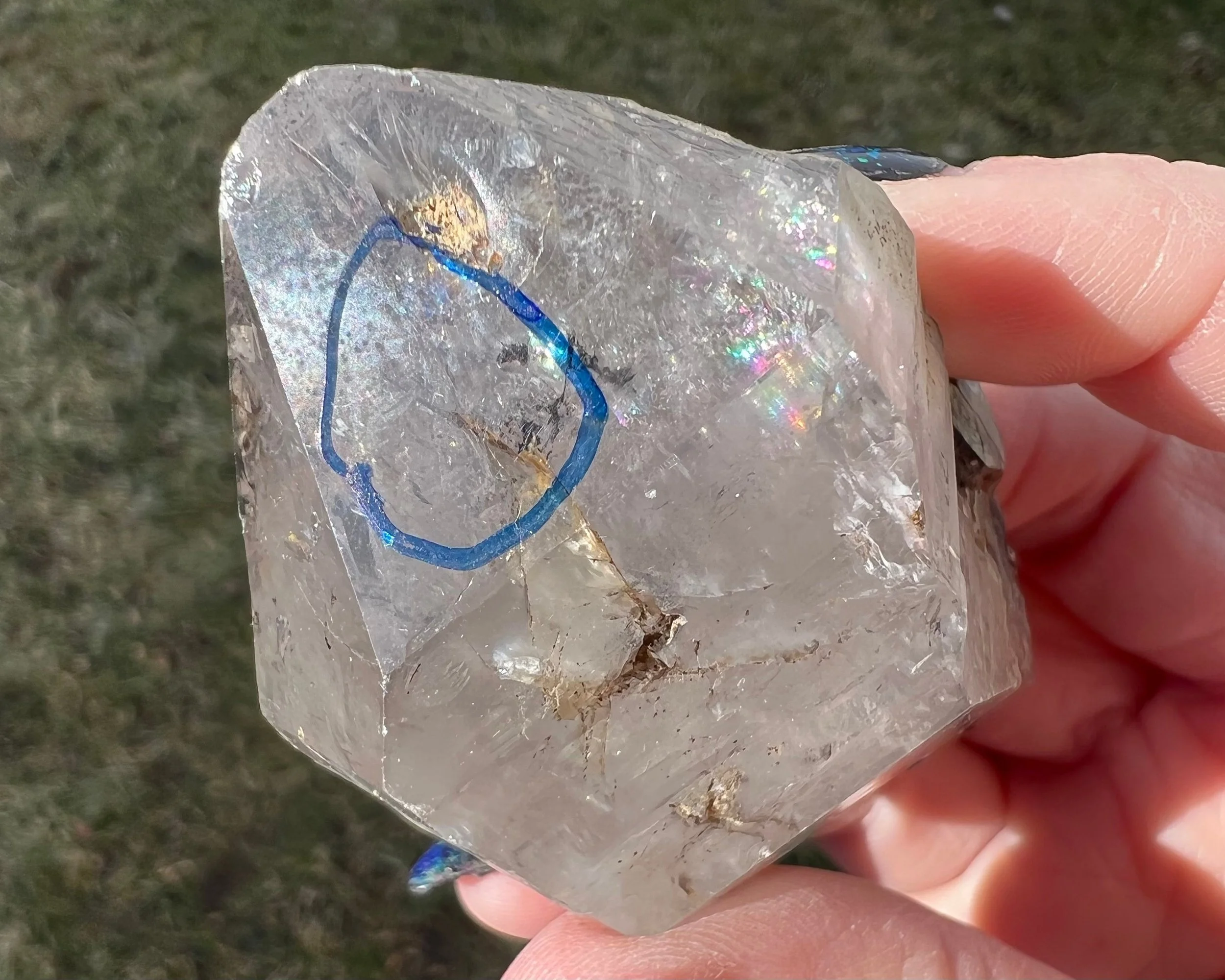 This is an awesome enhydro Quartz crystal with a liquid inclusion with a big moving bubble and black sediment that moves inside. Very cool and they are very easy to see in the clear Quartz. Some great rainbows in there. This is also an elestial crystal with many faces and some Hematite too. A lovely piece for any crystal or science lover!