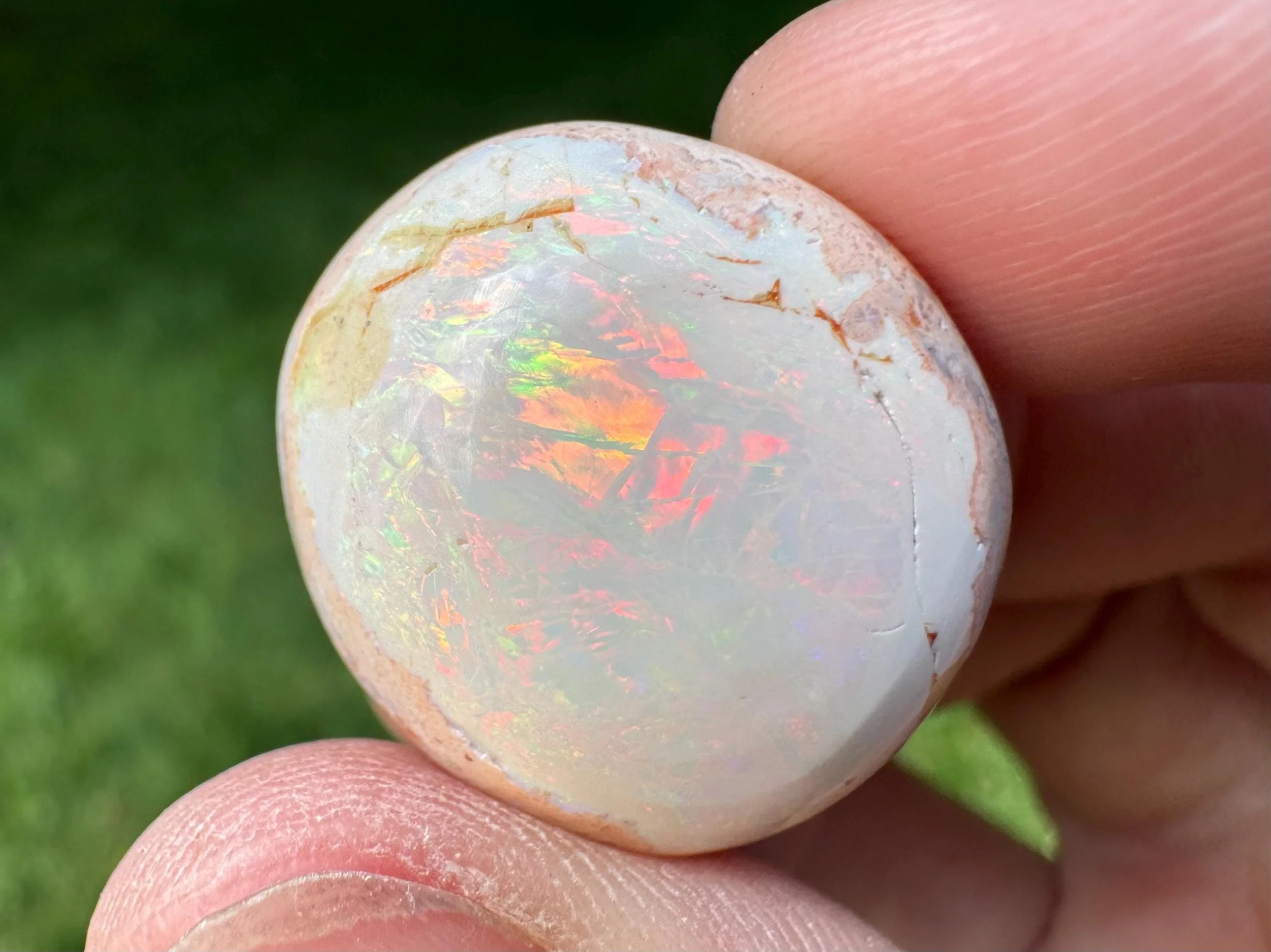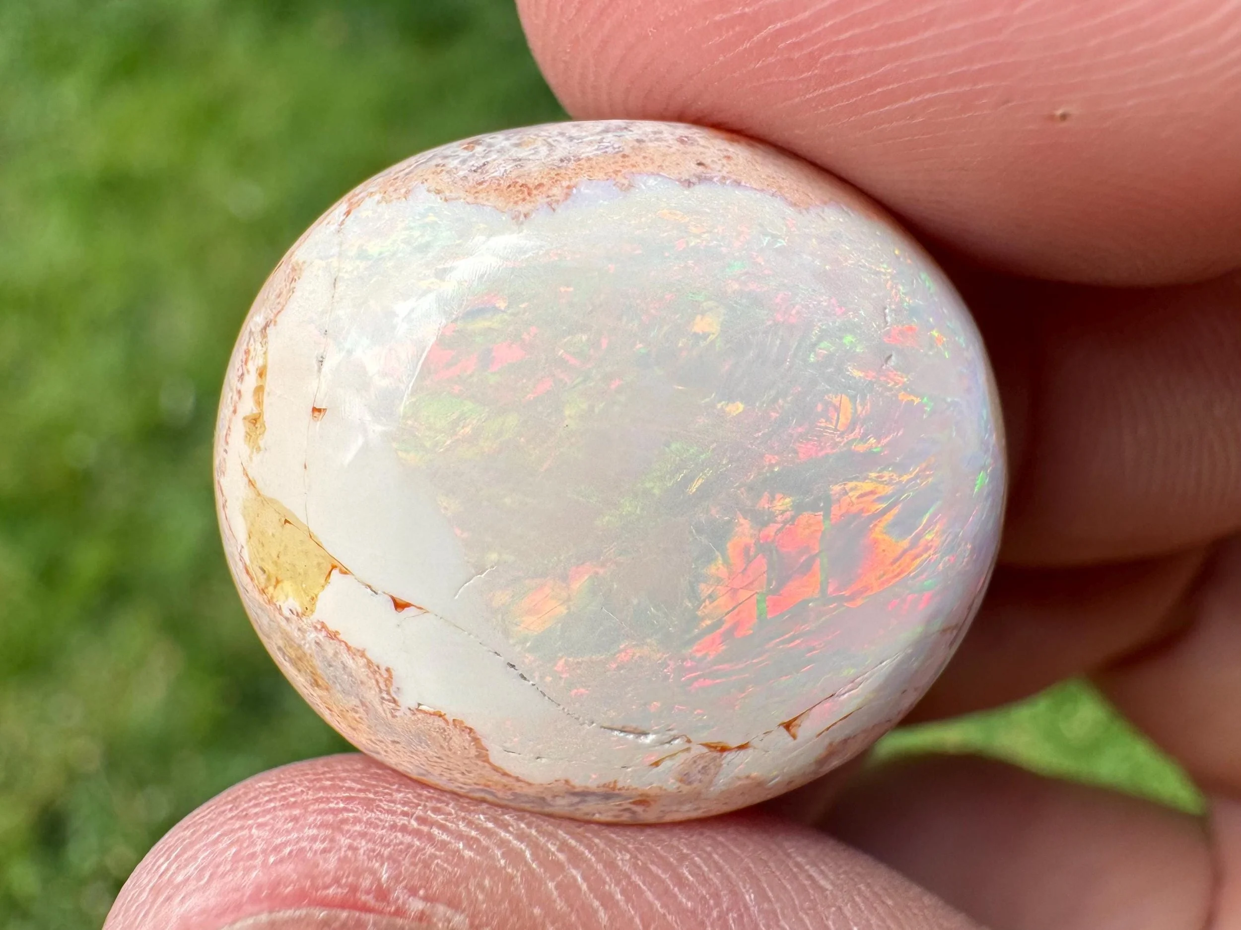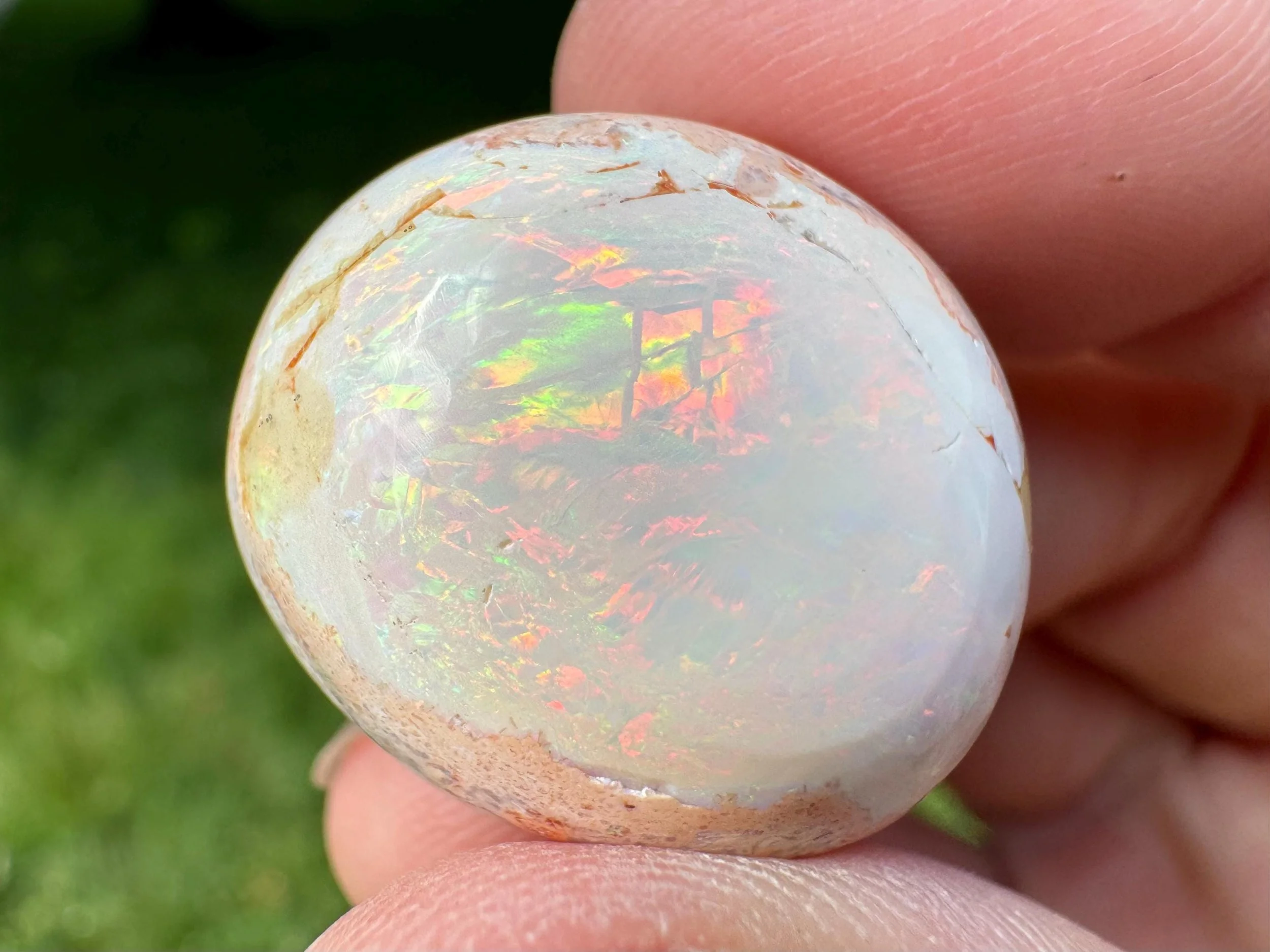 This is a gorgeous Ethiopian Opal Cabochon. It is white precious opal in matrix with bright rainbow flash throughout the entire white opal part, and some light rhyolite matrix on the sides and bottom. The color is bright and beautiful.