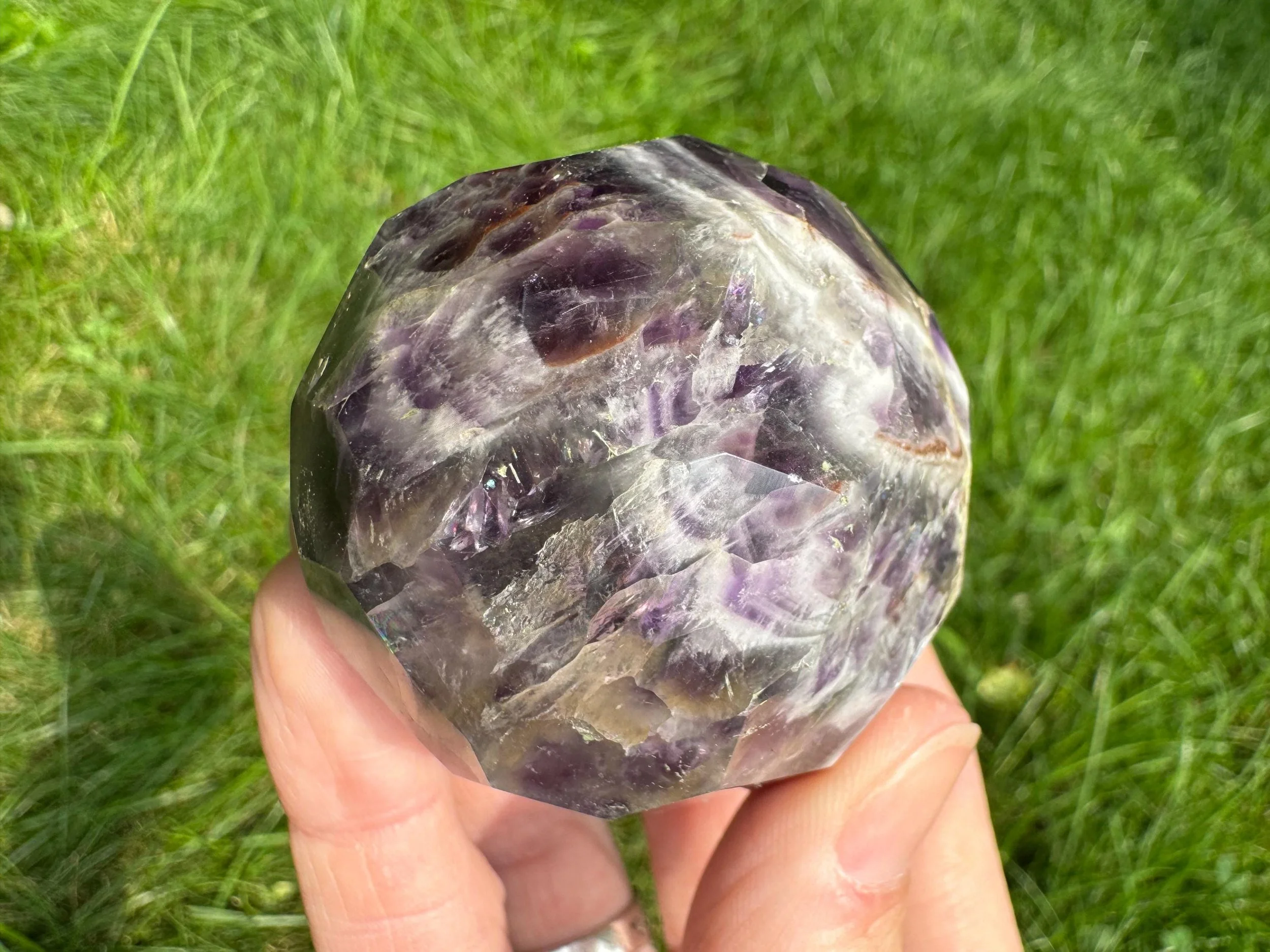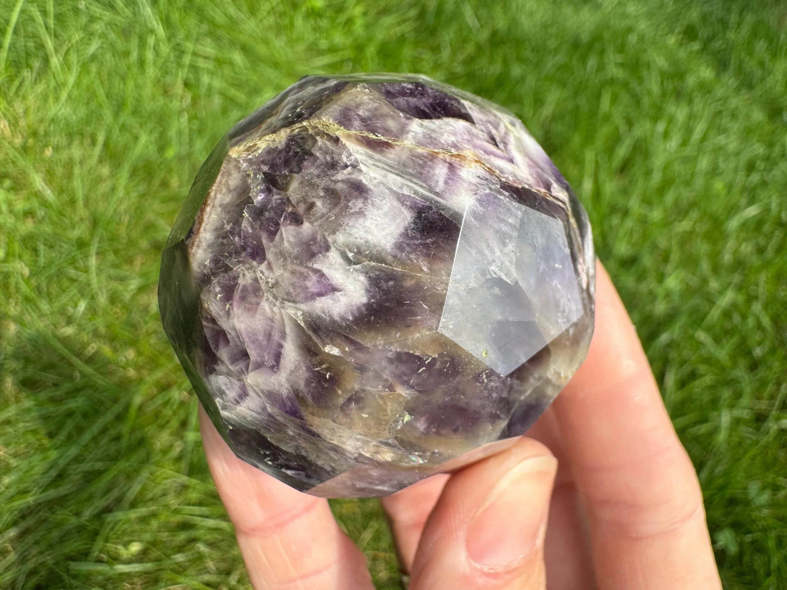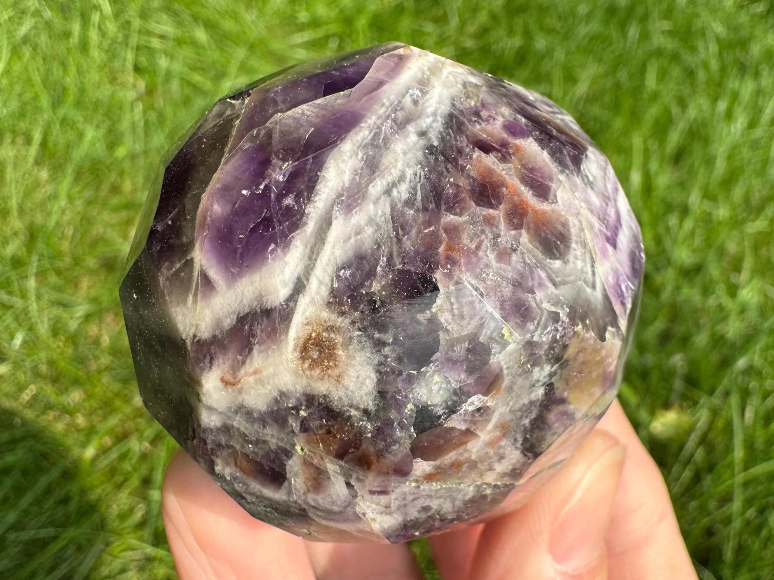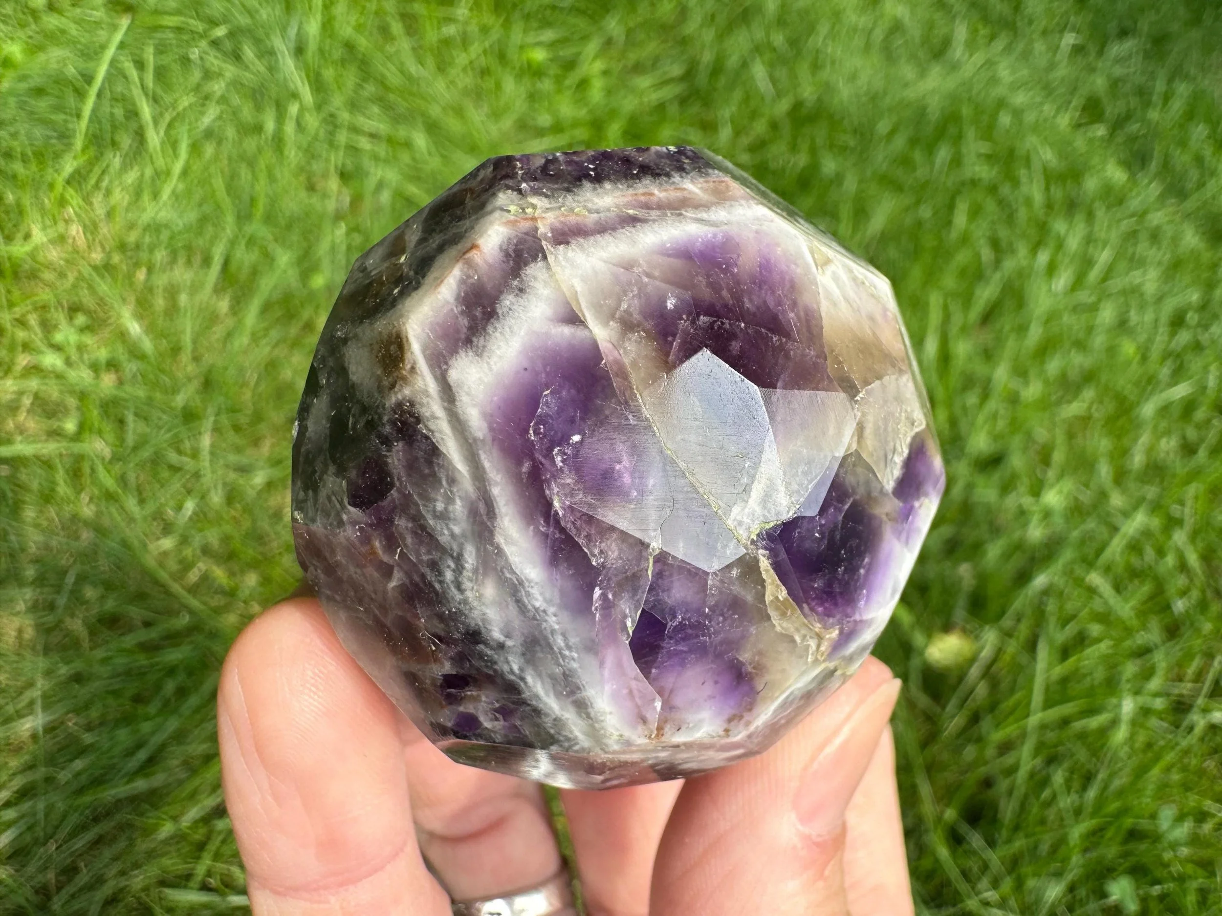 This is natural Chevron Amethyst that has been cut and polished into this funky faceted sphere shape. Each face on the faceted sphere is a pentagon or hexagon, and it stays in place well. A cool and unique crystal carving.