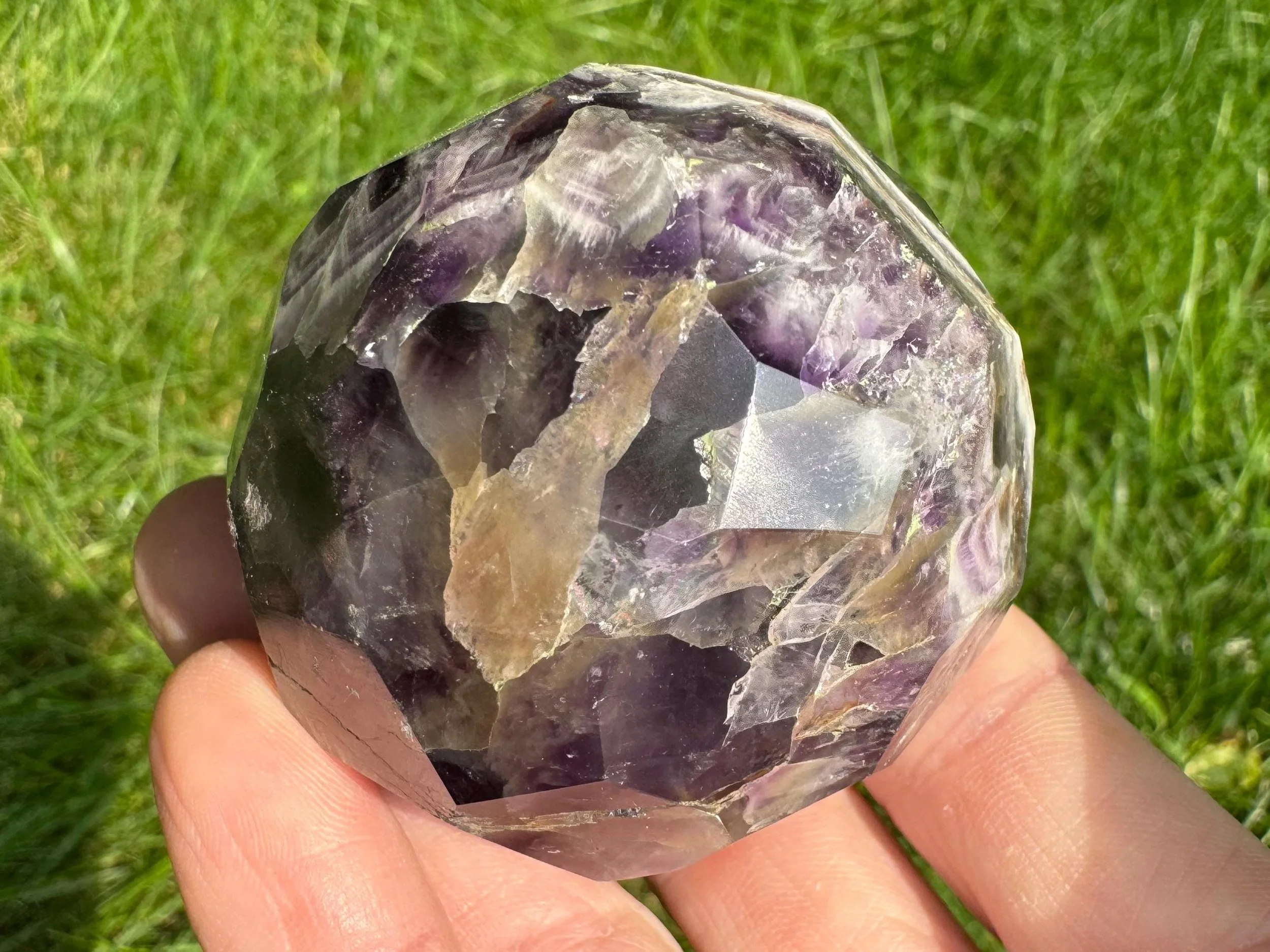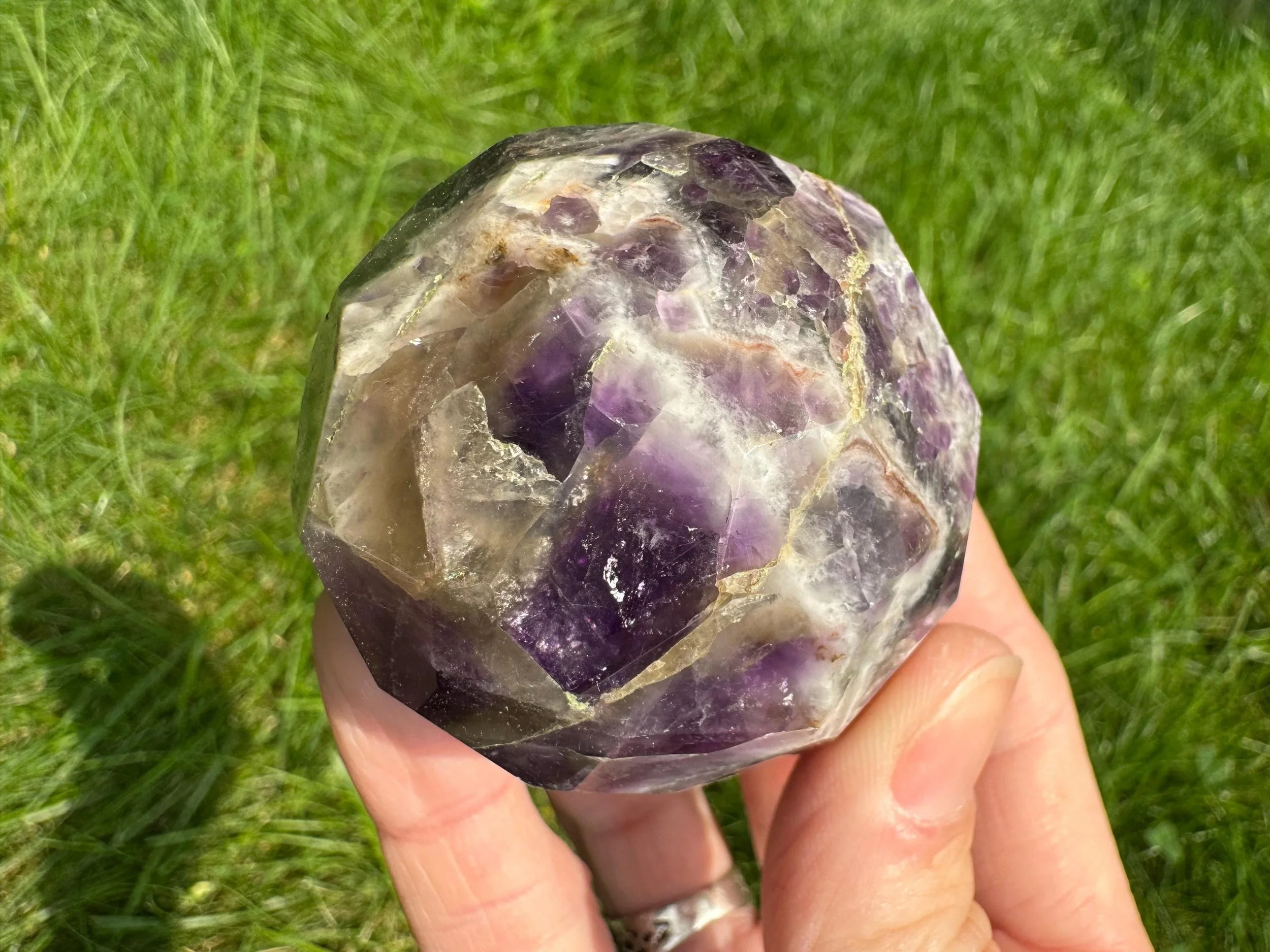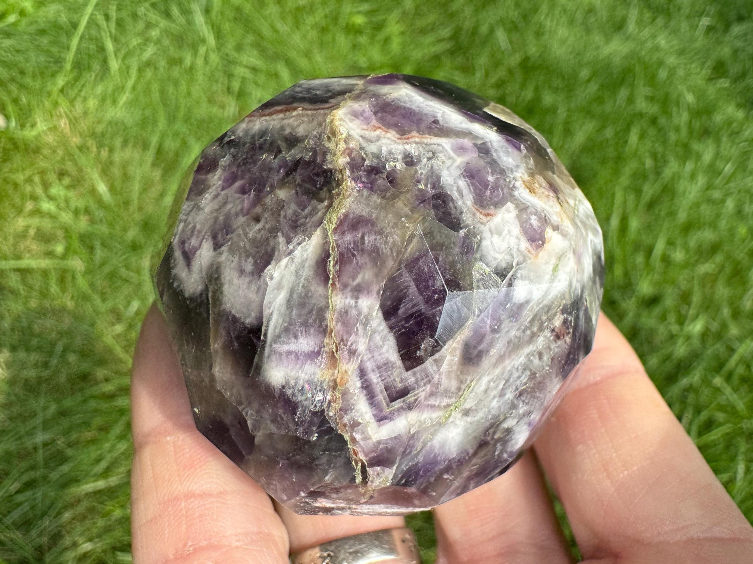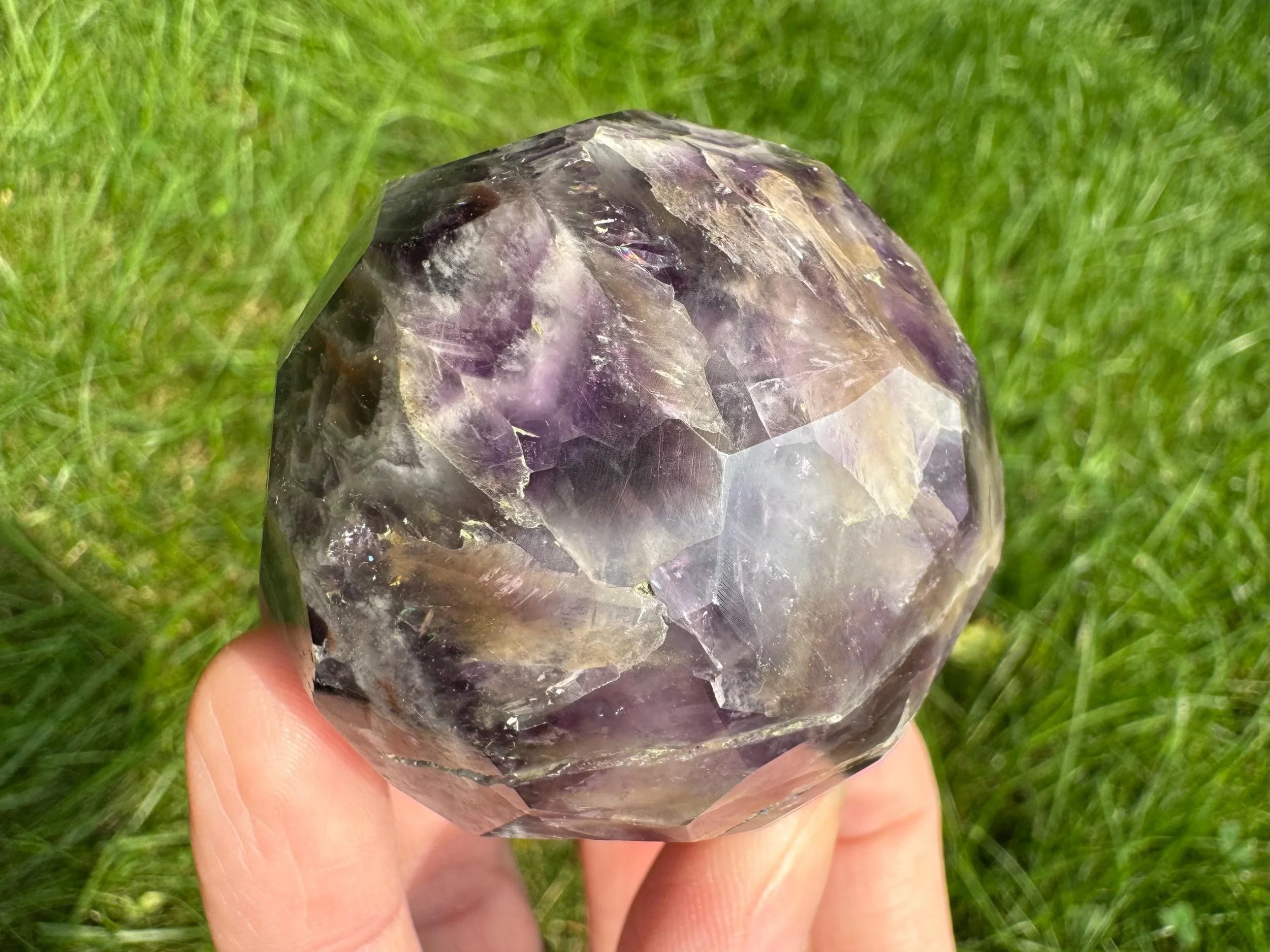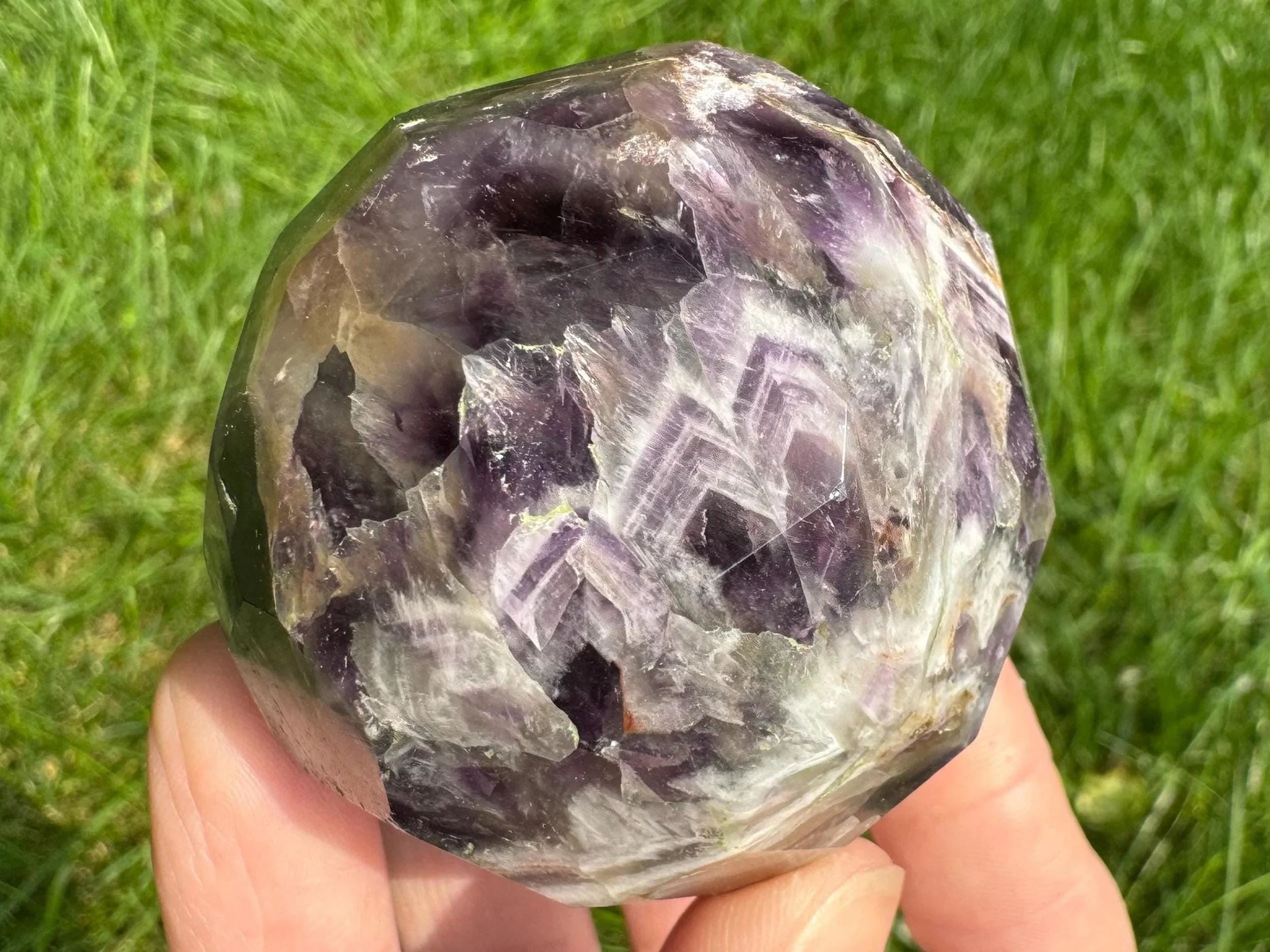 This is natural Chevron Amethyst that has been cut and polished into this funky faceted sphere shape. Each face on the faceted sphere is a pentagon or hexagon, and it stays in place well. A cool and unique crystal carving.