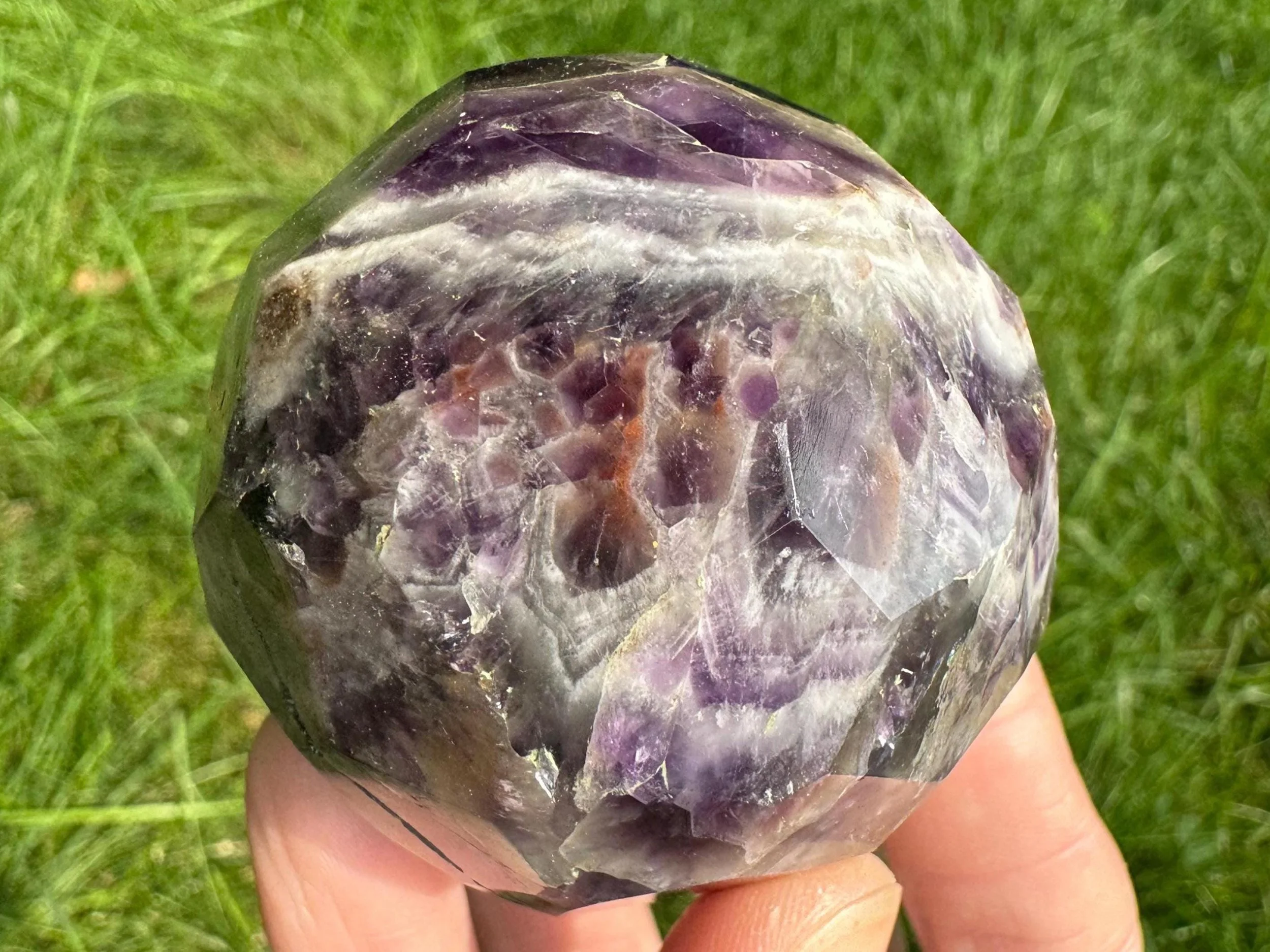 This is natural Chevron Amethyst that has been cut and polished into this funky faceted sphere shape. Each face on the faceted sphere is a pentagon or hexagon, and it stays in place well. A cool and unique crystal carving.