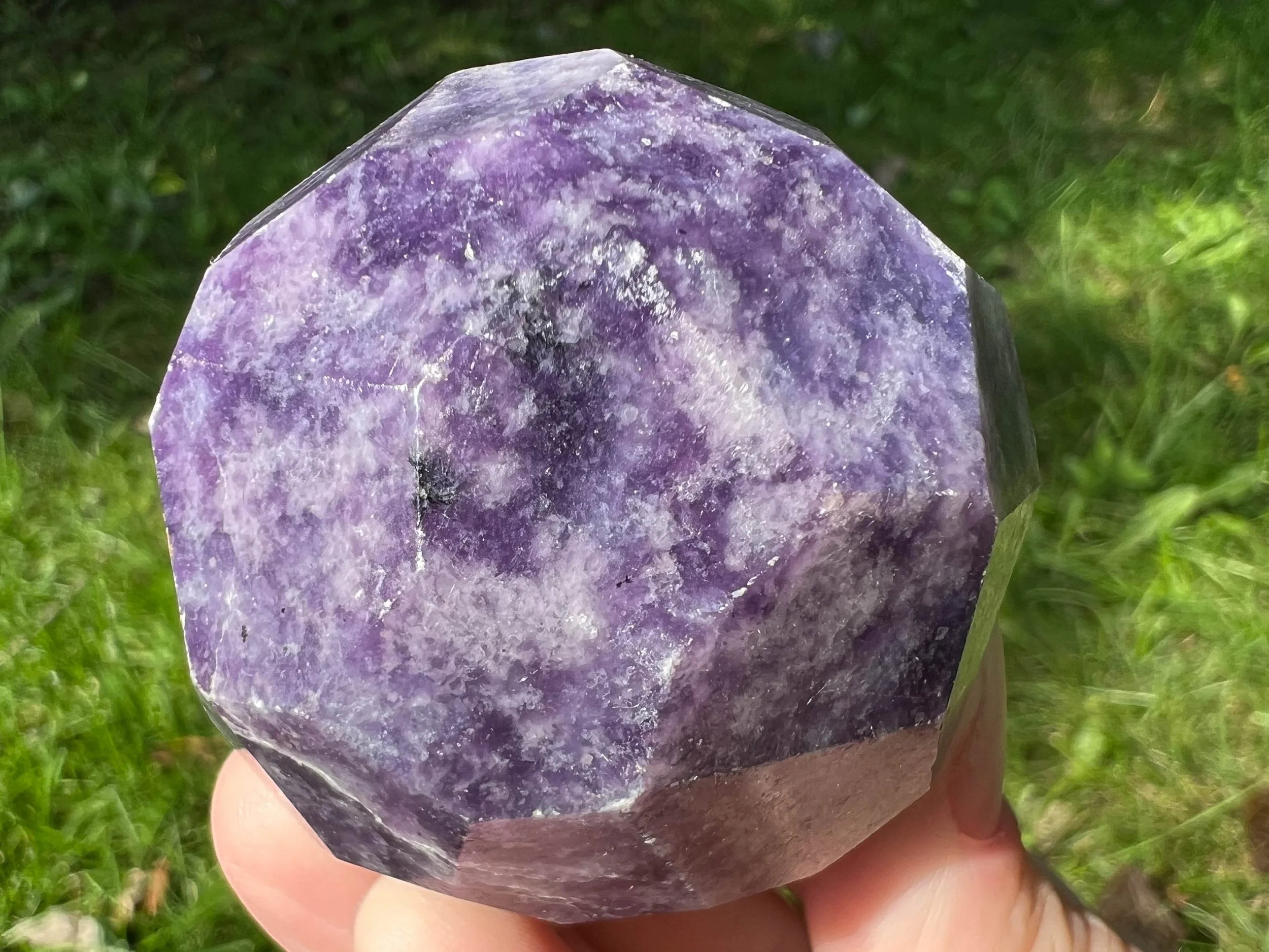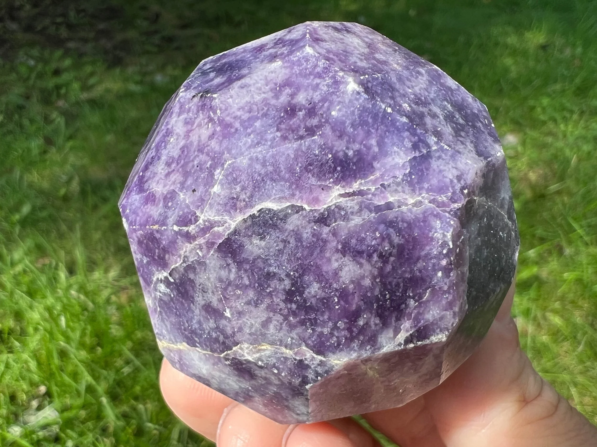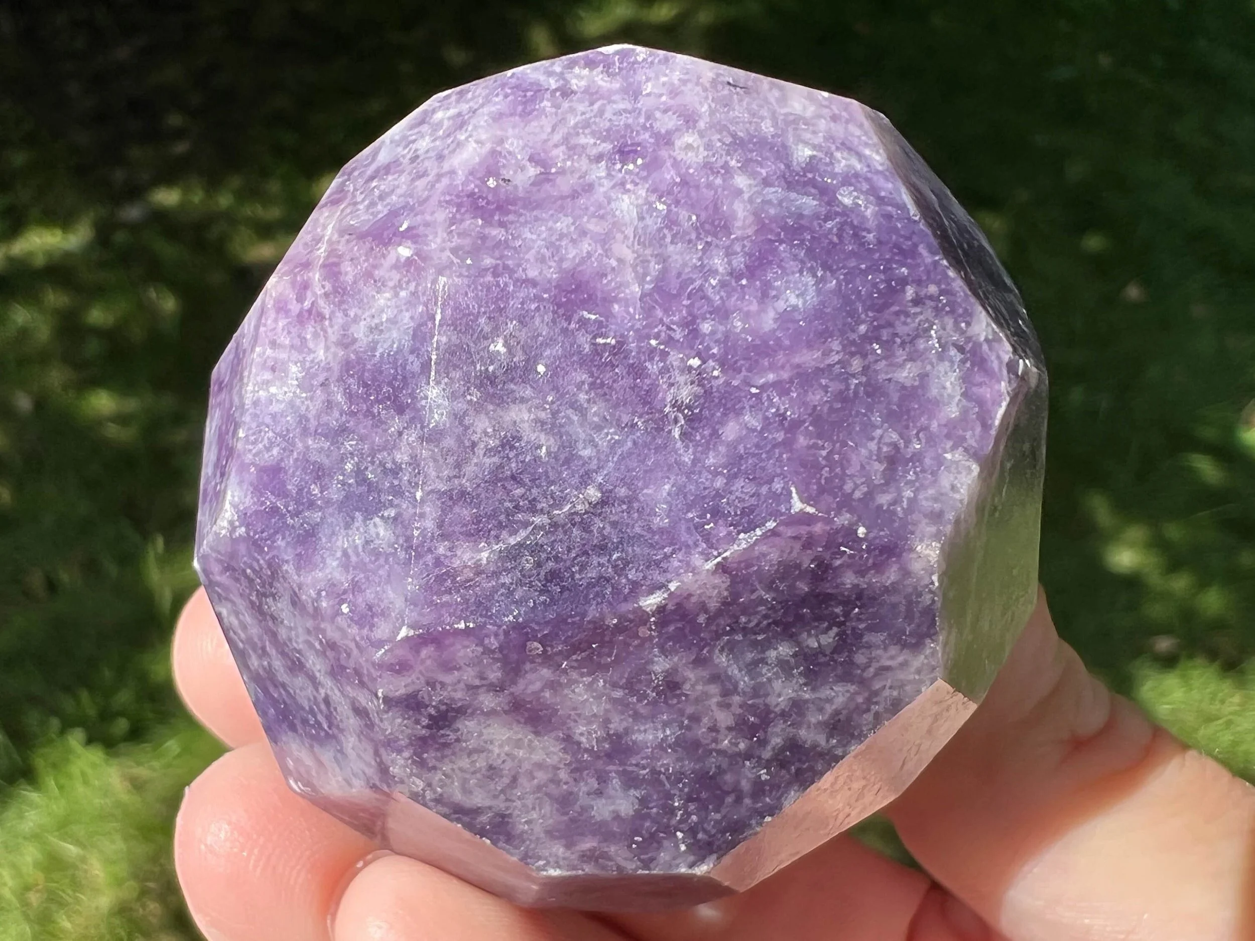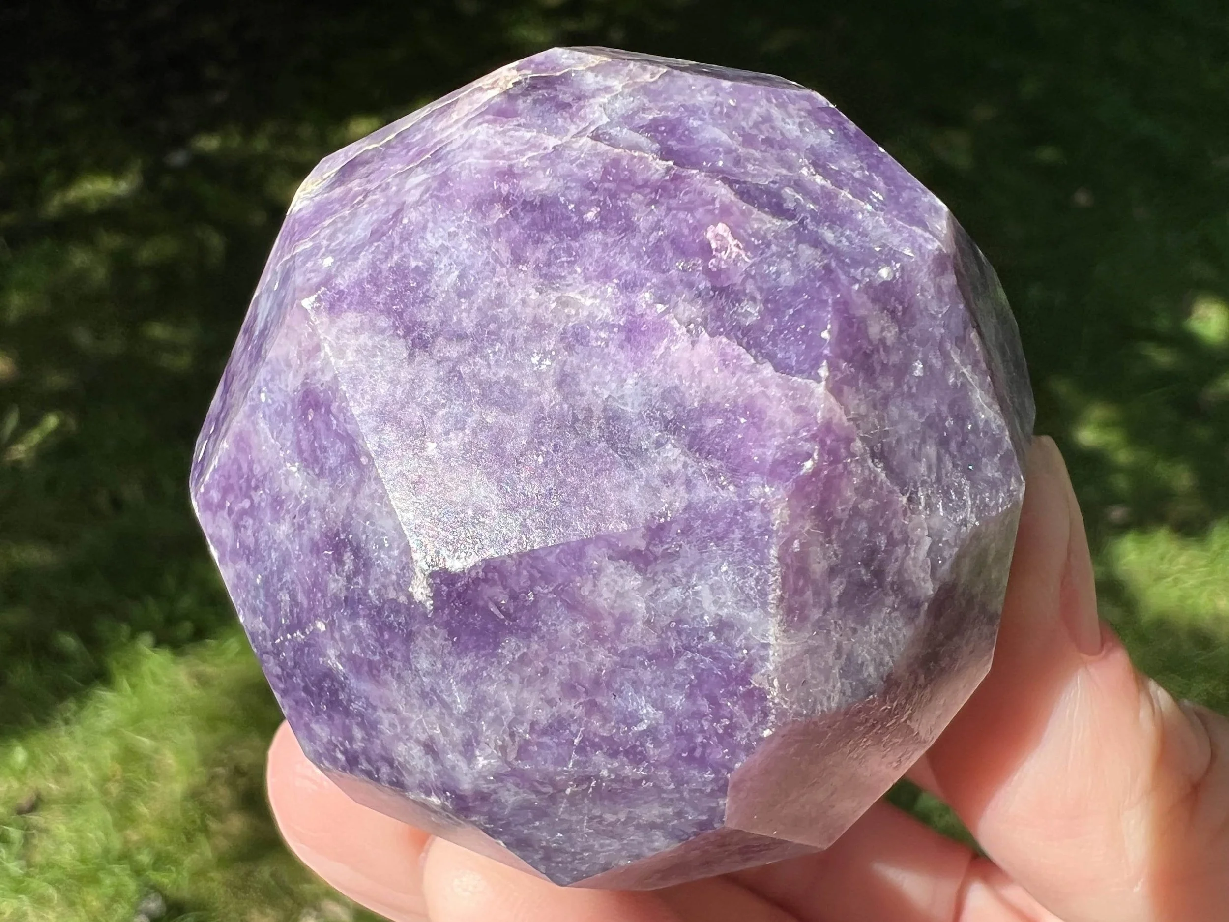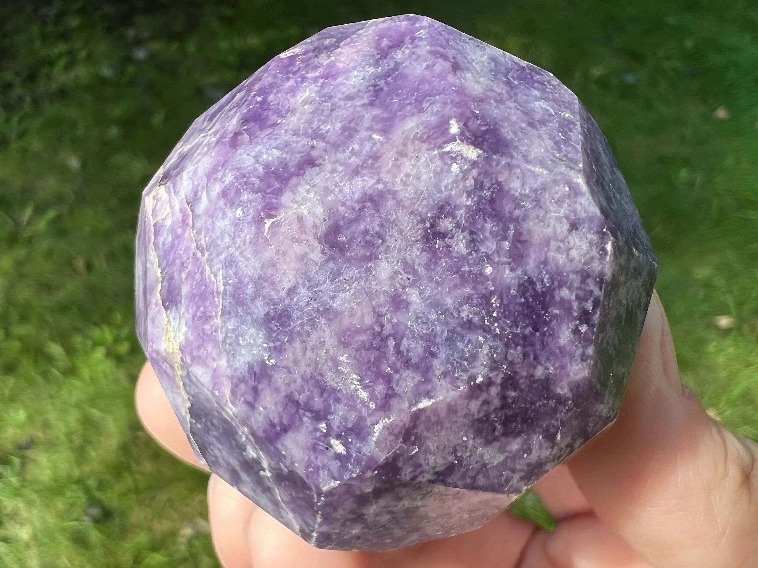 This is natural Lepidolite that has been cut and polished into this funky faceted sphere shape. Each face on the faceted sphere is a pentagon or hexagon, and it stays in place well. A cool and unique crystal carving.