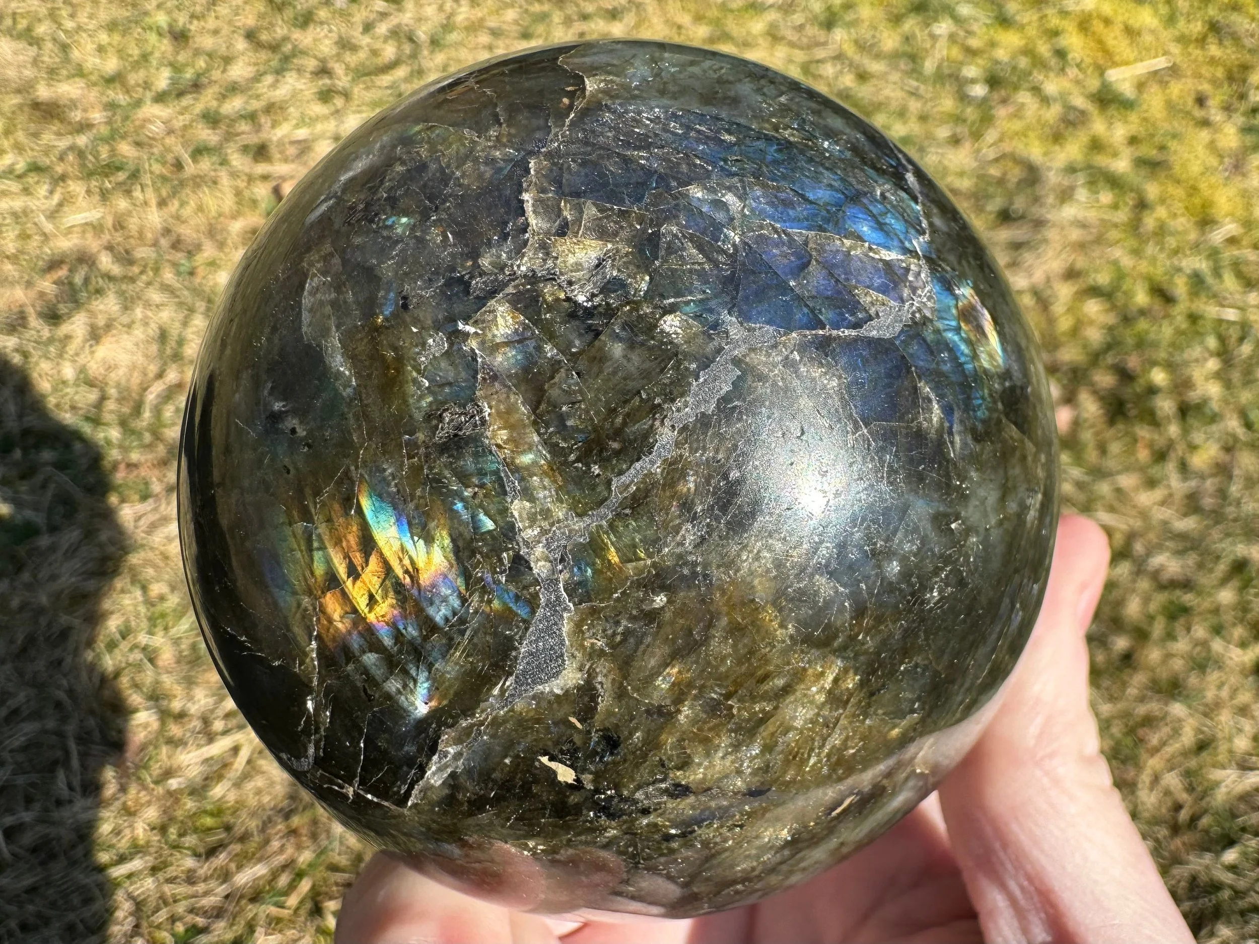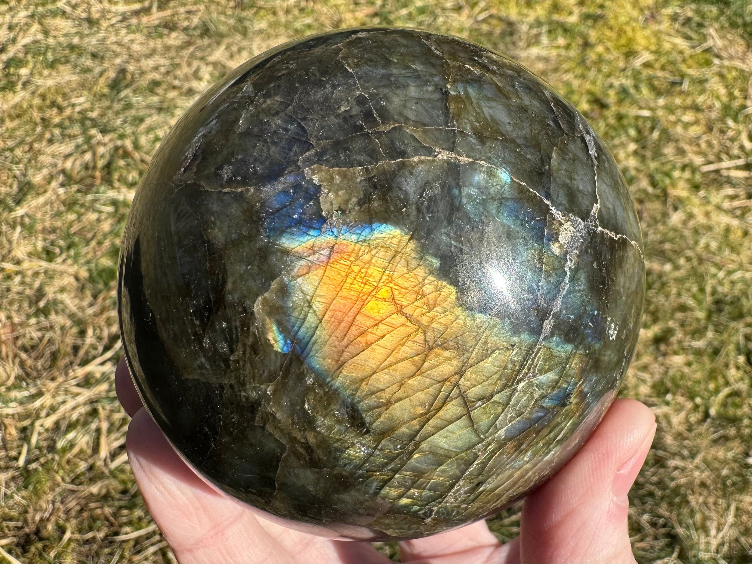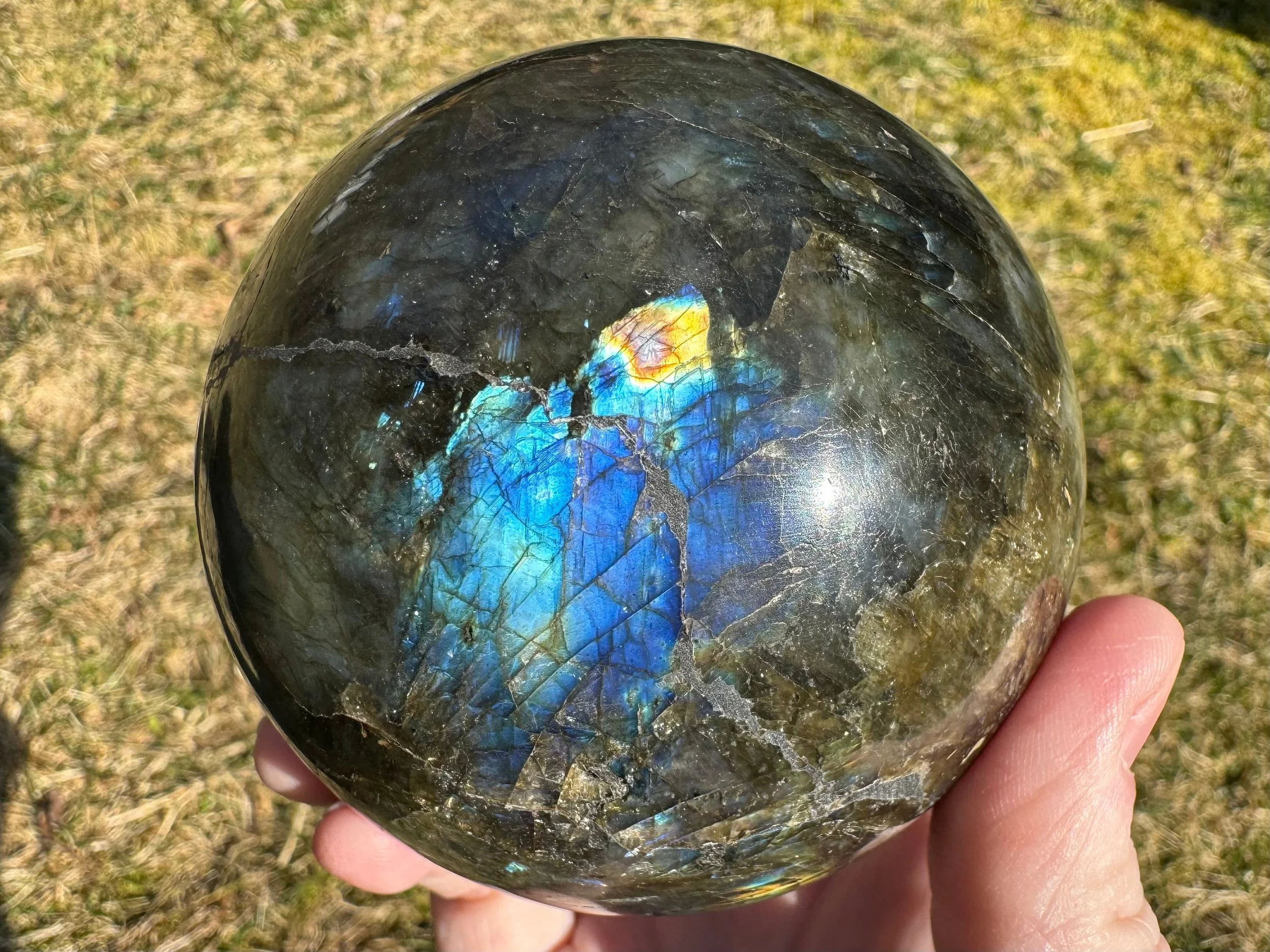 This is a lovely large and flashy Labradorite Sphere with mostly blue flash in all varieties of blues, some pinks, greens, plus lots of orange and yellow. Better in person than photos can show :) Great color all around the whole thing, every side is a good side. It also has lots of shimmer and sheen throughout the stone. Nicely polished.