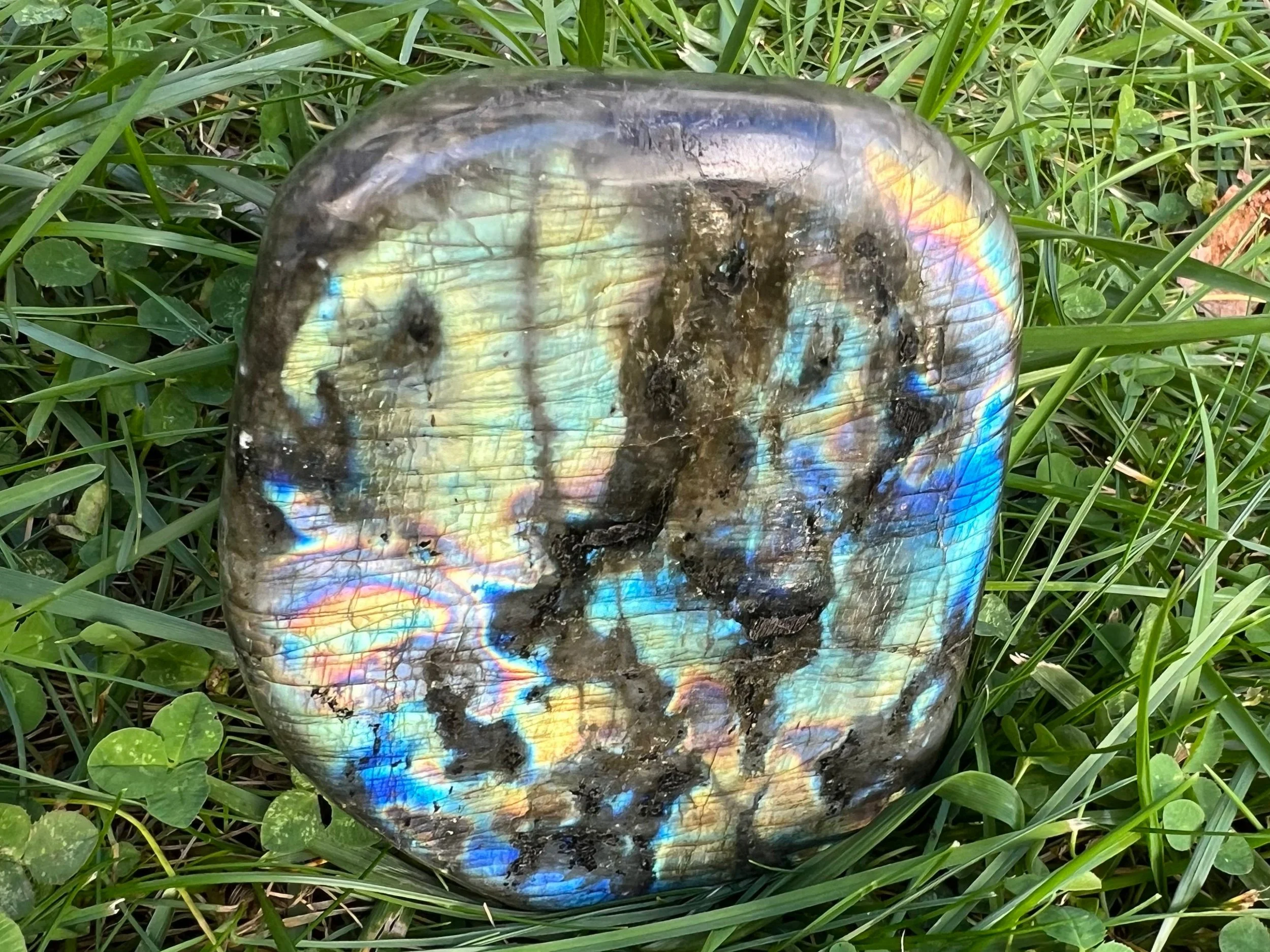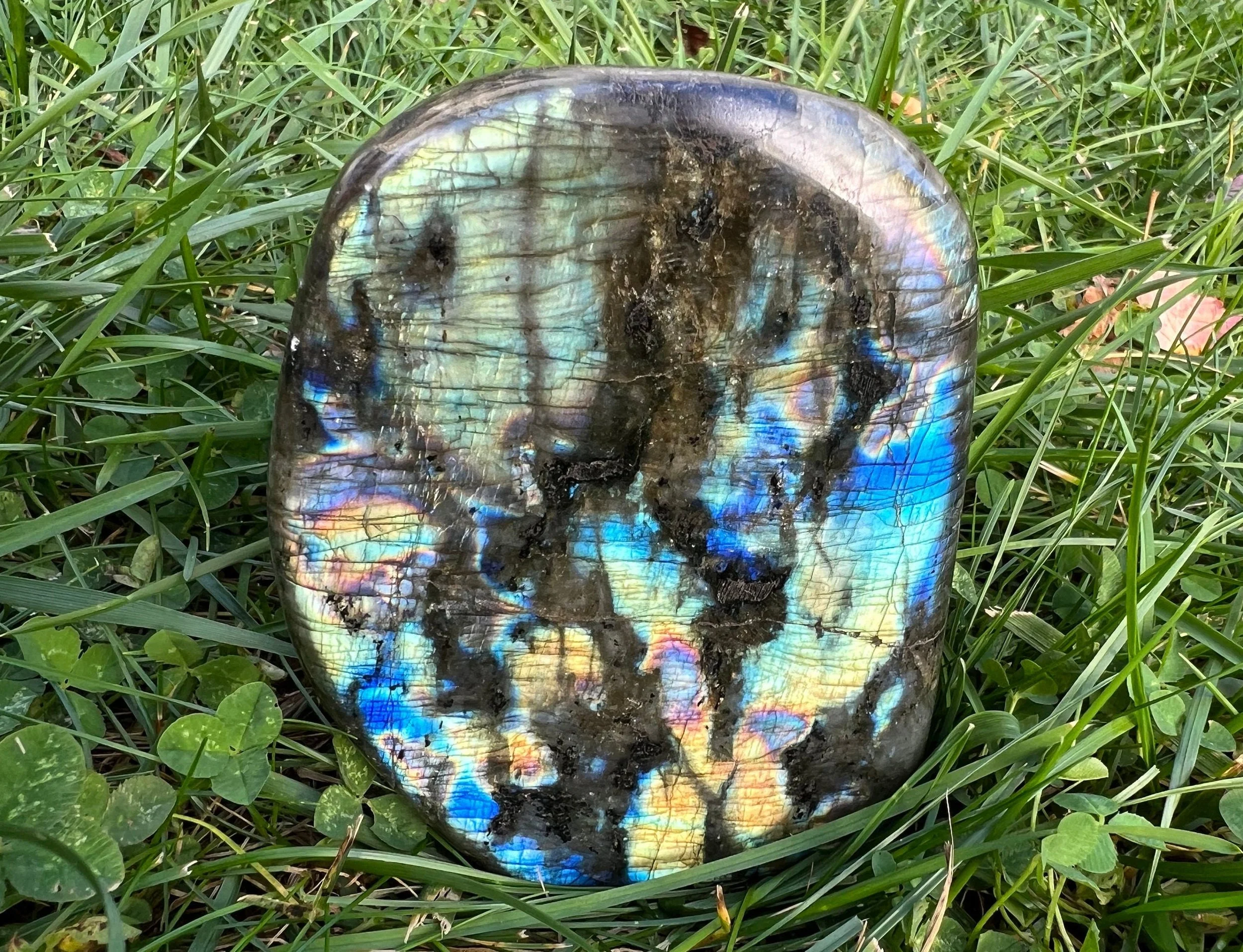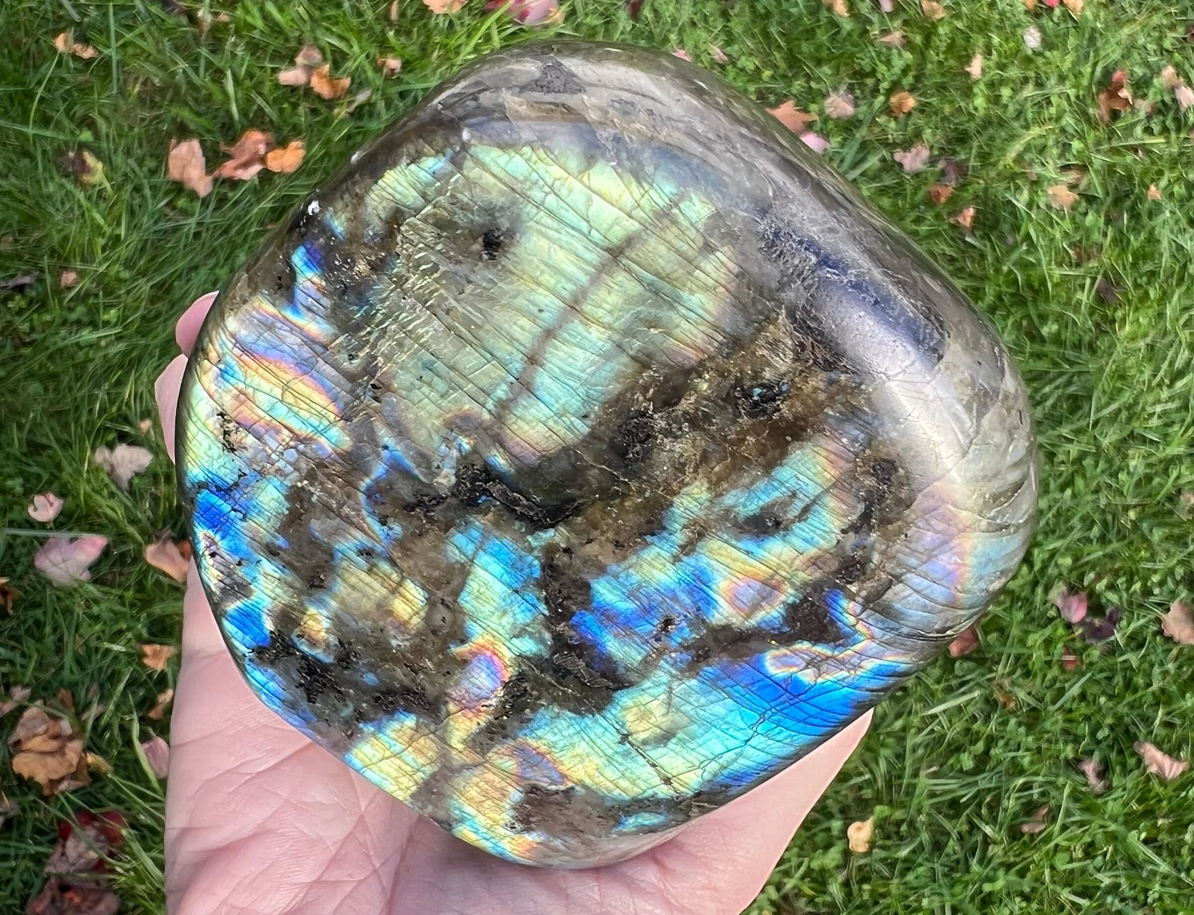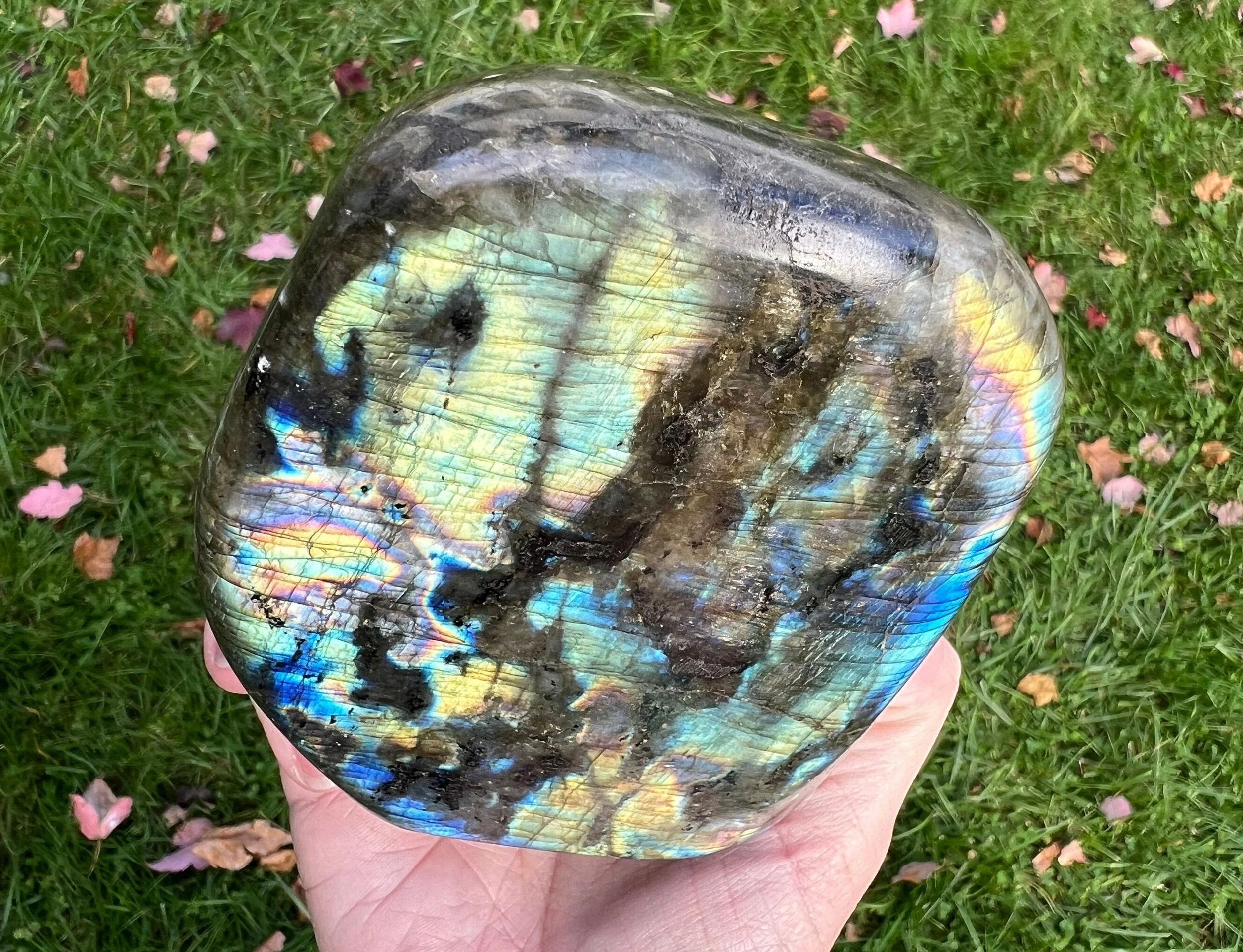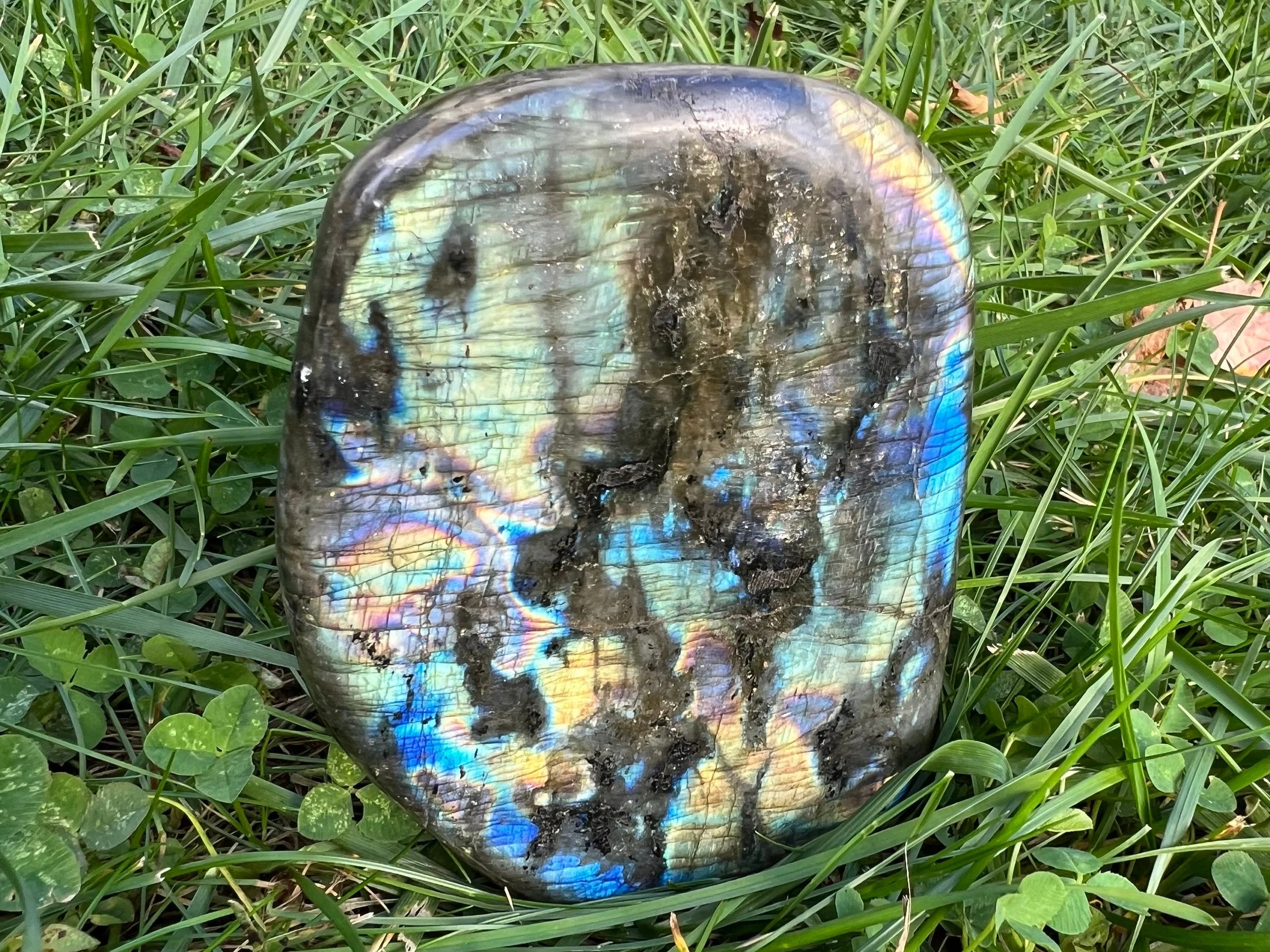 This is a beautiful polished Labradorite freeform display piece. It is very flashy with lots of color. It has beautiful blues and greens, with purples, pinks and yellows, and it is very shimmery too with tiny bitty rainbows all over. The back side has less flash with small bits of blue mostly, and large inclusions of black Biotite Mica. It is self standing and polished. A wonderful, colorful gemstone that makes great decor for any crystal lover.