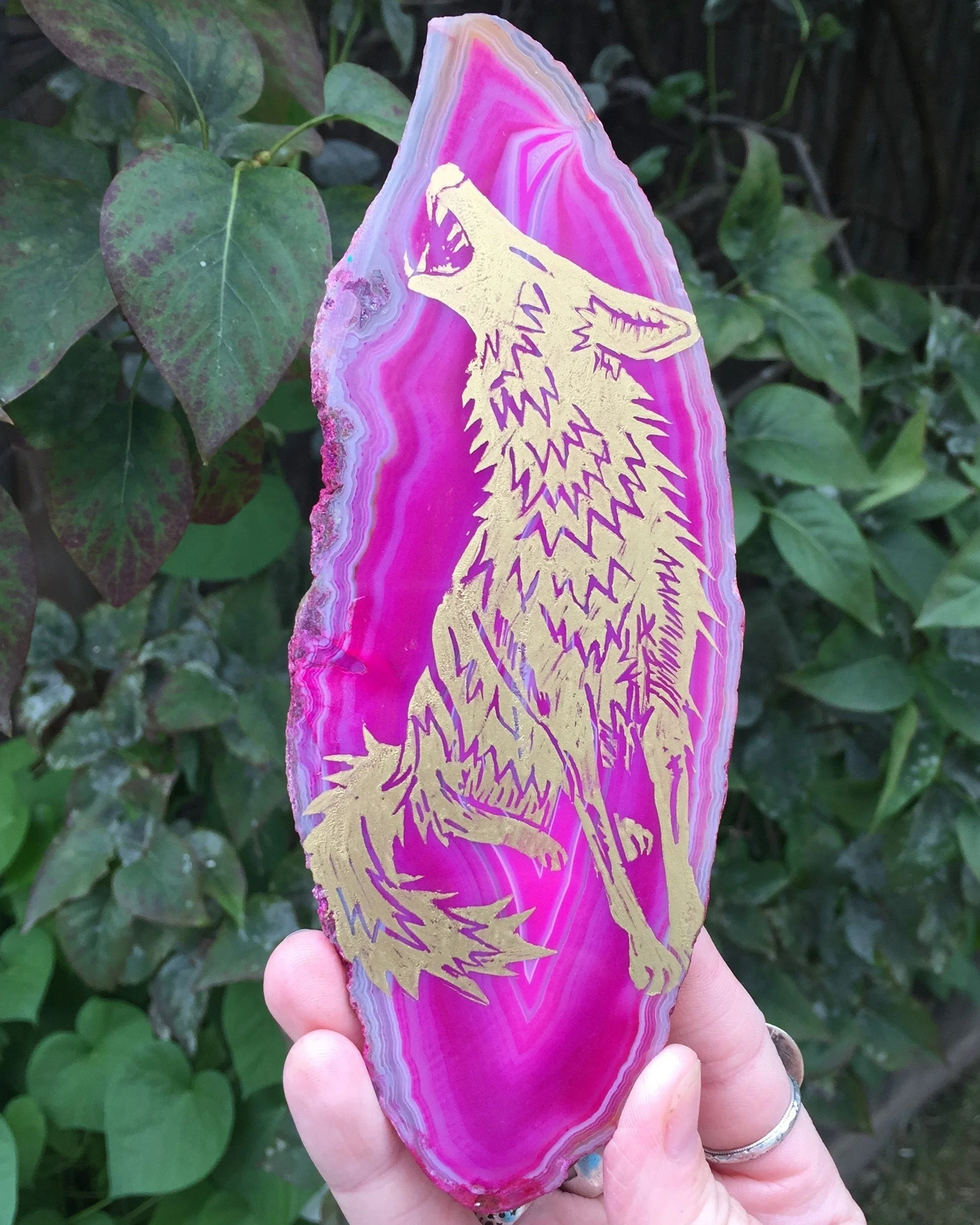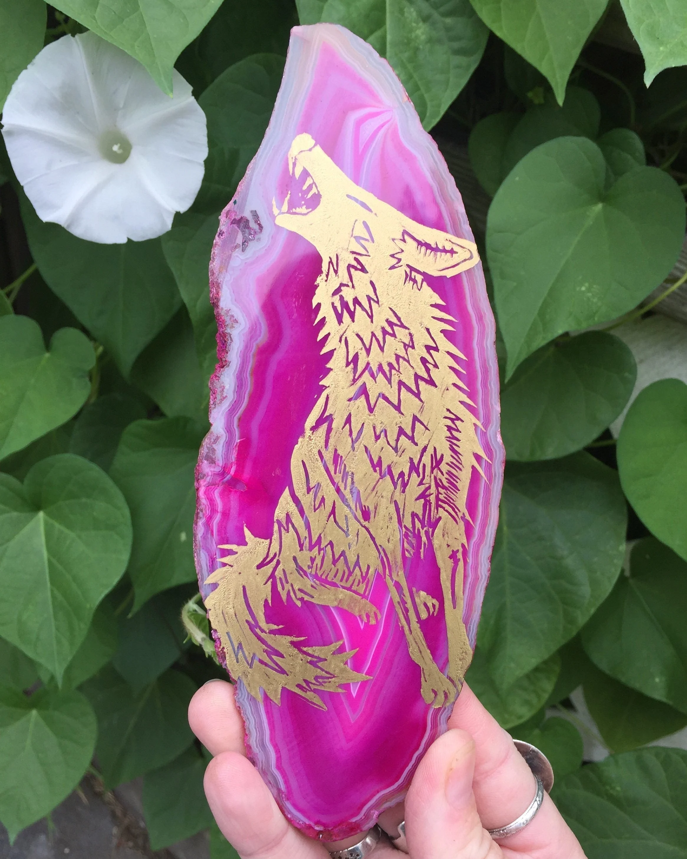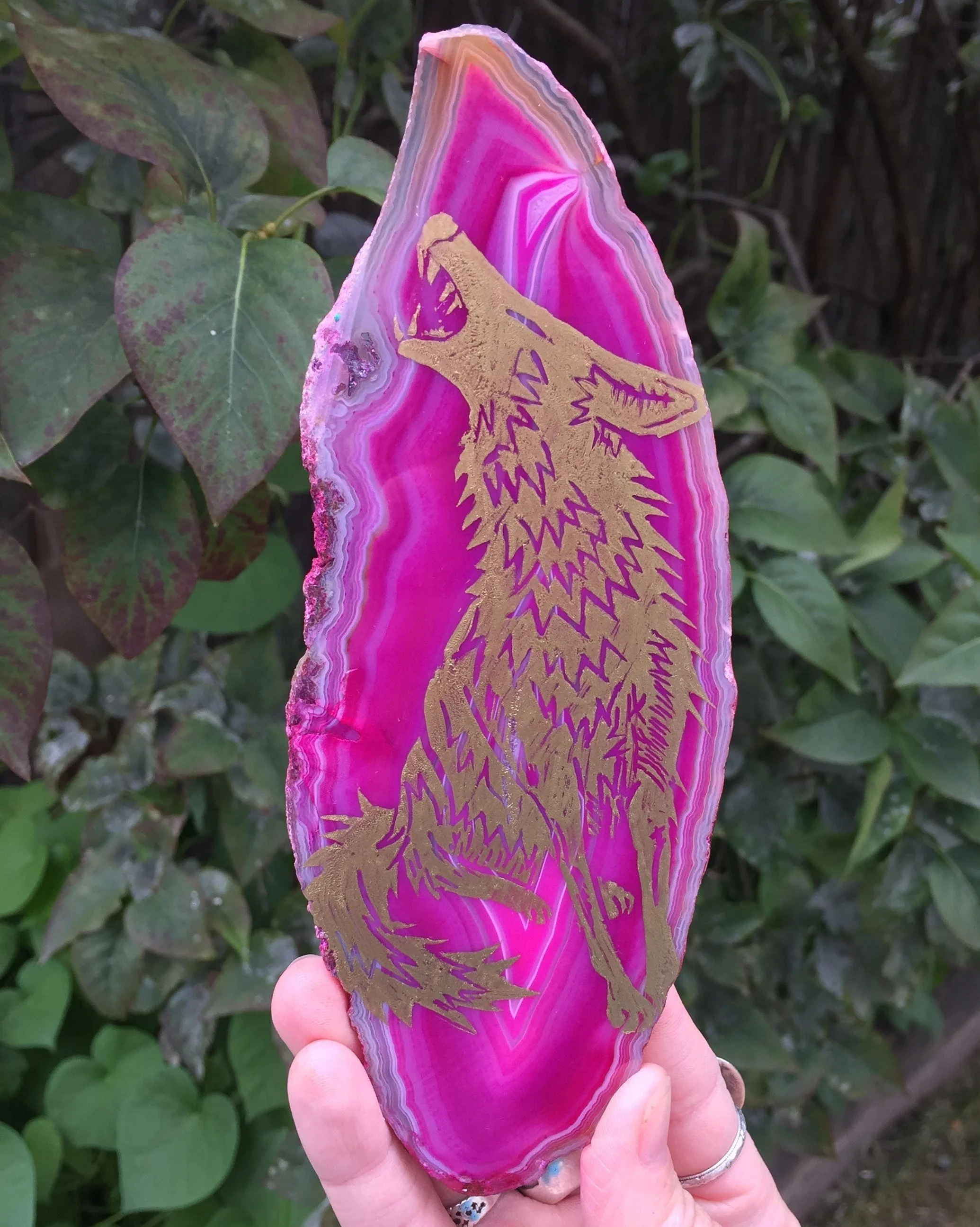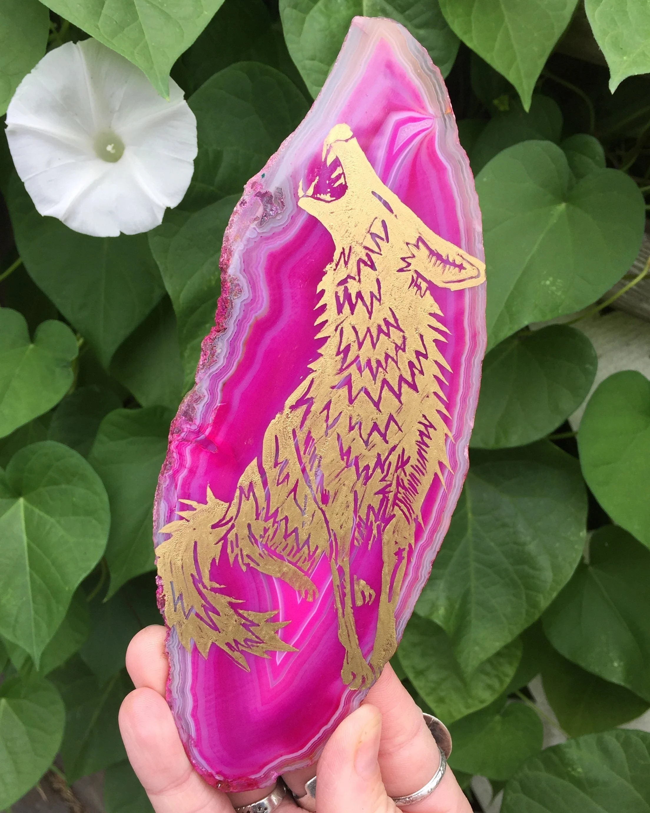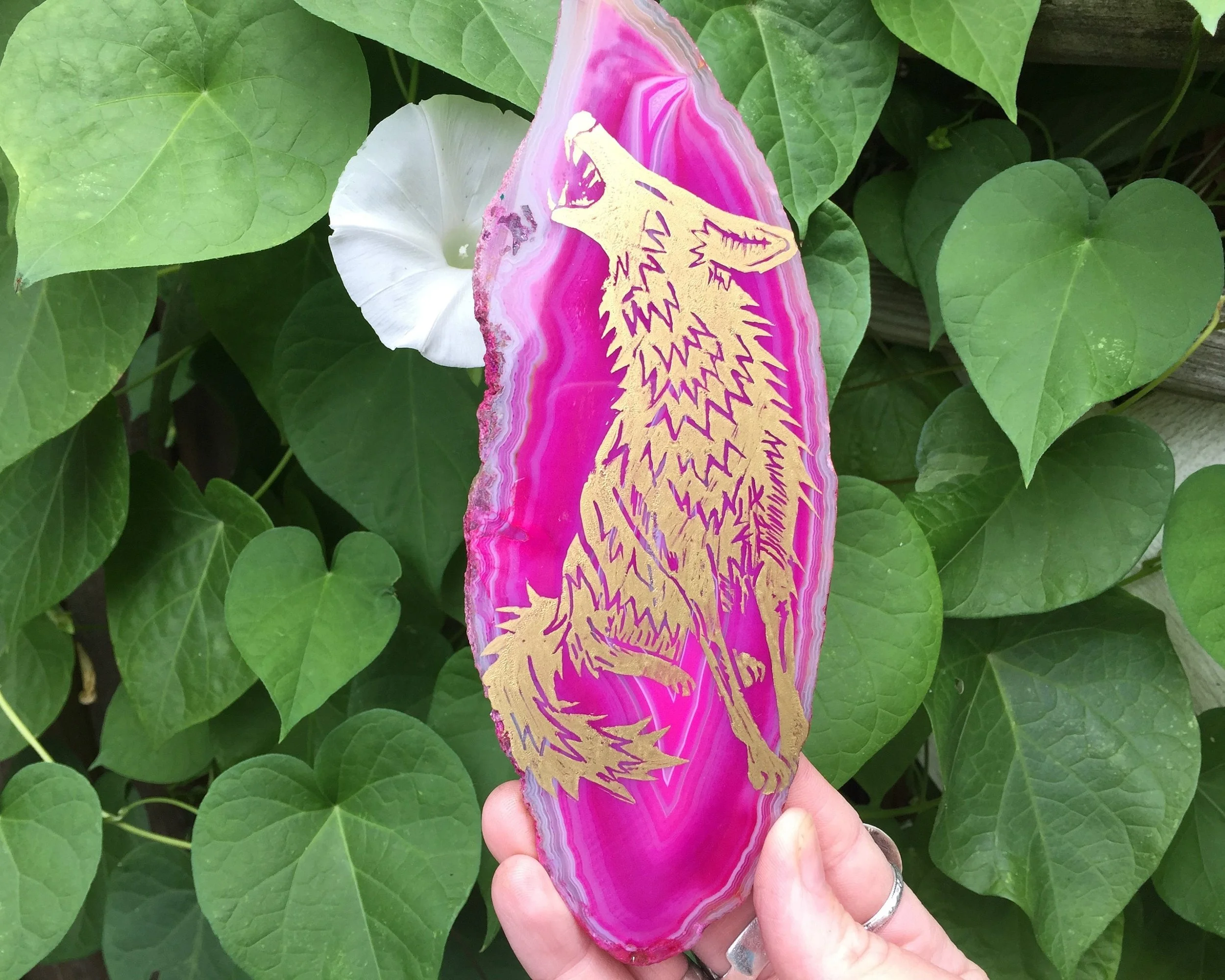 This one features a coyote, howling on a dyed hot pink Agate geode slice.