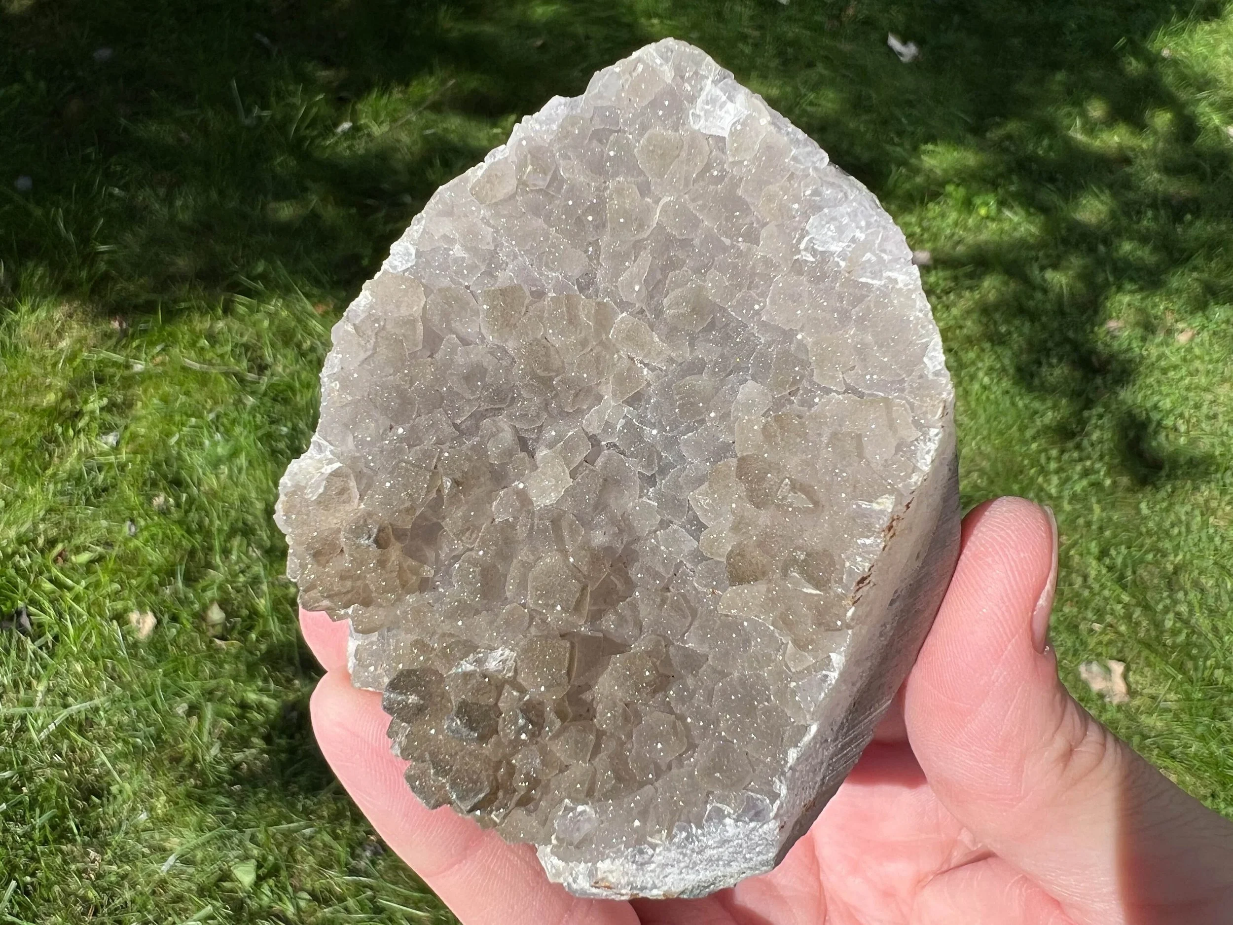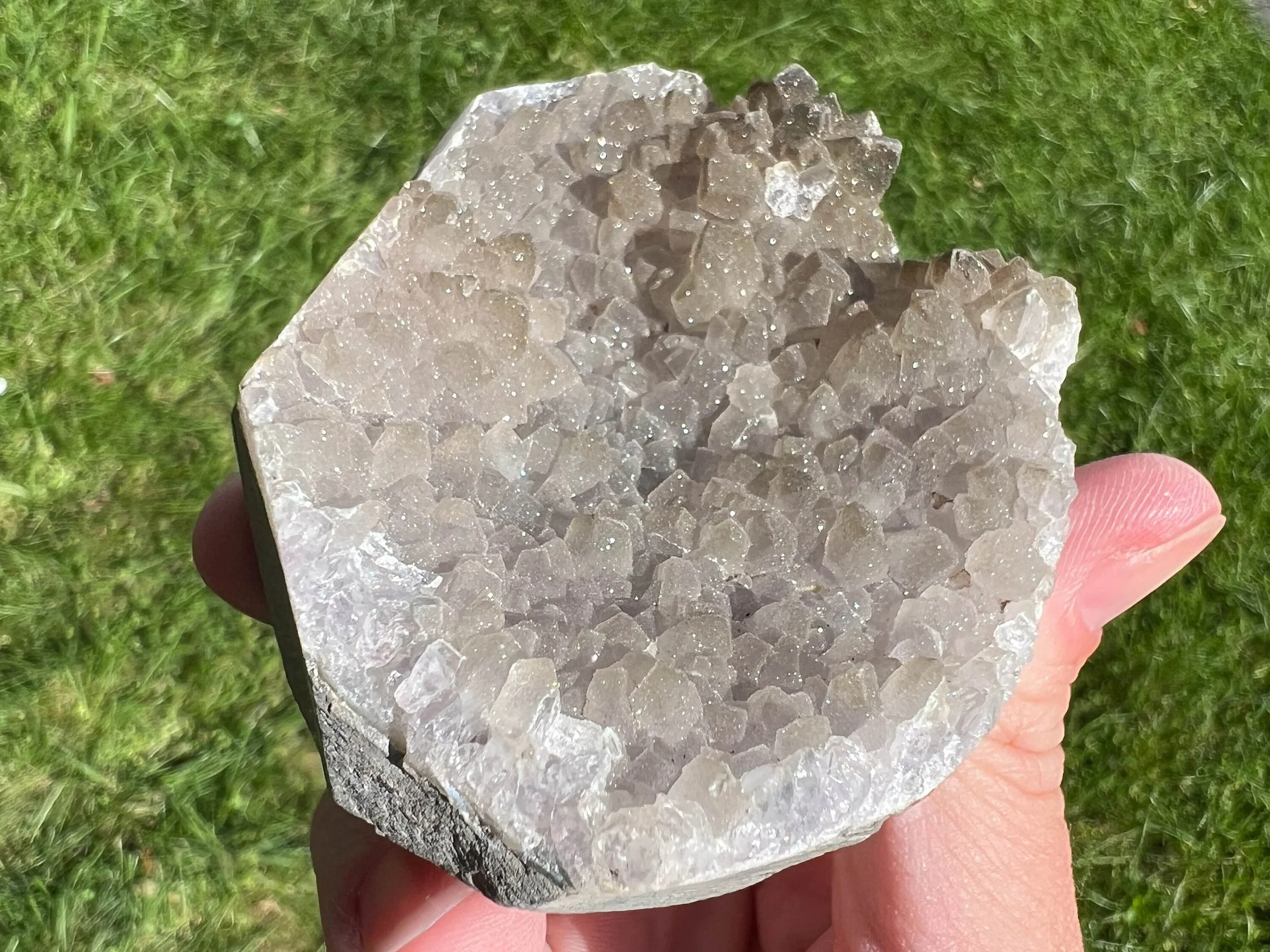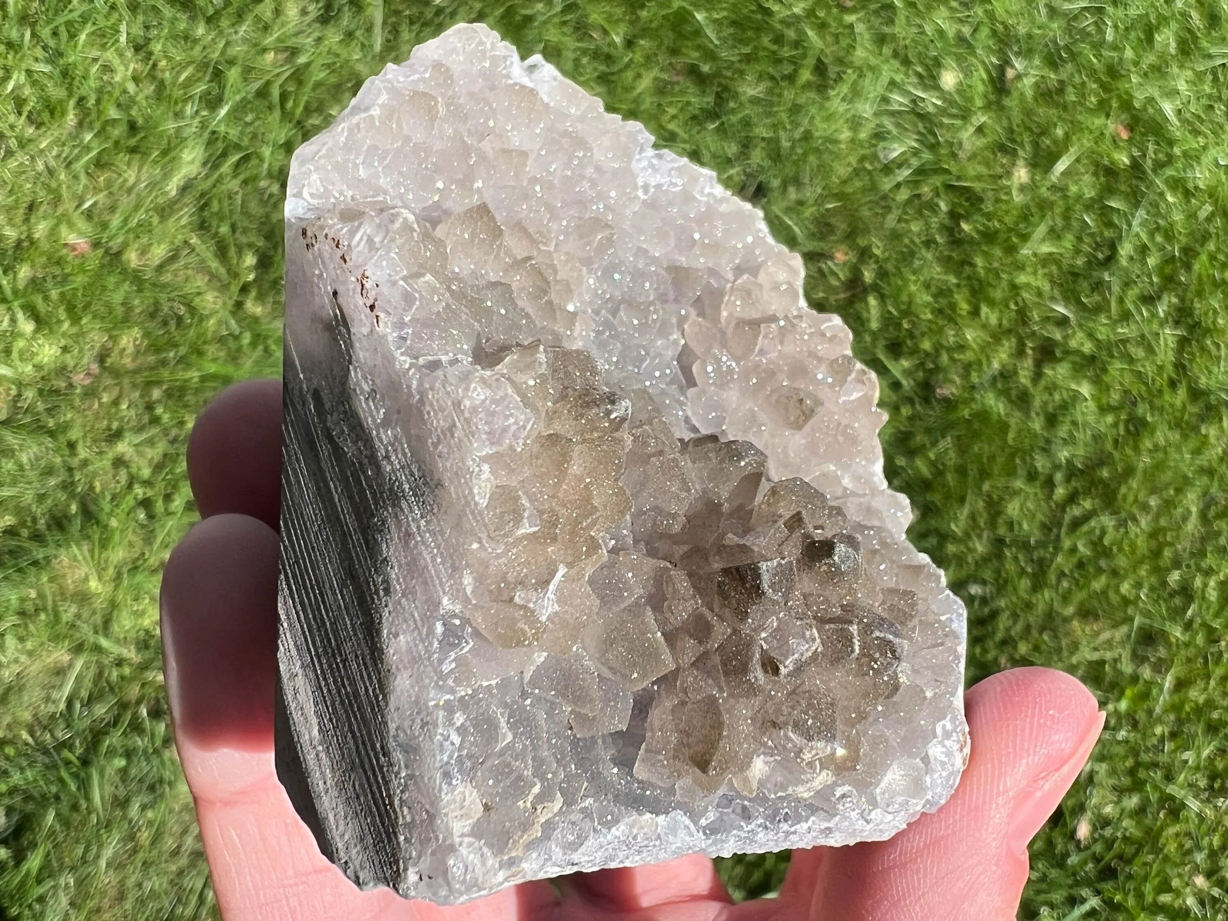 This is a self standing tower shaped cluster of Apophyllite crystals coated in sparkly gray to almost black druzy all over. Some of the cluster is shaped in rosettes of Apophyllite points. It is cut into a point shape but the front is all natural, raw stone. It is from India.