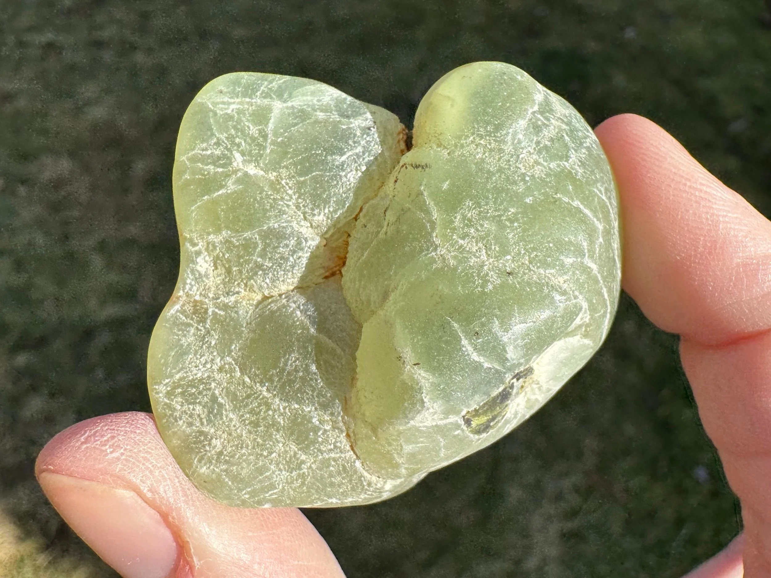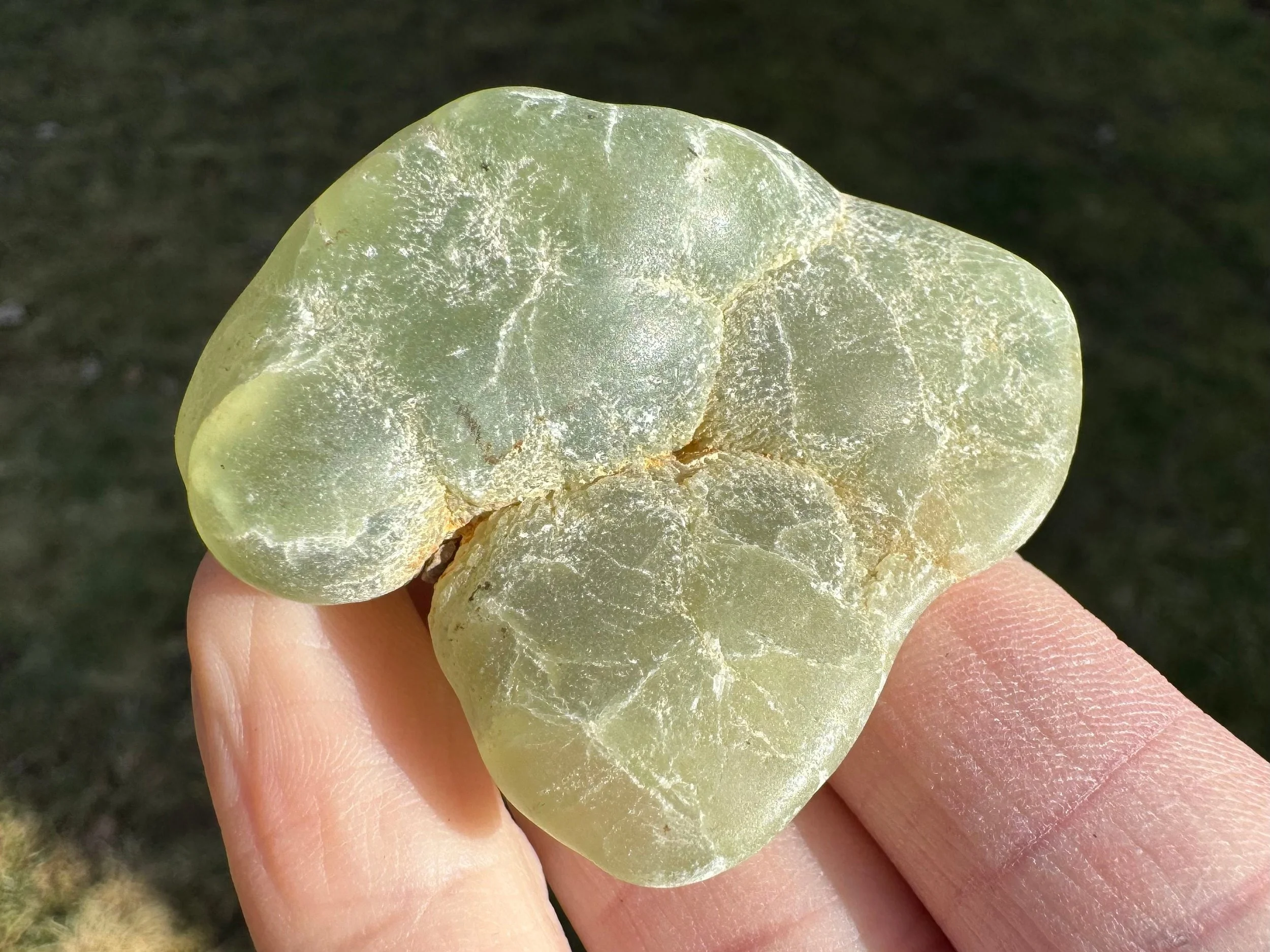 This is a semi tumbled Prehnite and Epidote cluster. It retains its cluster shape and ball formation but is smoothed out like it is lightly polished. It has soothing green coloring that glows gorgeous in the light <3