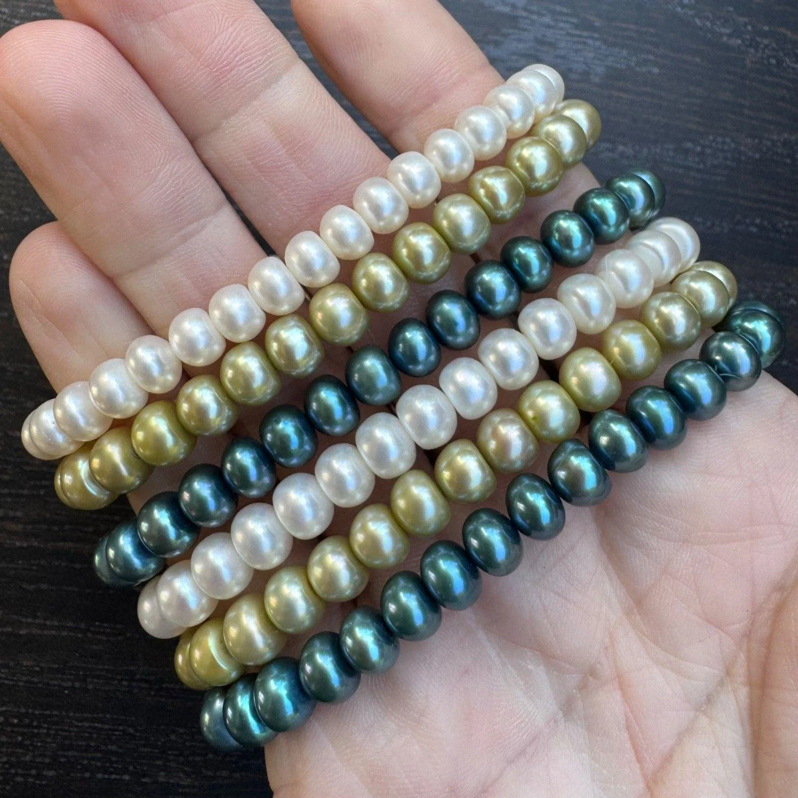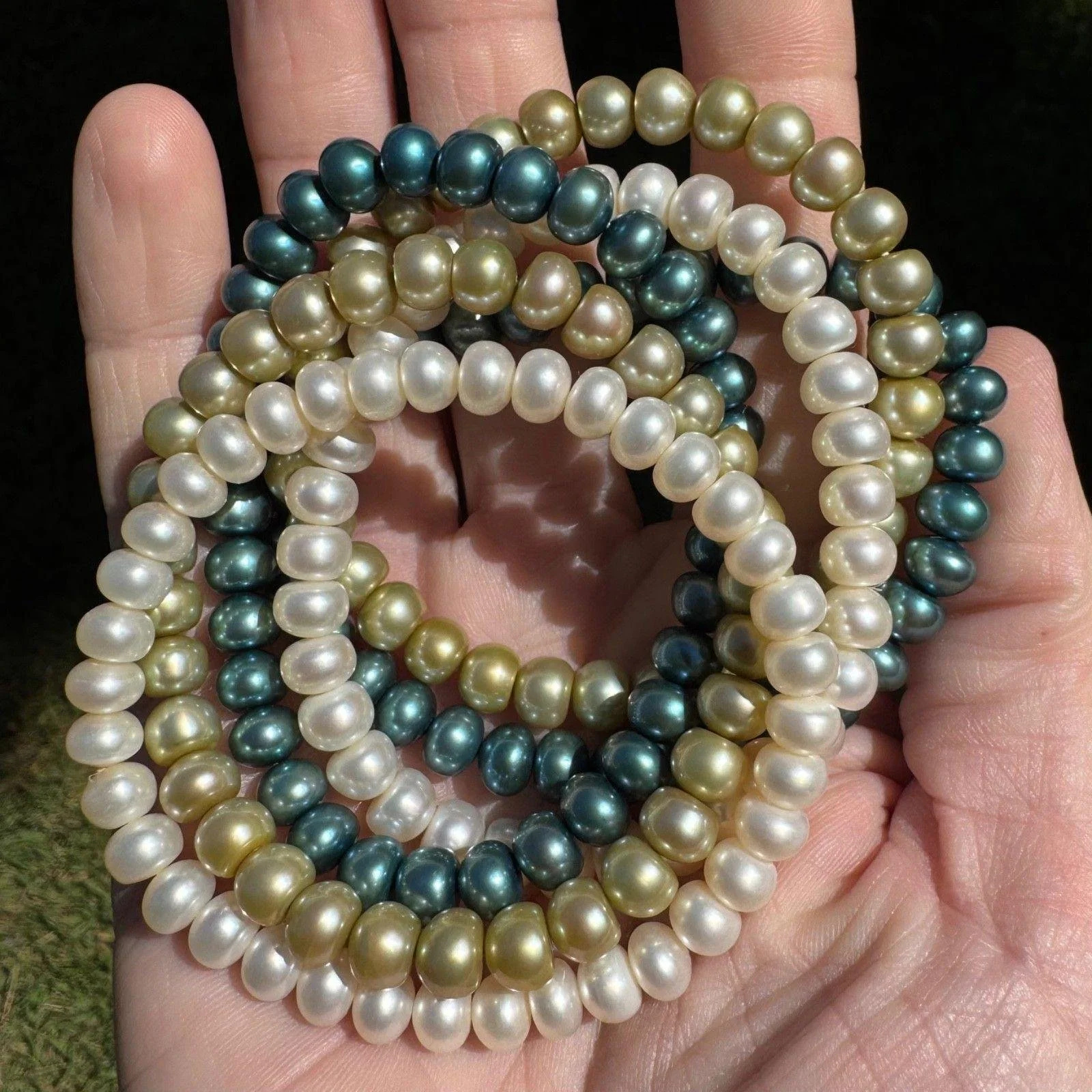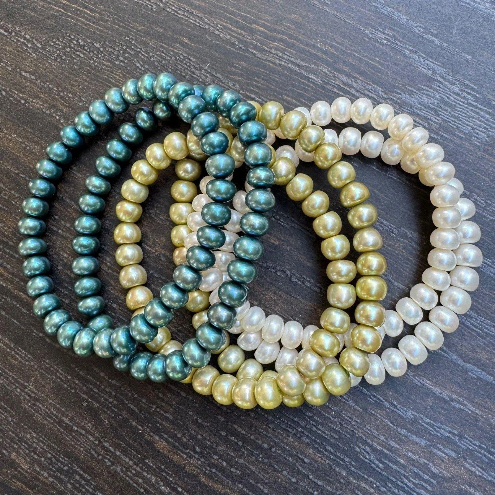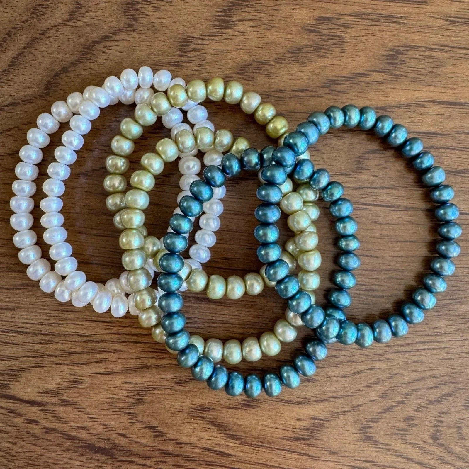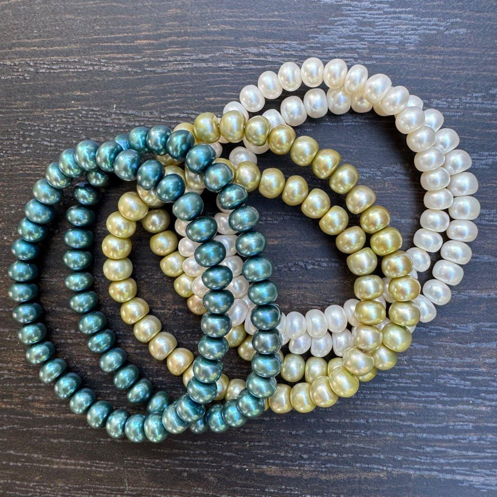 Set of 6 vintage freshwater pearl stretch bracelets in three colors, with two in each color - blue, green and white. They are cool toned colors reminiscent of a fresh spring day. They would also be great worn separately to accomodate different outfits and occasions. These bracelets are in excellent condition and would make a great gift.