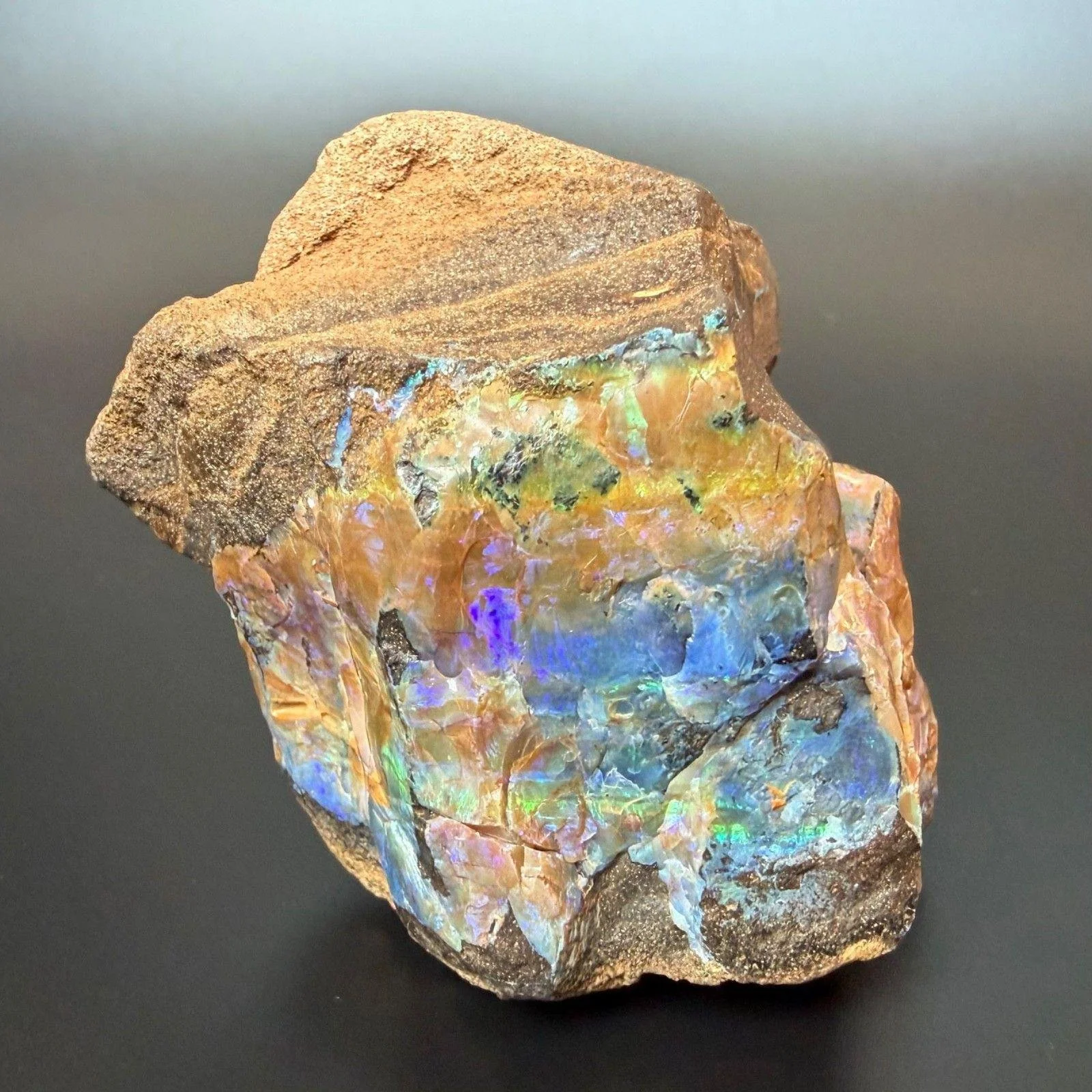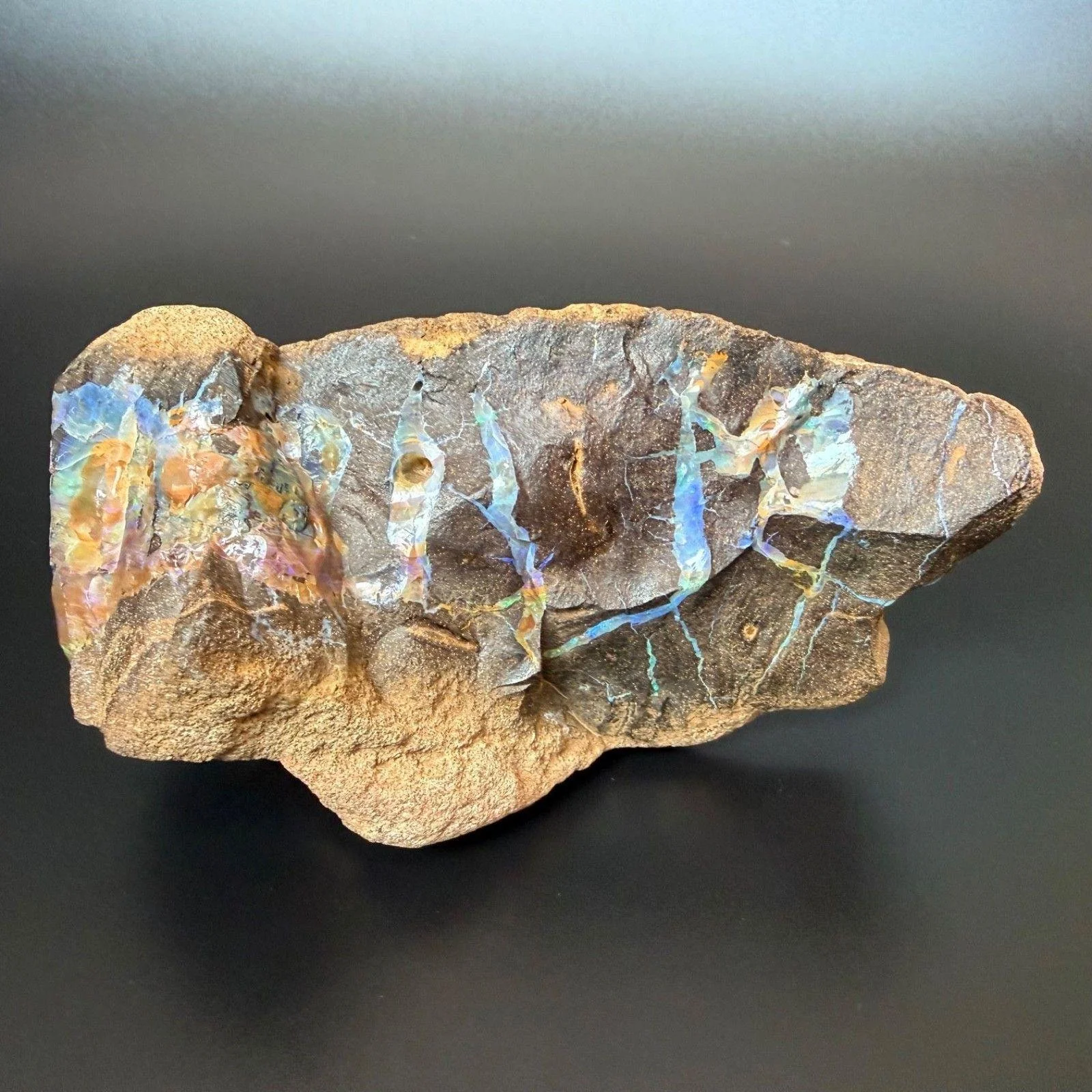 That said, this is a boulder opal chunk in and on its matrix from Australia. It is famous for its beautiful veins of opal running through brown stone creating a lovely contrast of neon to pastel colors against tan to dark brown matrix rock. This one has tons of those vein patterns in the stone as well as a large area that is fully opal with lots of flash. Beautiful electric blues and greens with pretty lavender and violet purples are the main colors of this flash, which can be seen perfectly nicely without needing to wet or polish the stone.