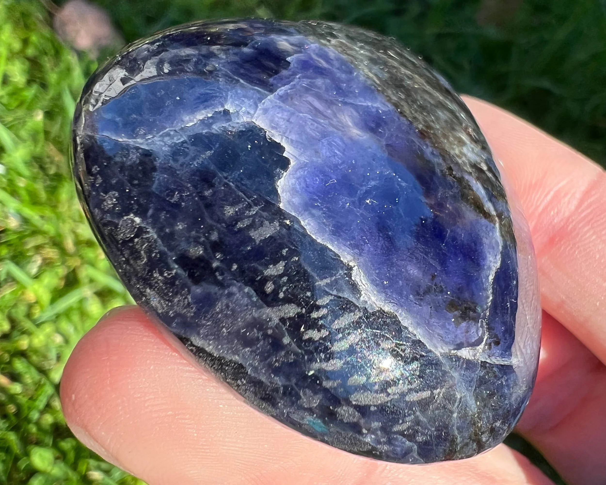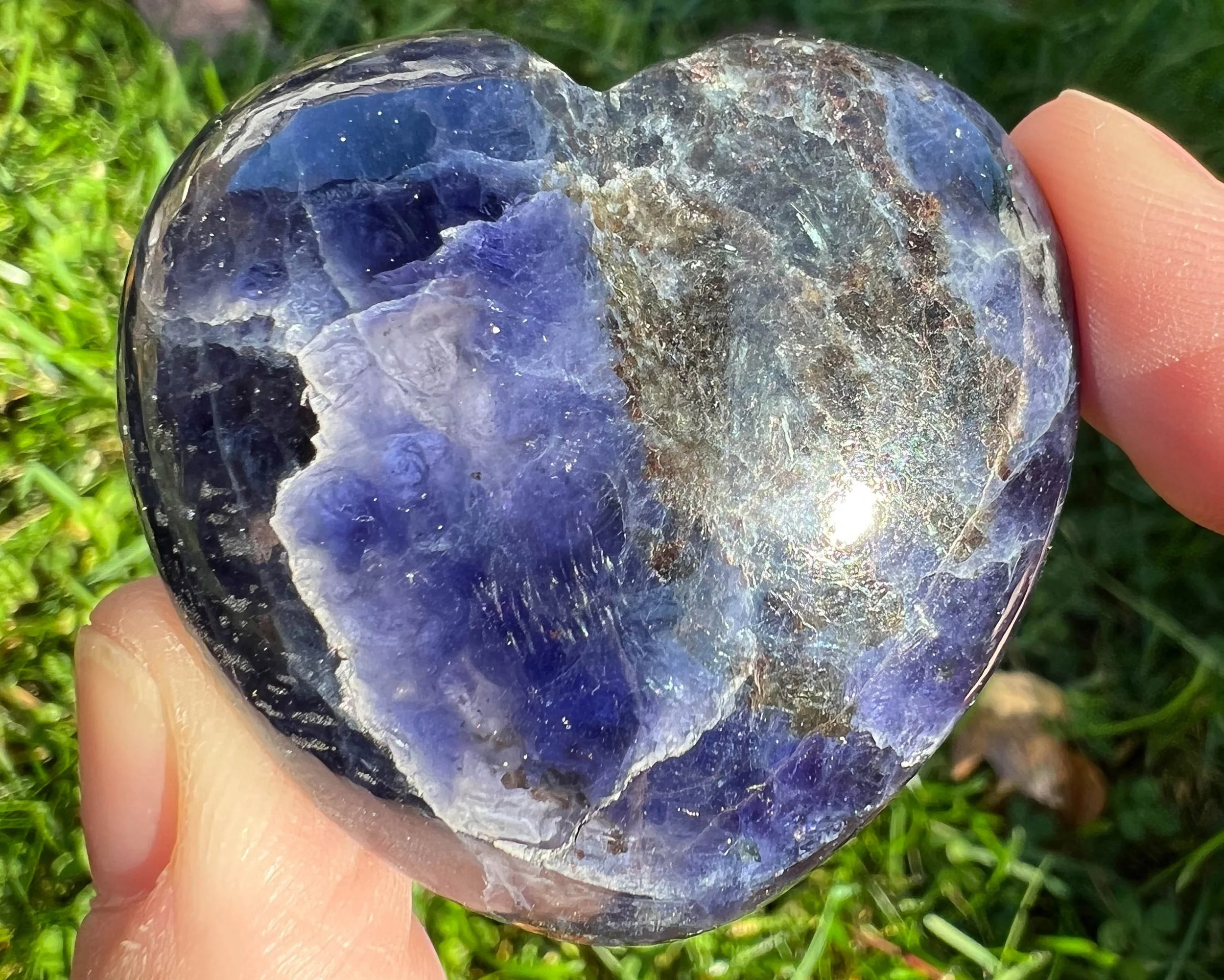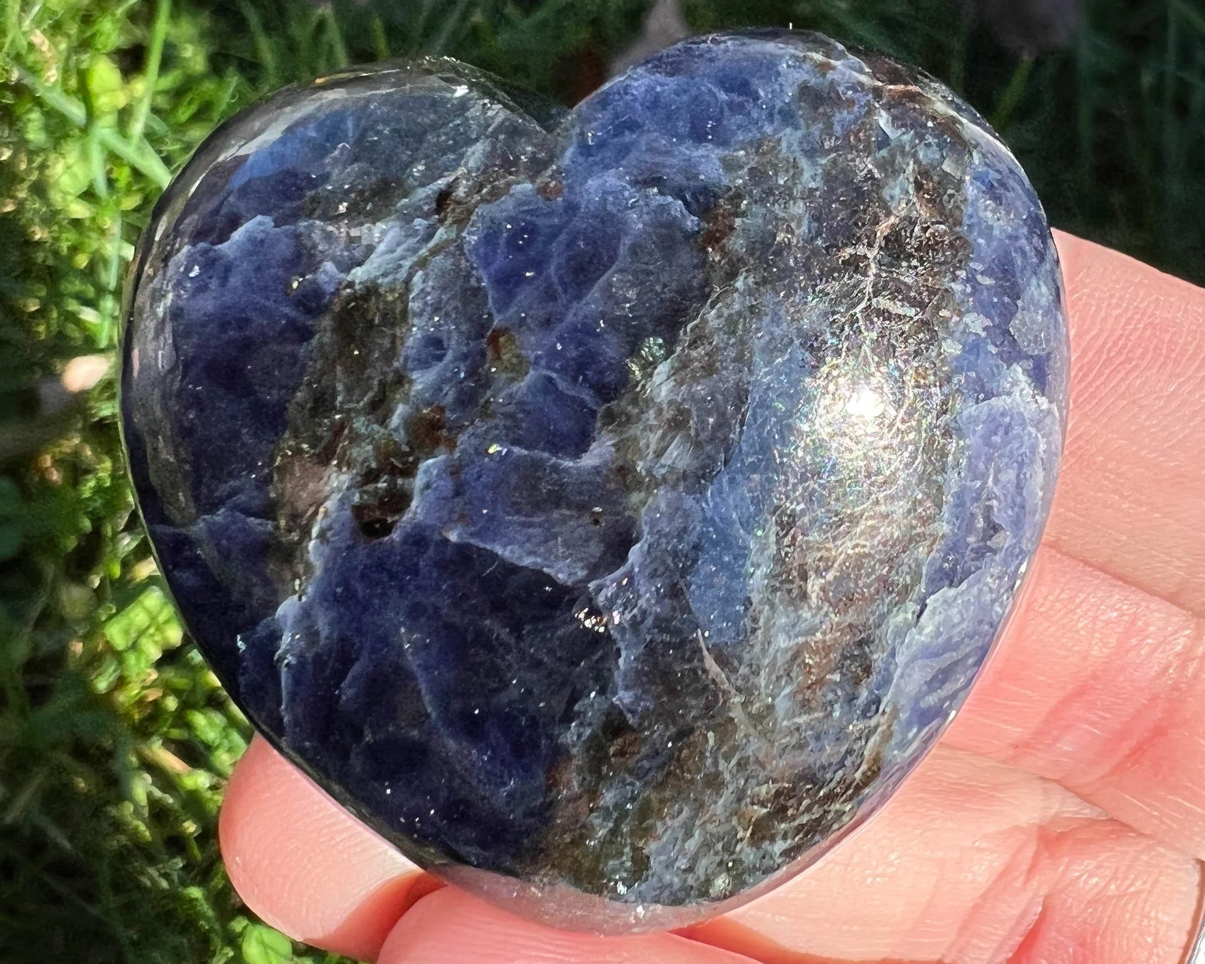 This is a beautiful sparkly Iolite heart, a blue Cordierite stone with inclusions of Anthophyllite, which flashes blue iridescent streaks throughout the darker parts of the heart. A very cool and beautiful combination of minerals. Cut and polished into a nice little heart.