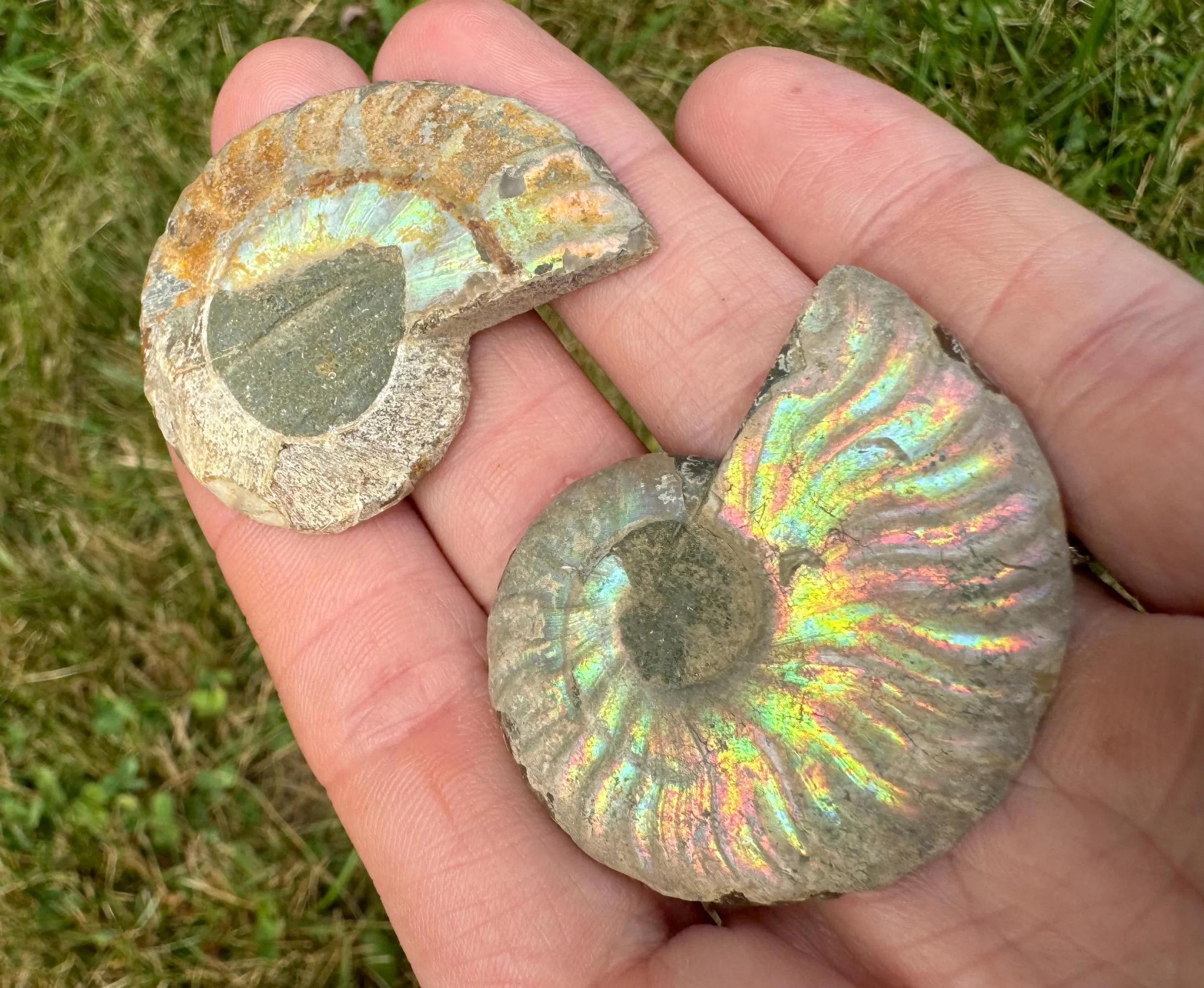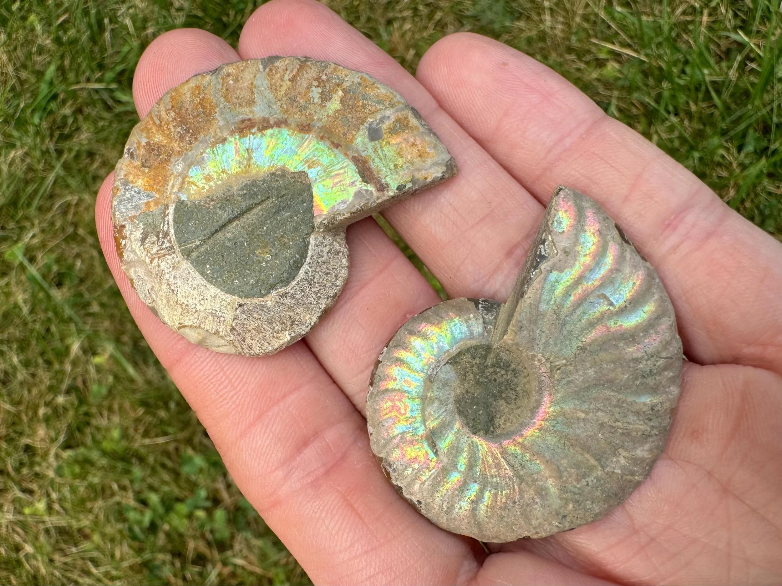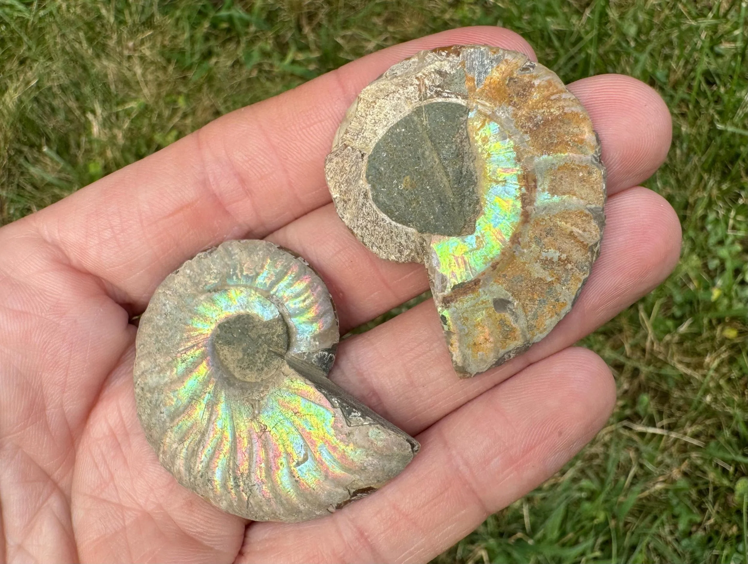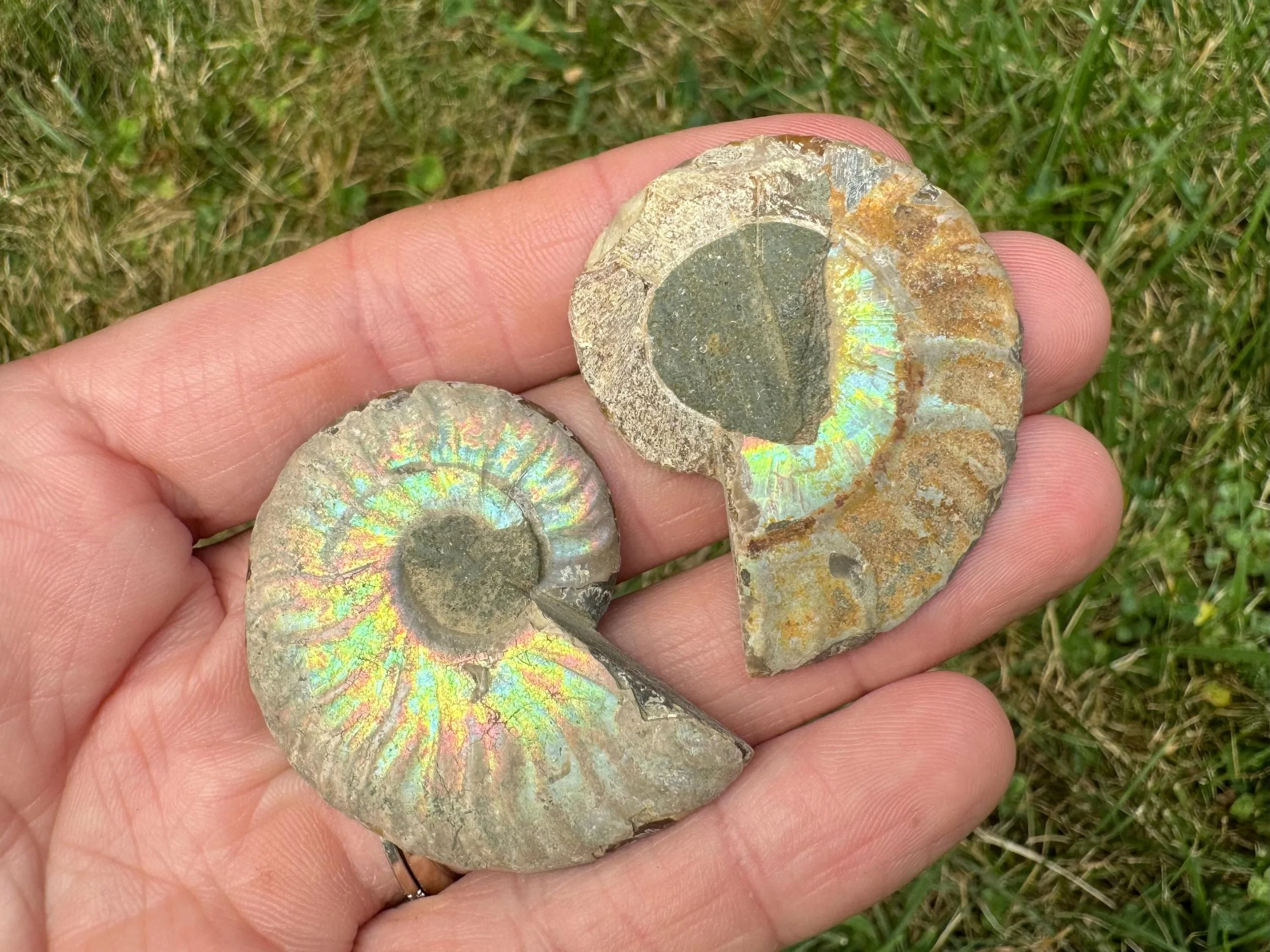 Iridescent Ammonite Fossil Pair: Cretaceous, Calcite Druzy Pocket #3