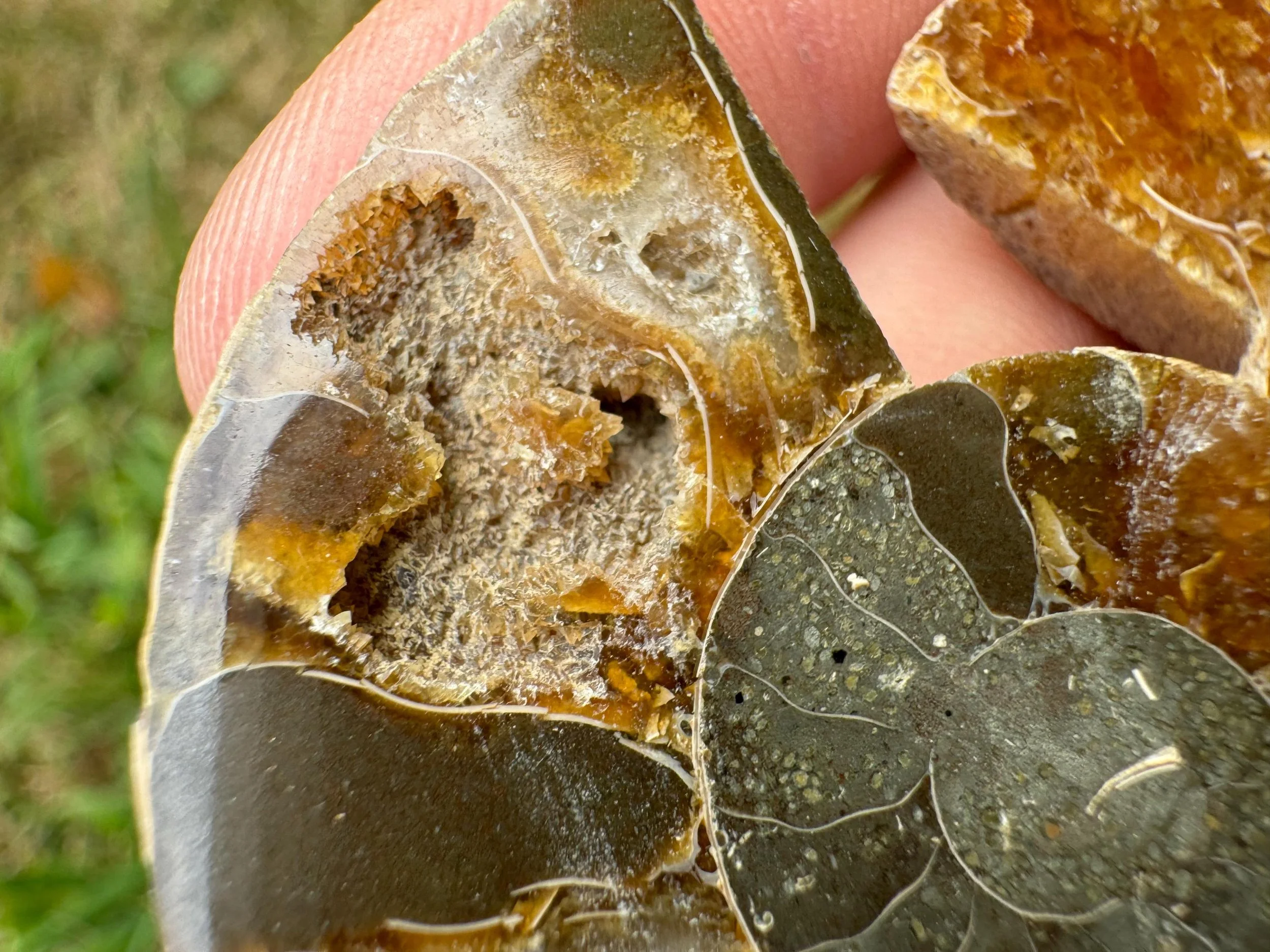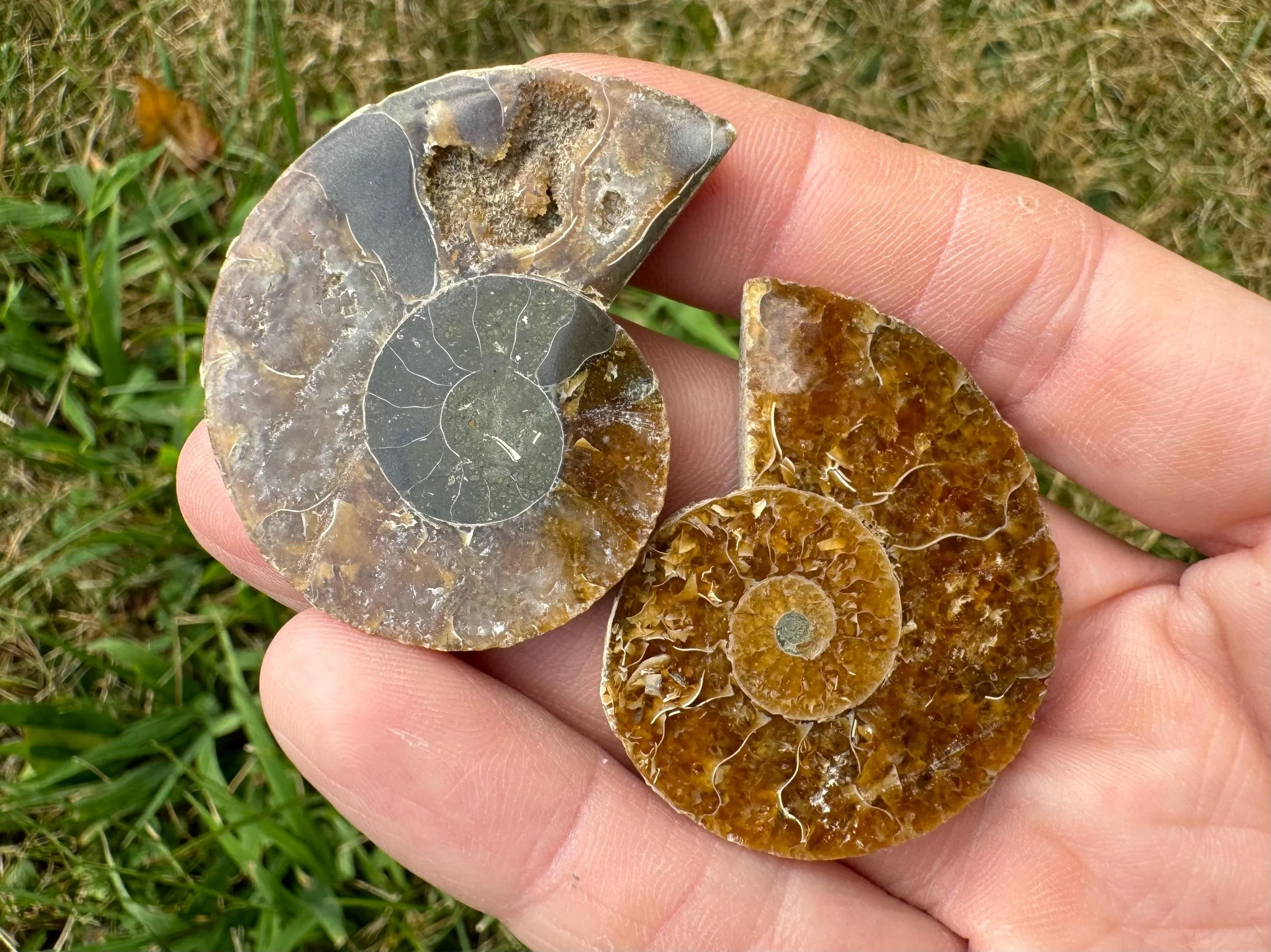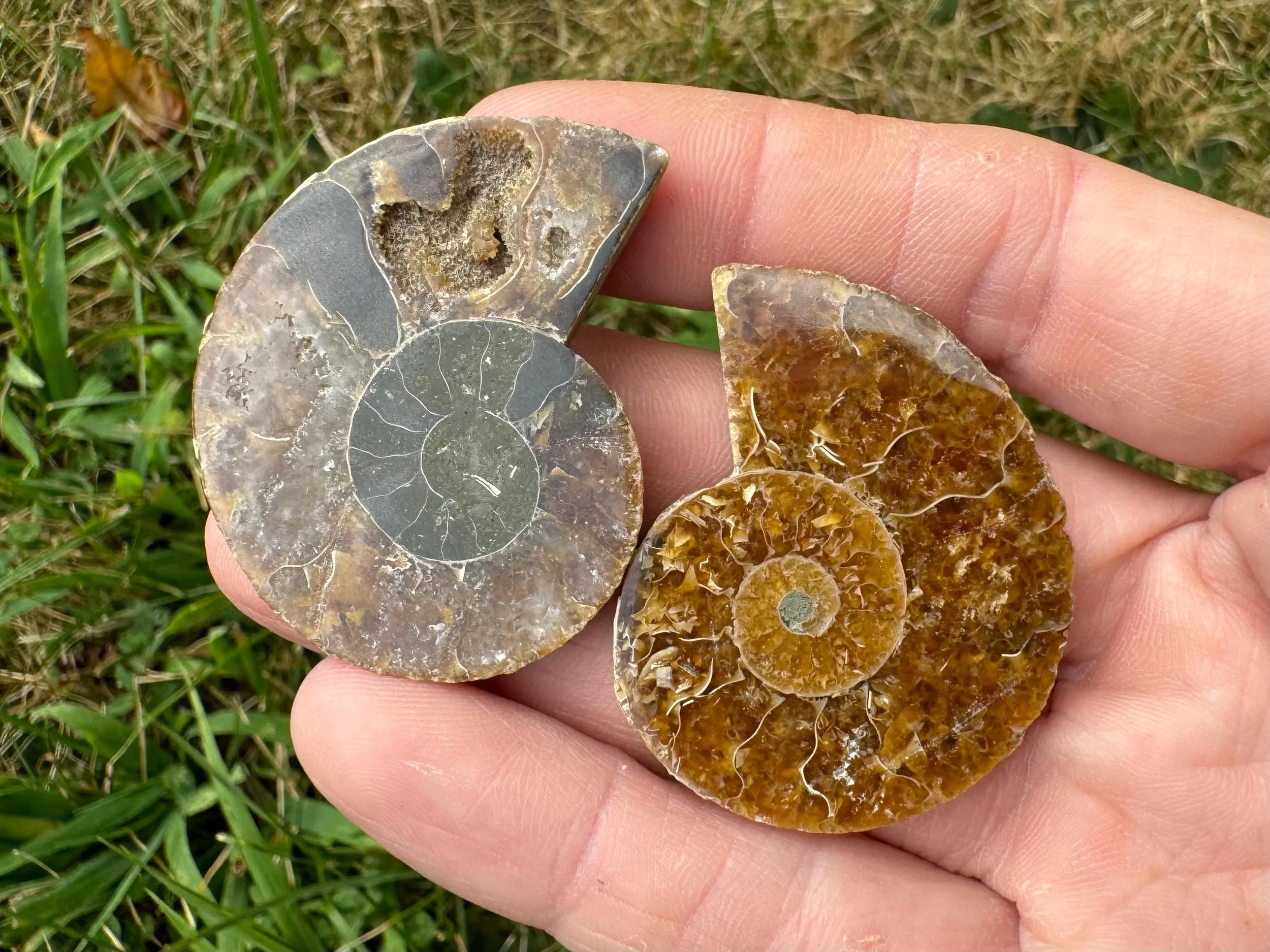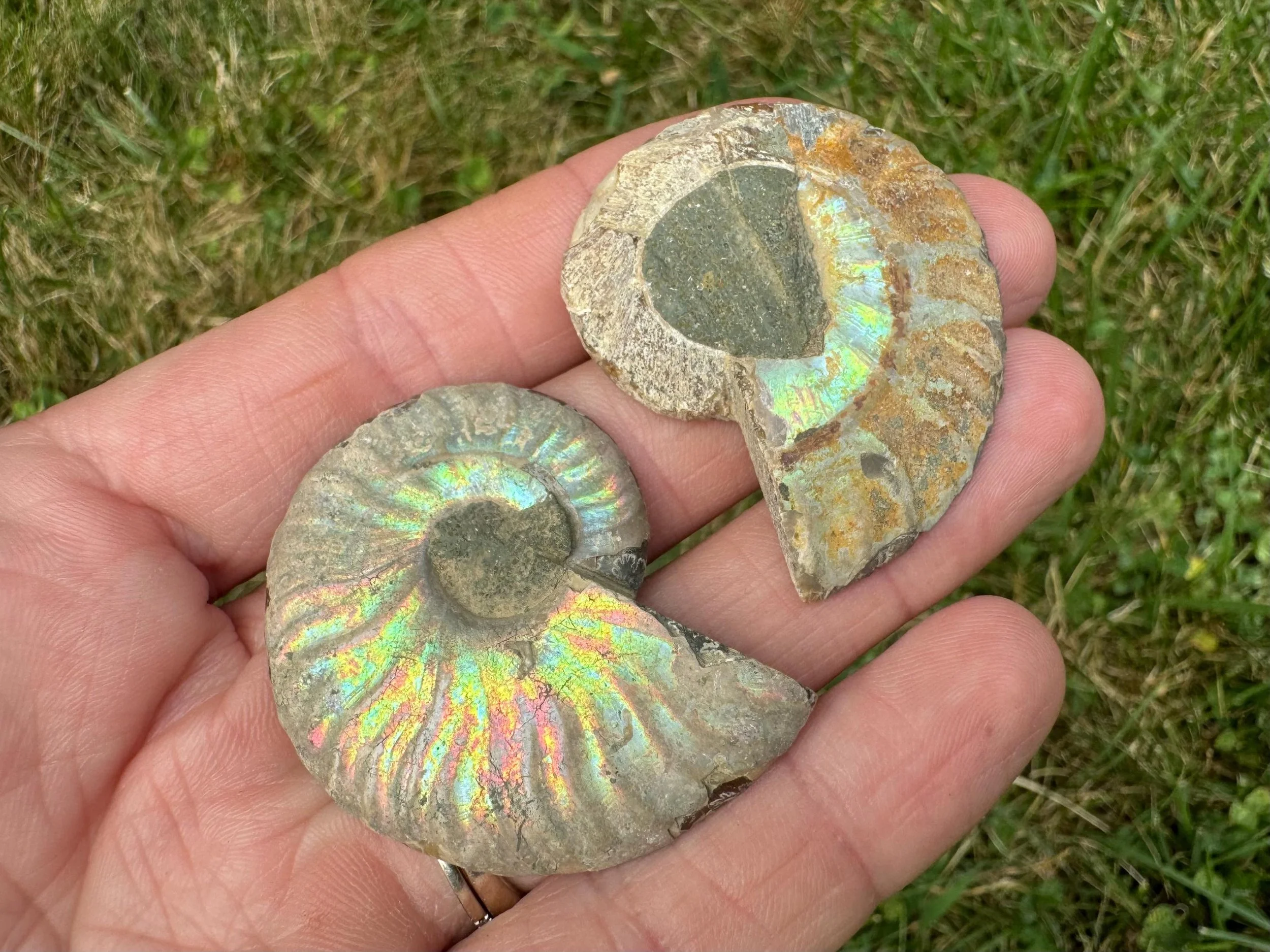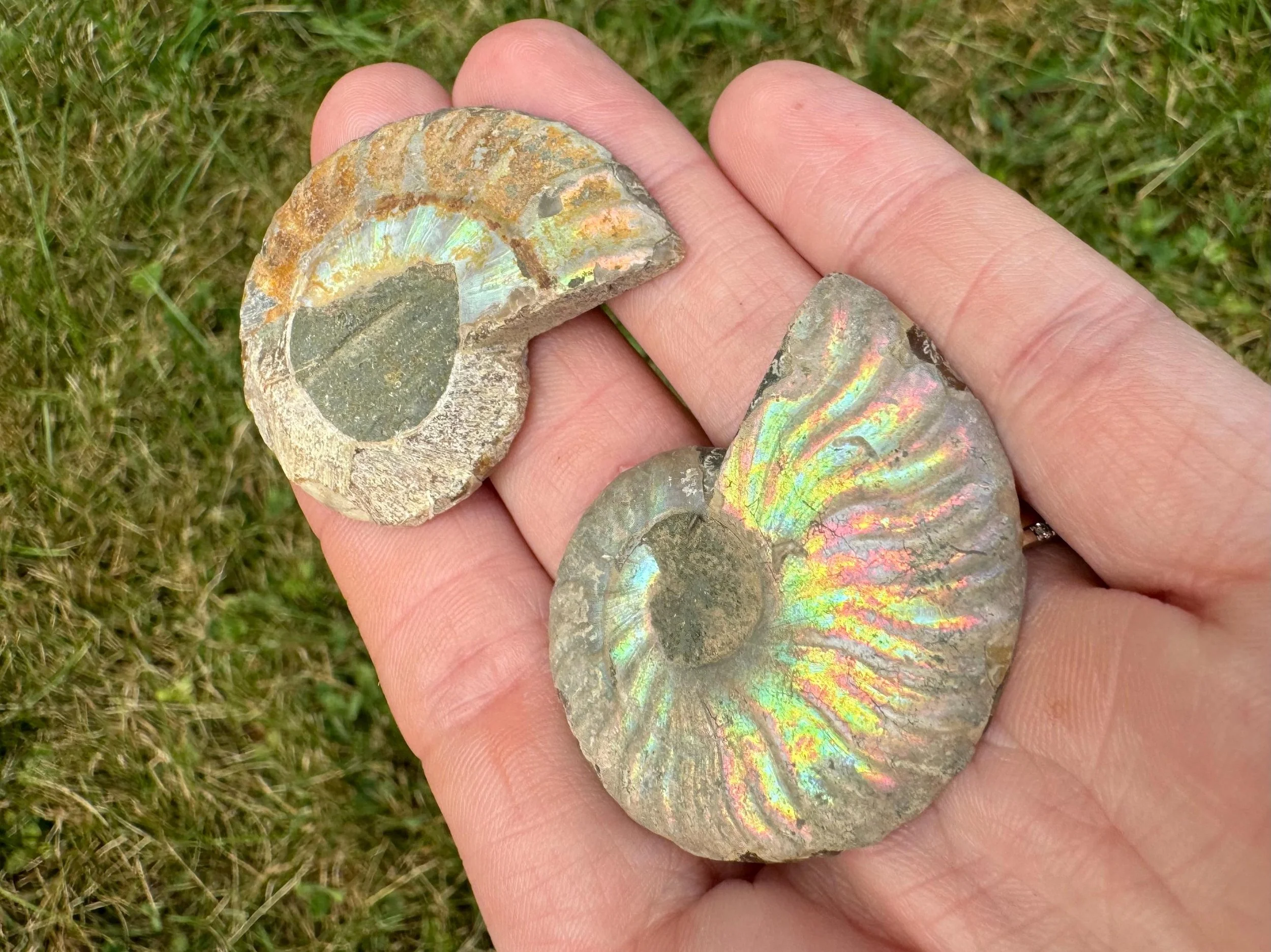 Iridescent Ammonite Fossil Pair: Cretaceous, Calcite Druzy Pocket #3