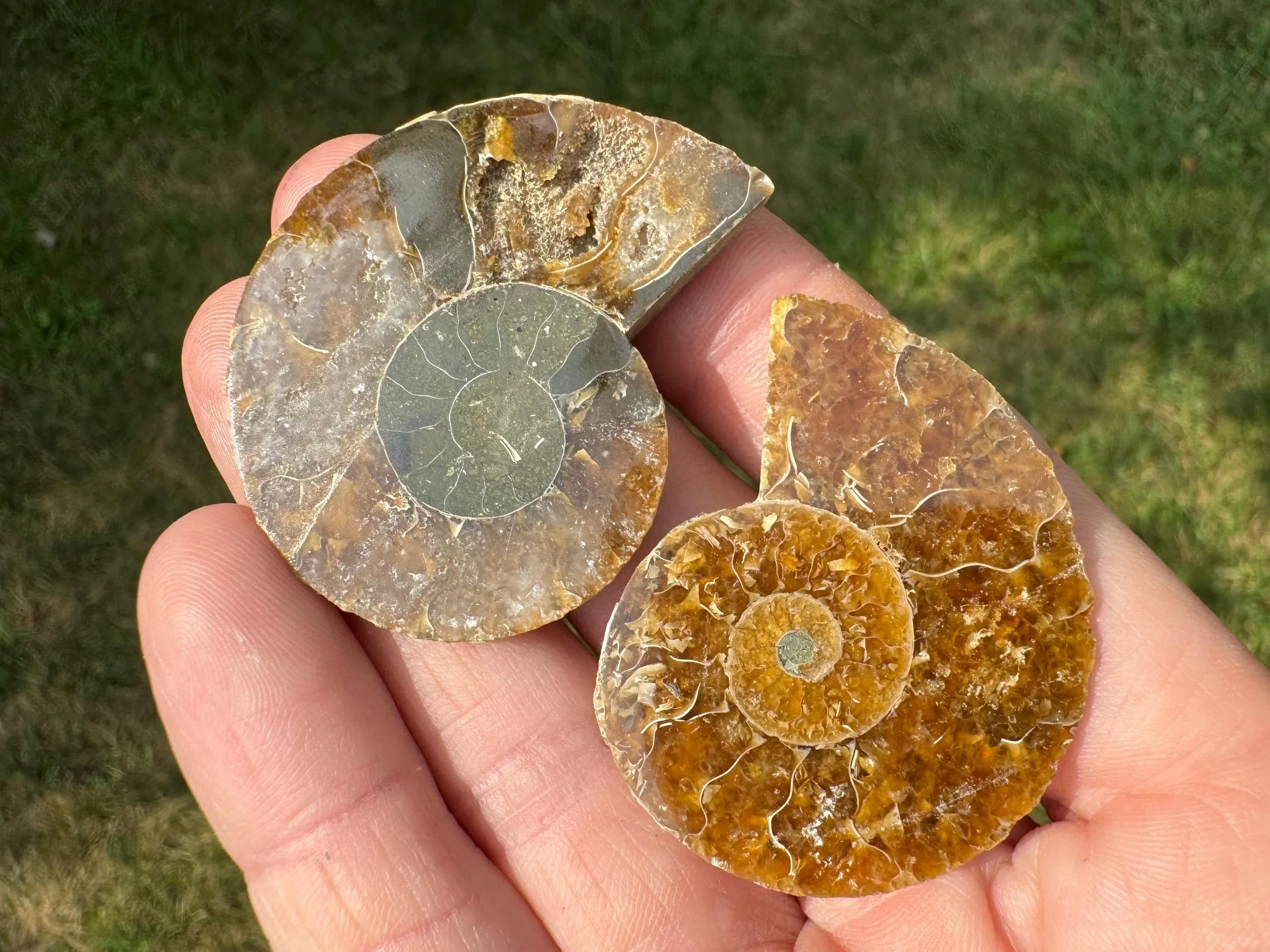 This is a lovely Ammonite fossil, a Desmoceras Ammonite from the Cretaceous period, from Madagascar, with golden Calcite including a druzy pocket of Calcite crystals. It is sliced and polished on the inside, giving you two matching pieces of the same fossil. On the outside you can see most of the iridescent rainbows.