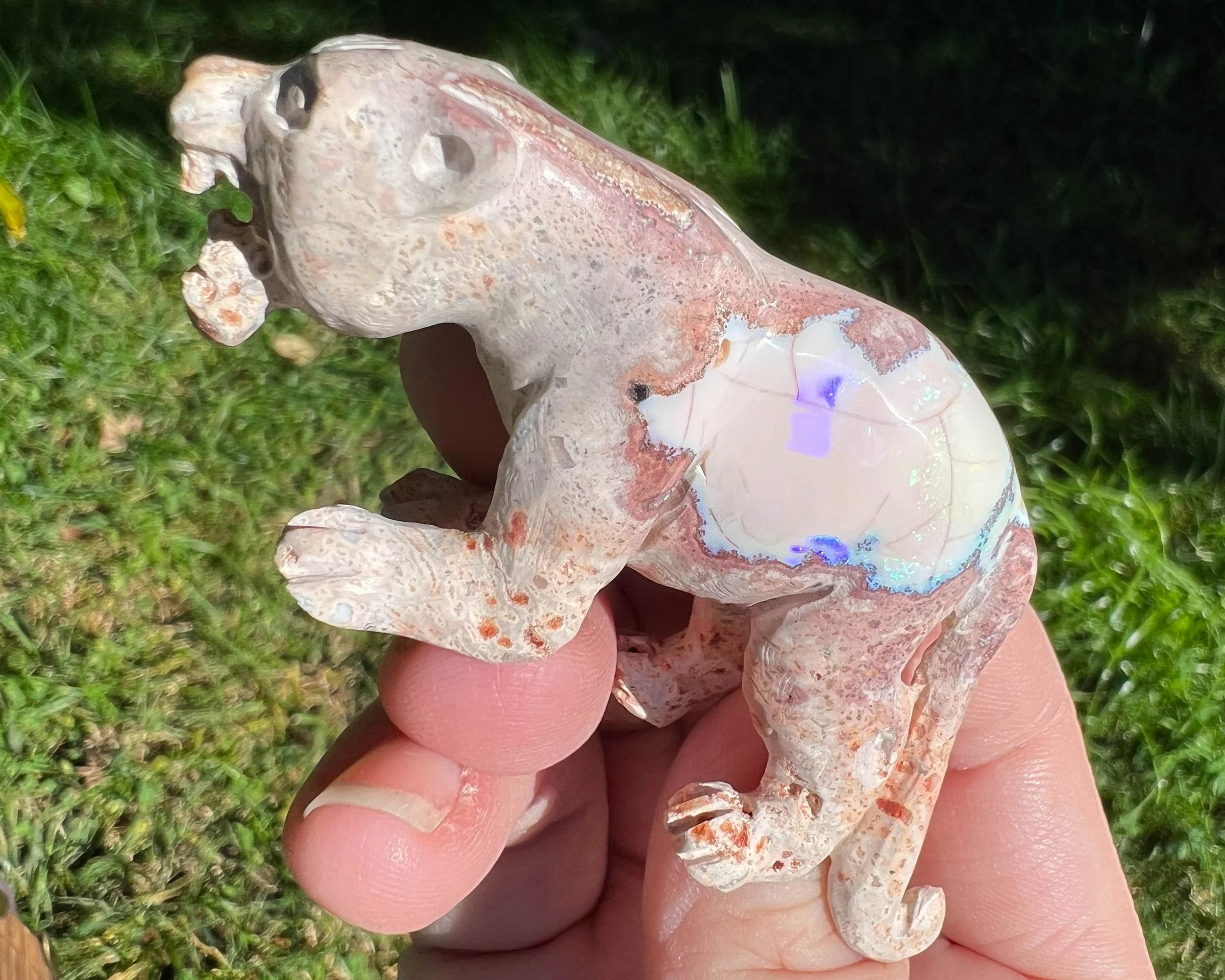 This is an opal carving of a jaguar, lioness, mountain lion, panther or cougar, made with flashy Mexican Opal in its' matrix. The opal is white with full rainbow flash especially purple blue and greens. The flash is really nice- much better than it seems in the photos. It is hand carved and one of a kind.