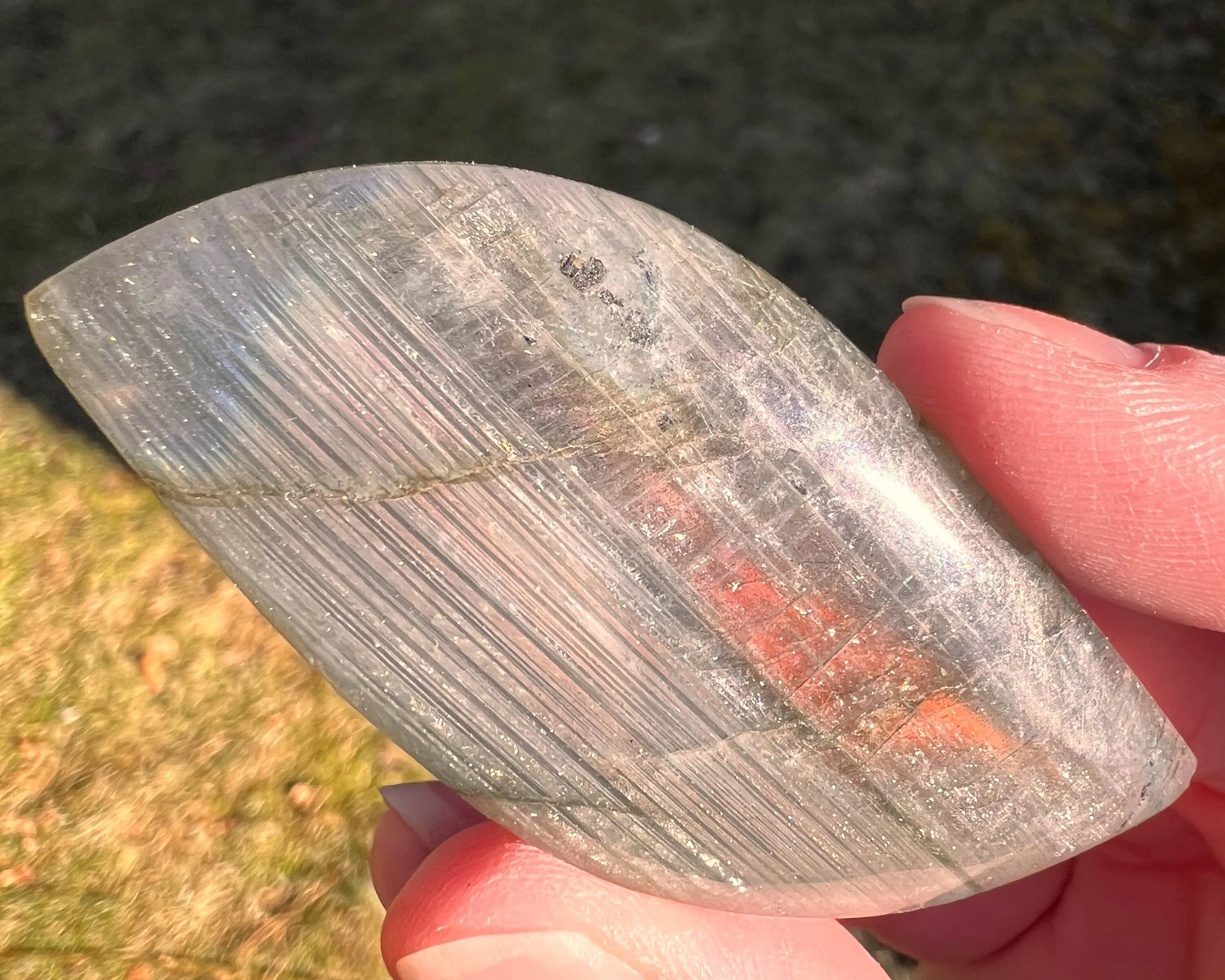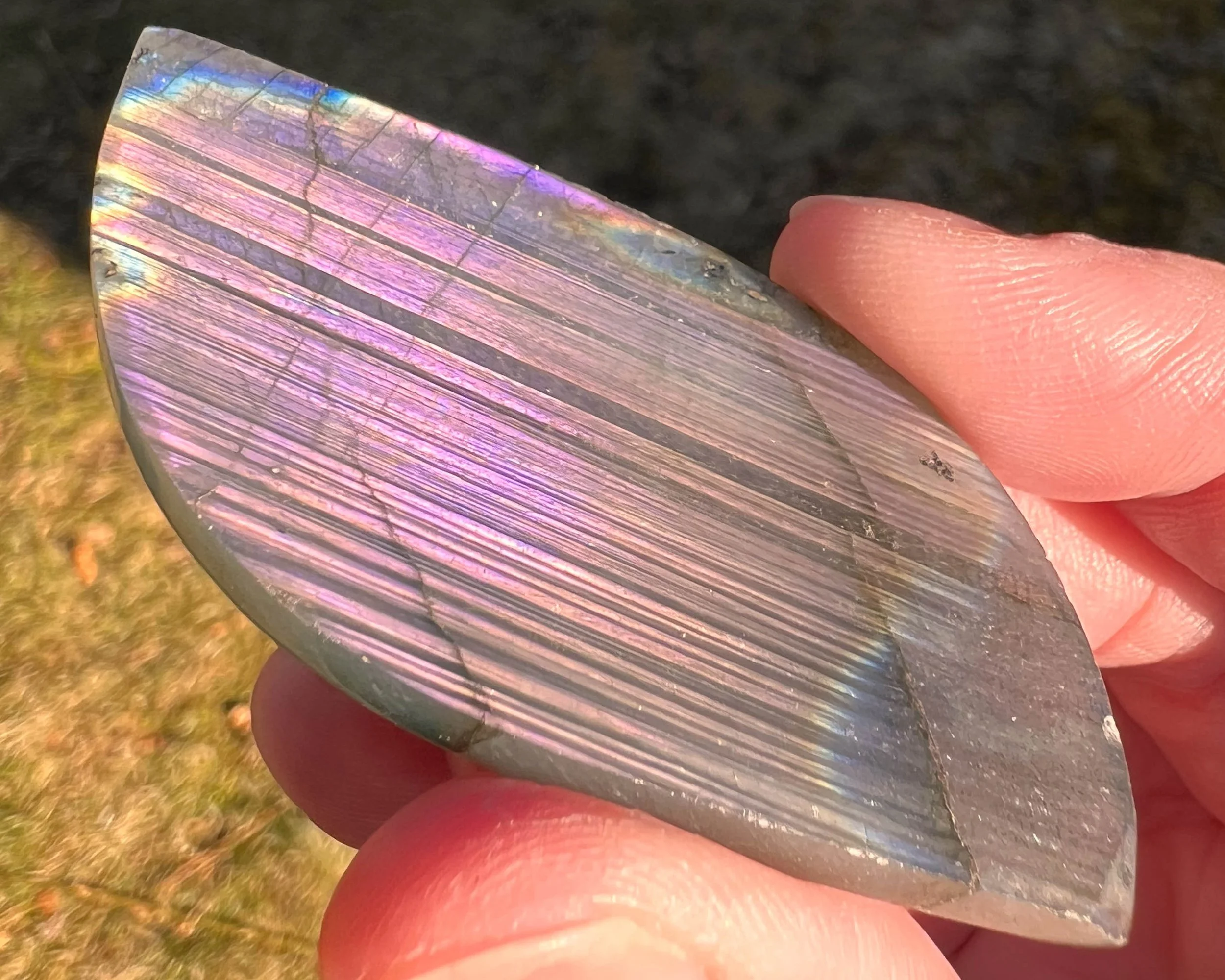 This is a freeform cut cabochon made of flashy Labradorite. It is a cabochon, with a flat back for setting in jewelry. It has beautiful bright purples, pink and blues and little bits of other colors too. Very flashy, has pinstriped flash to one side. Great size for a pendant or necklace.