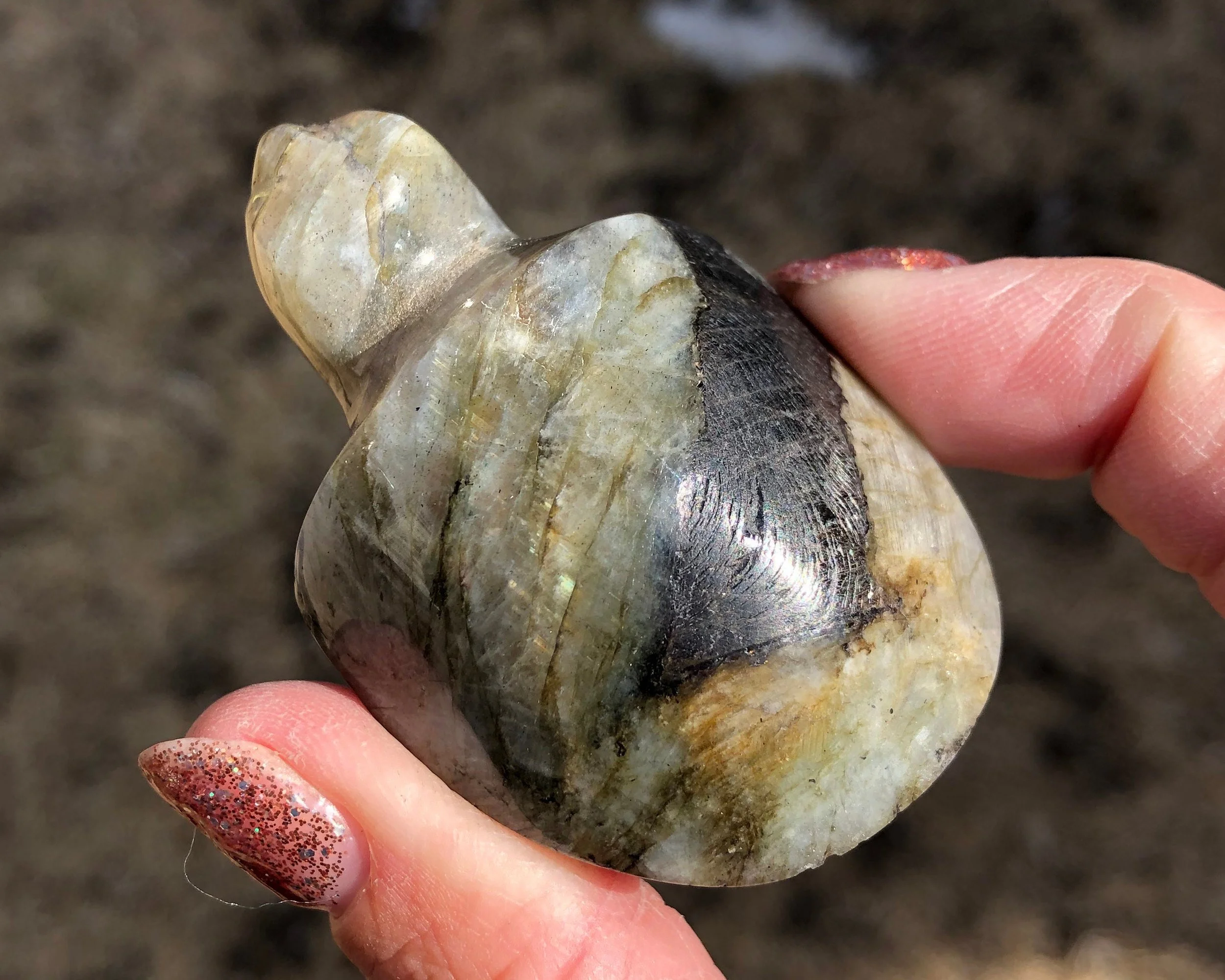 This is a lovely little turtle made of flashy, colorful labradorite with bright pink and orange flash! A very cute little carving with flash all over and a nice polish <3