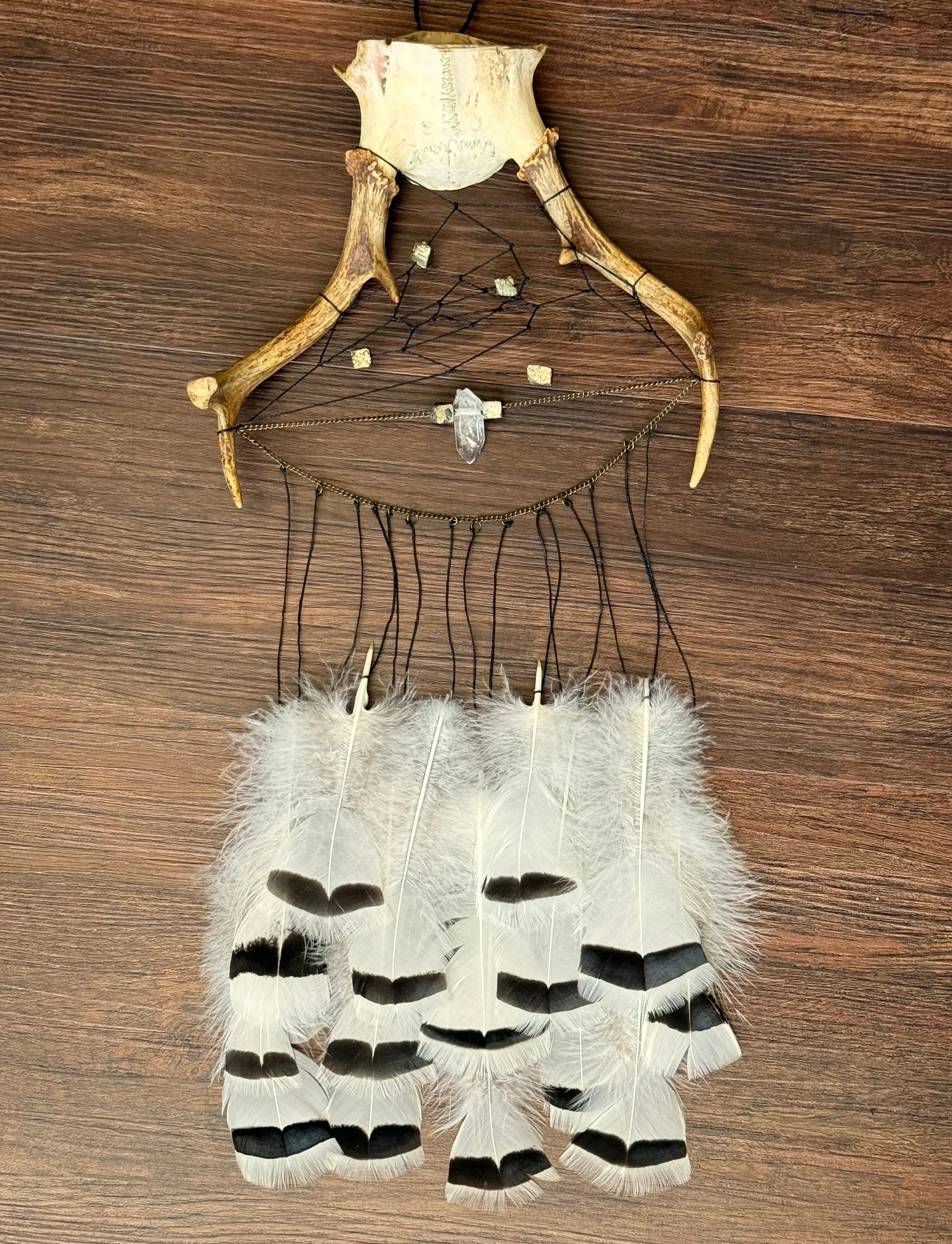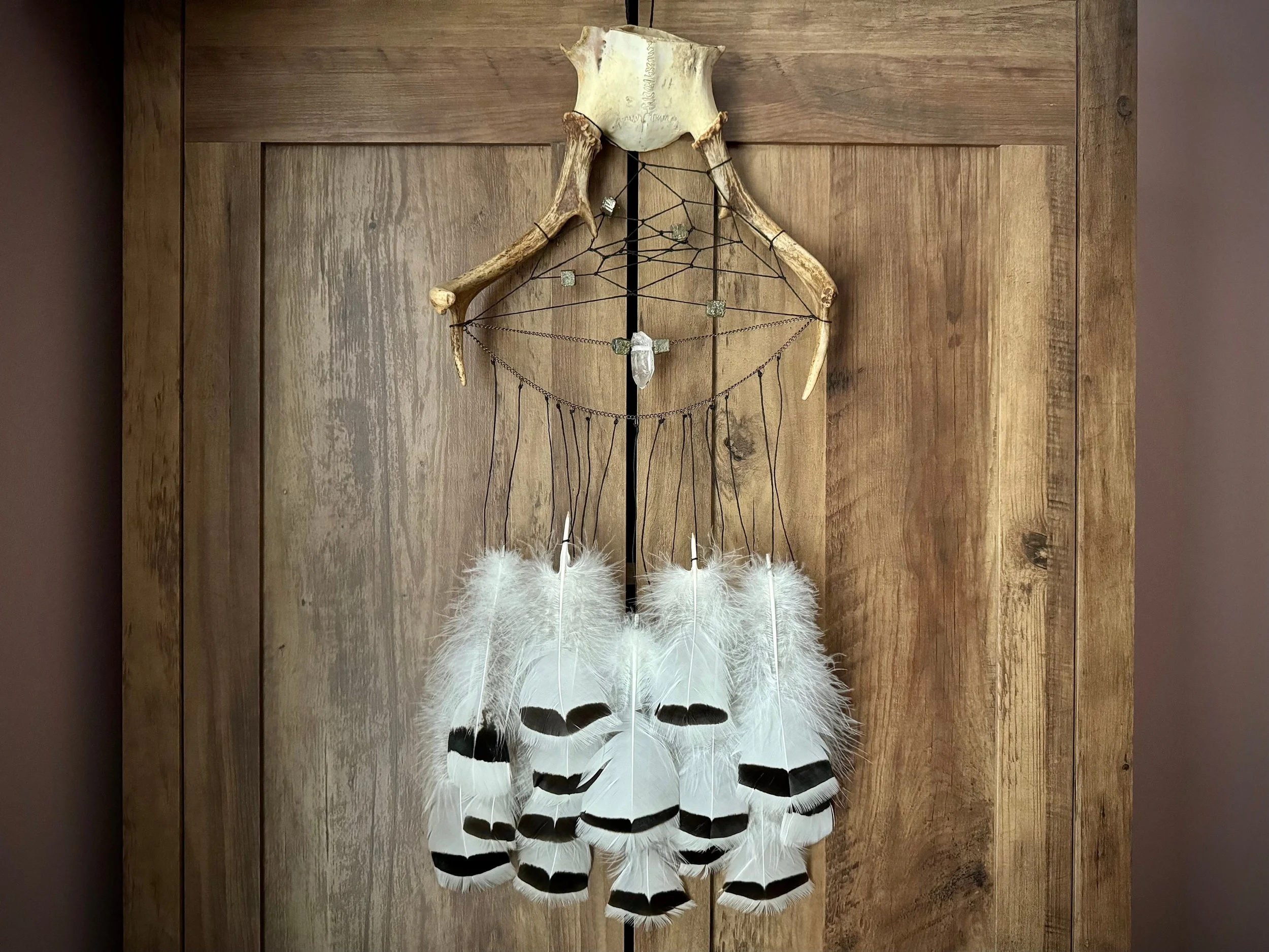 The feathers hang on a second chain at the bottom, they are white turkey feathers with black stripes that are slightly iridescent. They are collected ethically, they are cruelty free, natural feathers from free range birds. The antlers were either given to me or bought secondhand, I do not know in what way it was initially collected.