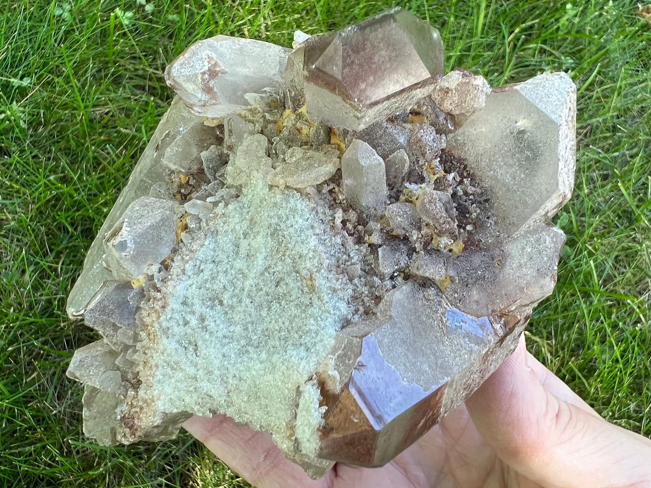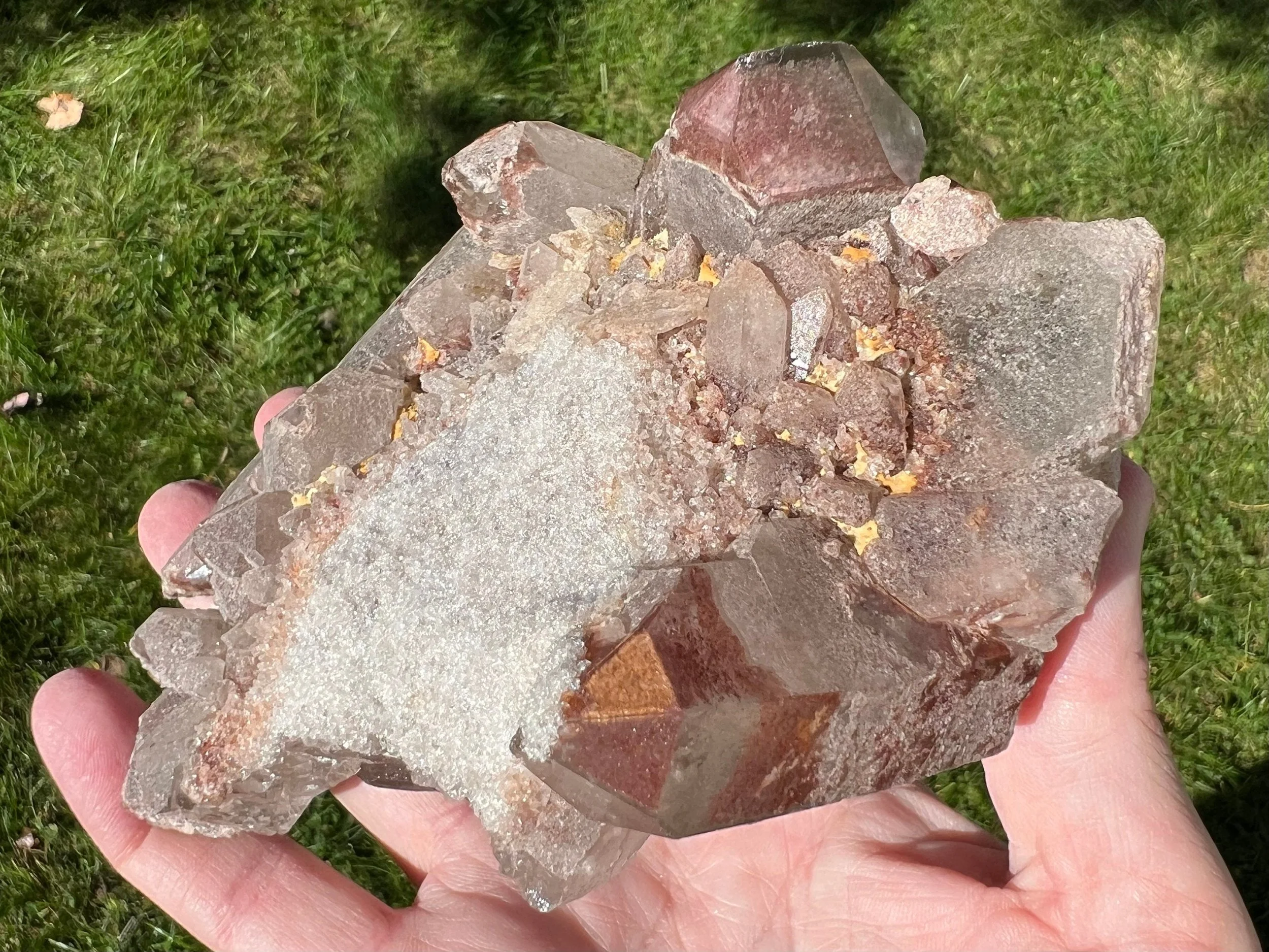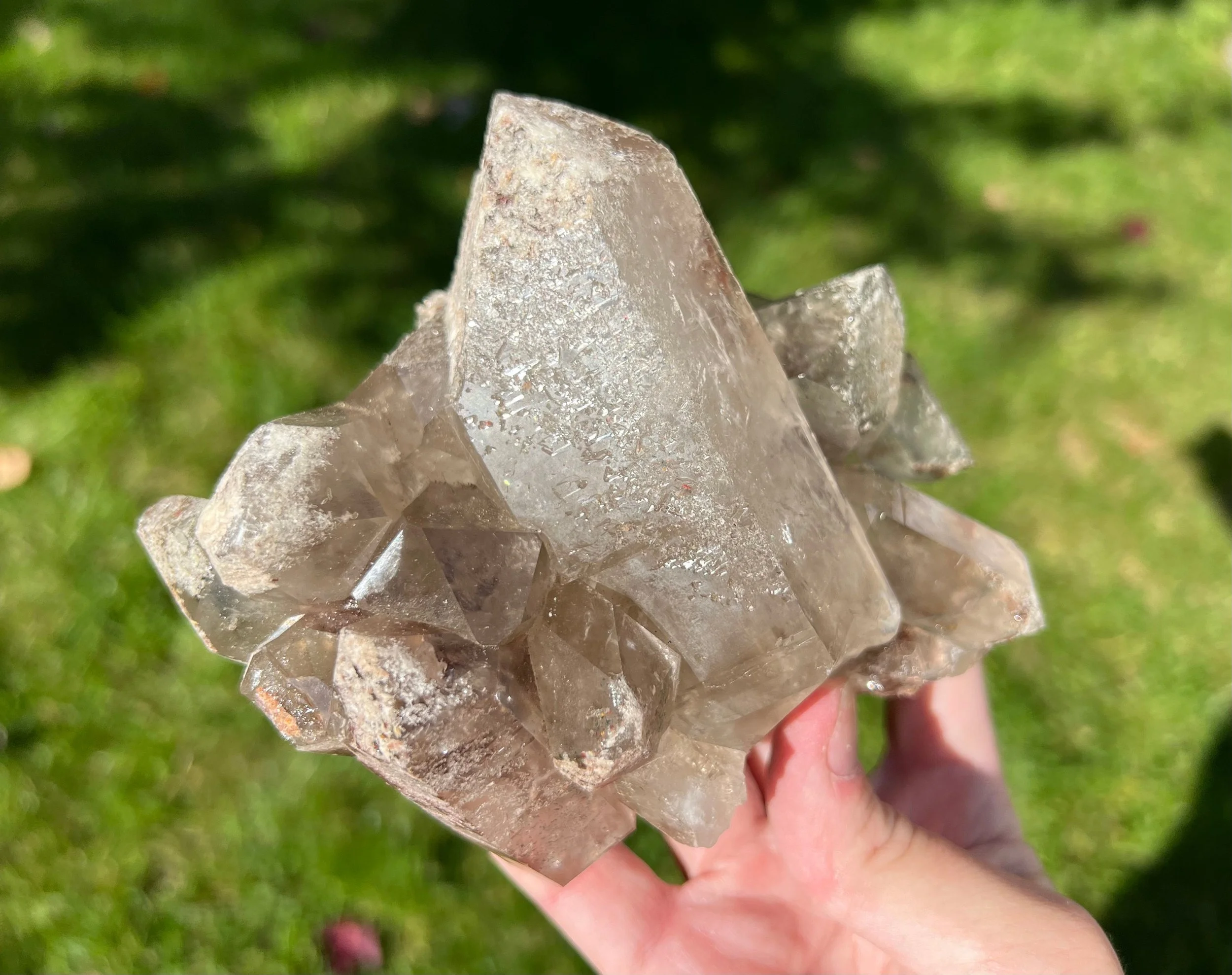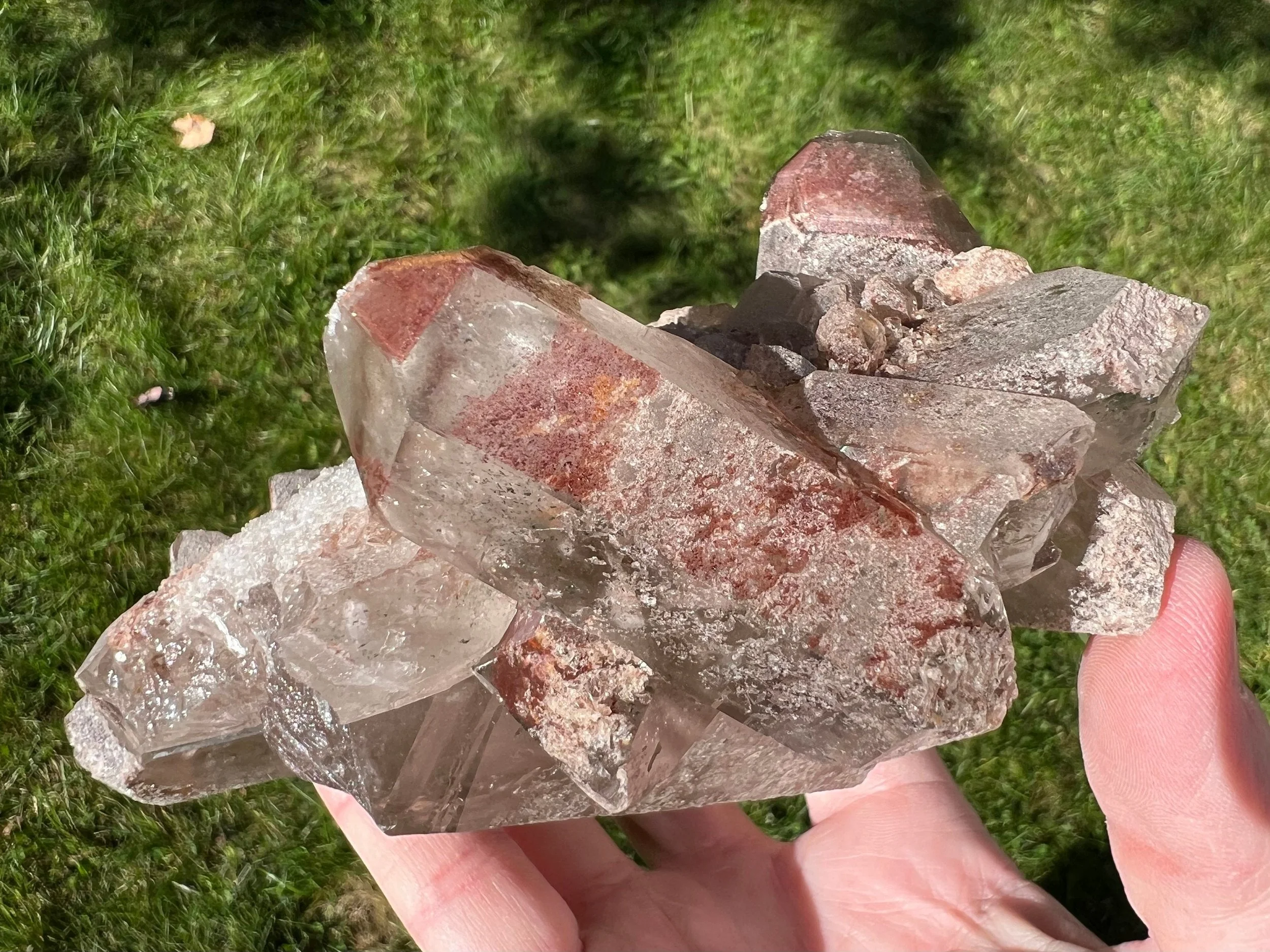 This is an awesome natural raw Smoky Quartz cluster with Lodolite, aka scenic inclusion Quartz from Brazil. It has deep pink red, green, white and yellow inclusions that look like fuzzy colorful moss frozen in glass. It has double terminated crystals, it has large crystals and smaller ones all the way down to druzy crystals, funky etching and even some little penetrator crystals sticking out of larger ones. It's so much better in person because a camera can't quite catch all the details. Very aesthetic cluster. So pretty! :D